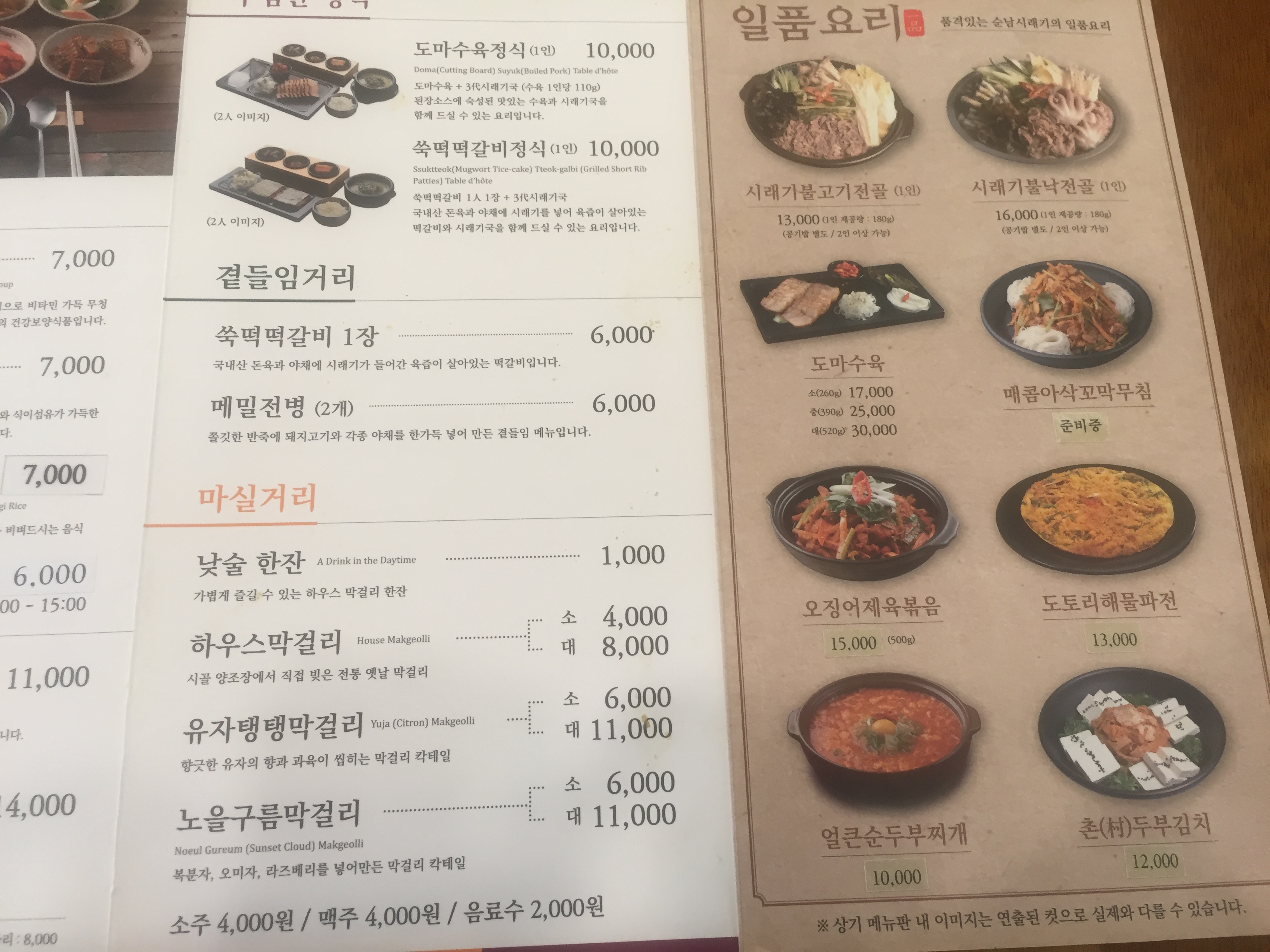 파전, 제육볶음 등 시래기가 포함되지 않은 메뉴도 있고 다양한 막걸리도 있으며 한 잔 단위로 팔기도 한다.