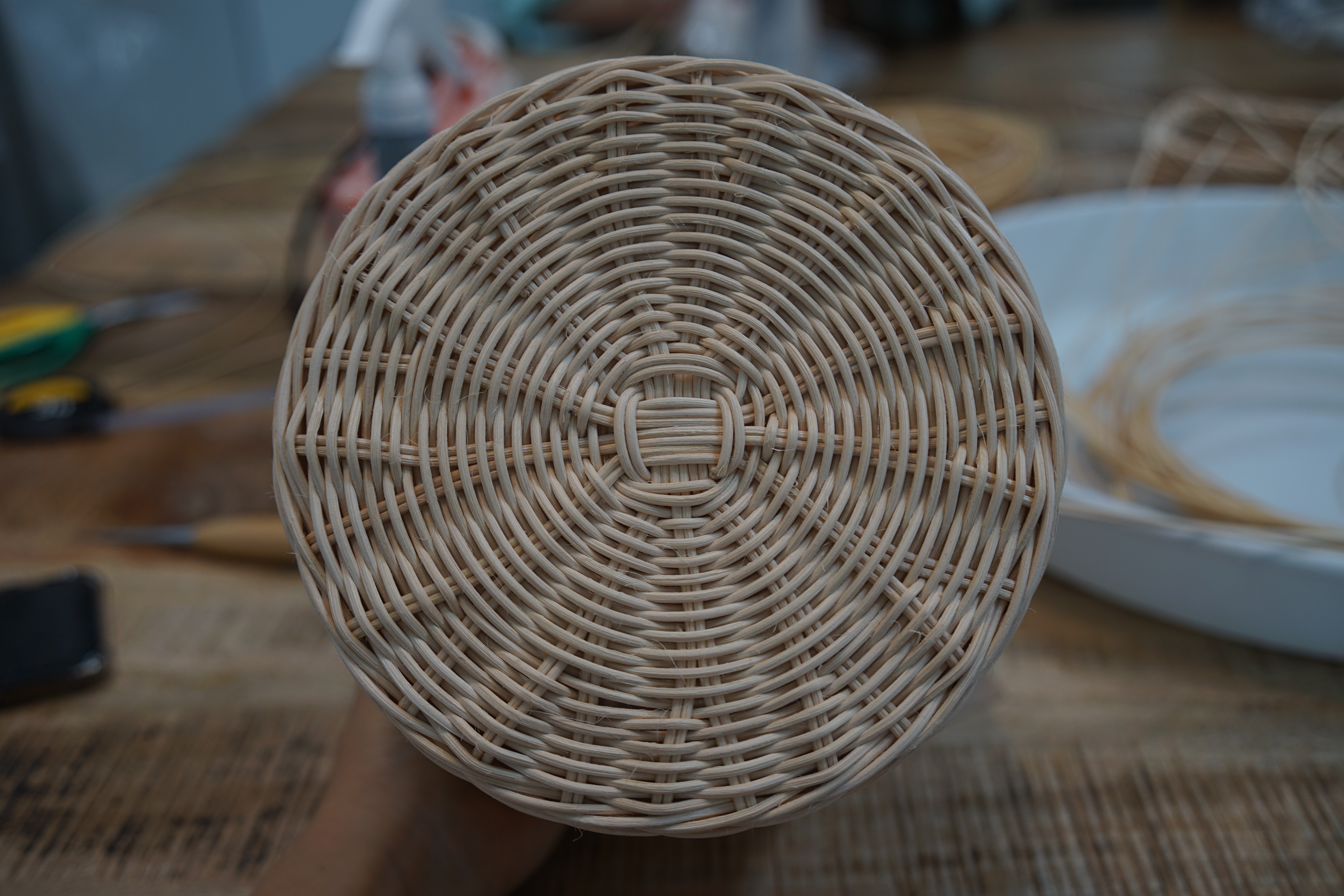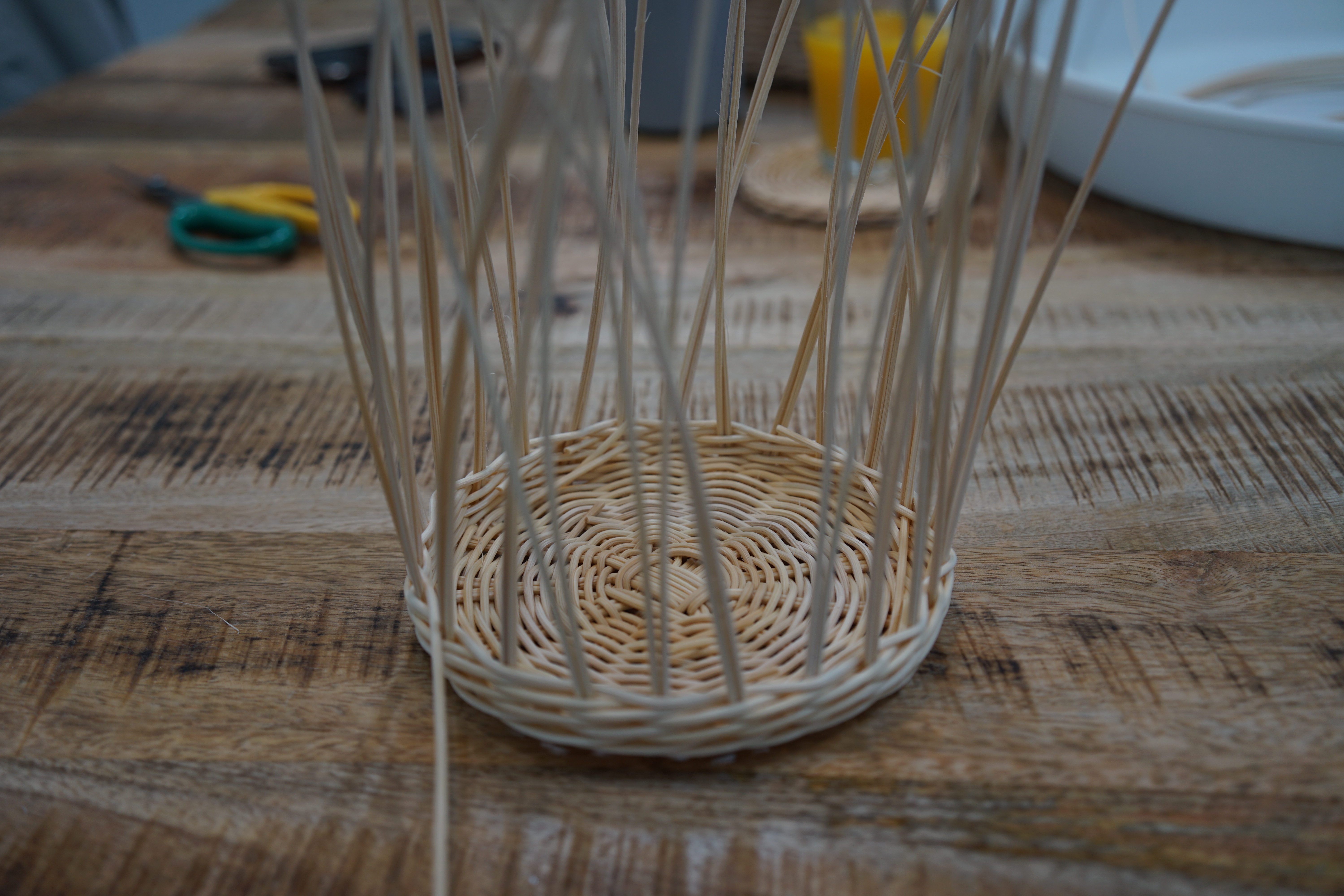 지름 12cm의 밑면을 완성하니 선생님께서 또 밑면의 마무리를 해주시고, 기둥이 될 부분을 세워 주셨다. 나는 또다시 라탄을 돌려가며 안쪽, 바깥쪽으로 엮기만 하면 되었다.