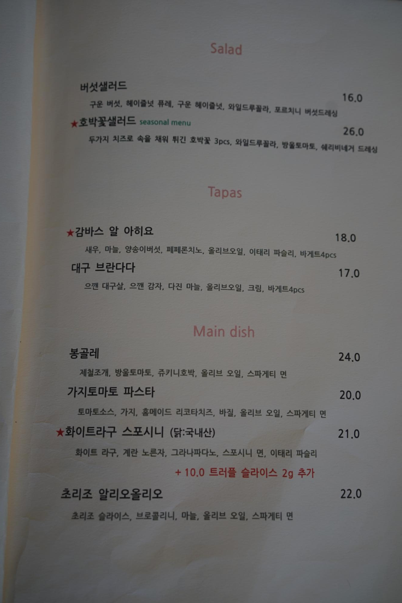 부산 수영, 센텀 맛집 리오네 레스토랑의 메뉴와 가격. 리오네에서 버섯 샐러드를 먹어본 친구가 꼭 먹고 싶다고 해서 버섯 샐러드를 주문했다. 그리고 토마토 파스타가 먹고 싶어 가지 토마토 파스타도 함께 주문했다.