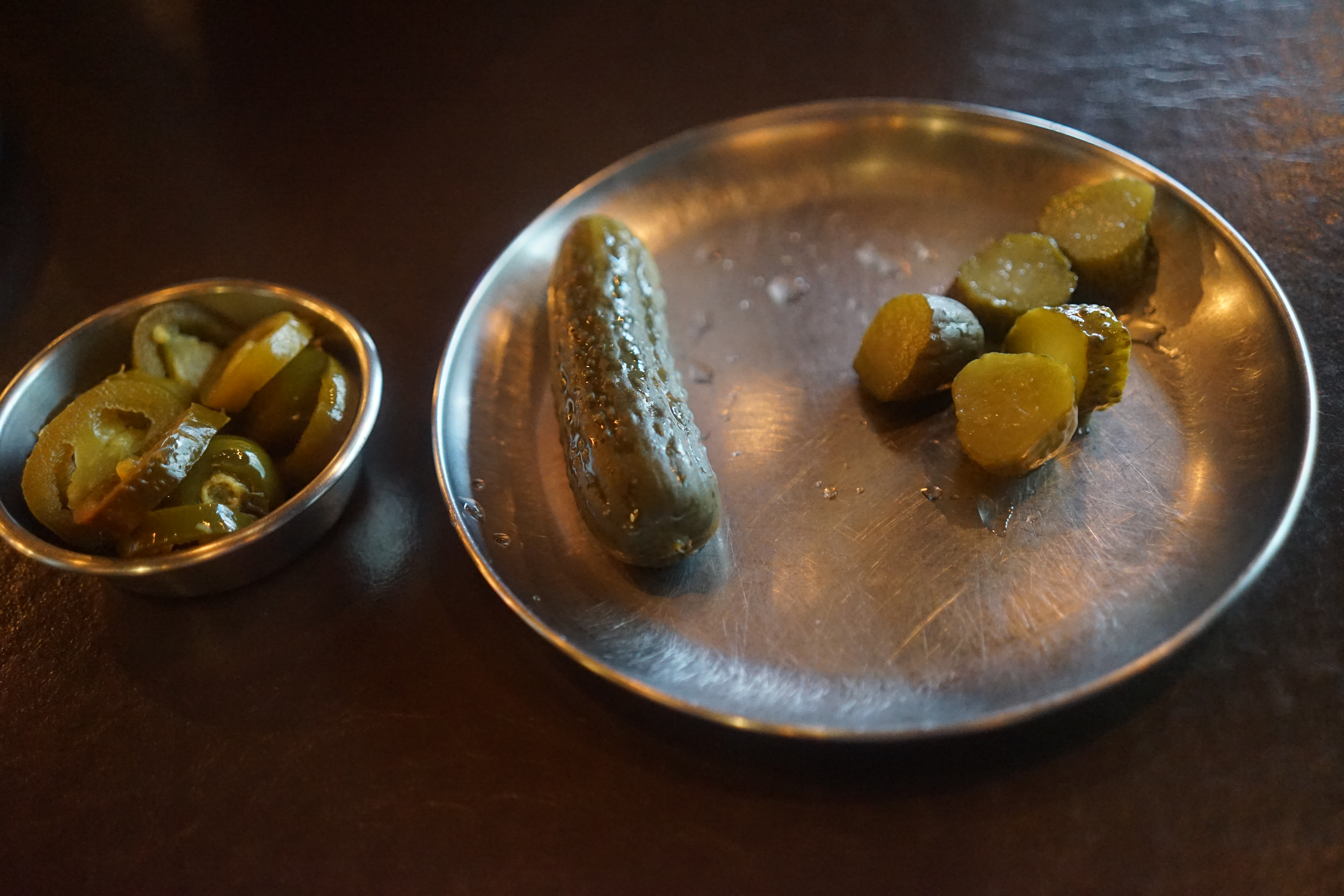 피클과 할라피뇨는 셀프로 가져다 먹어야 하는데, 이곳 피클의 특이한 점은 통으로 제공되어서 썰어 먹어야 한다는 점이었다.