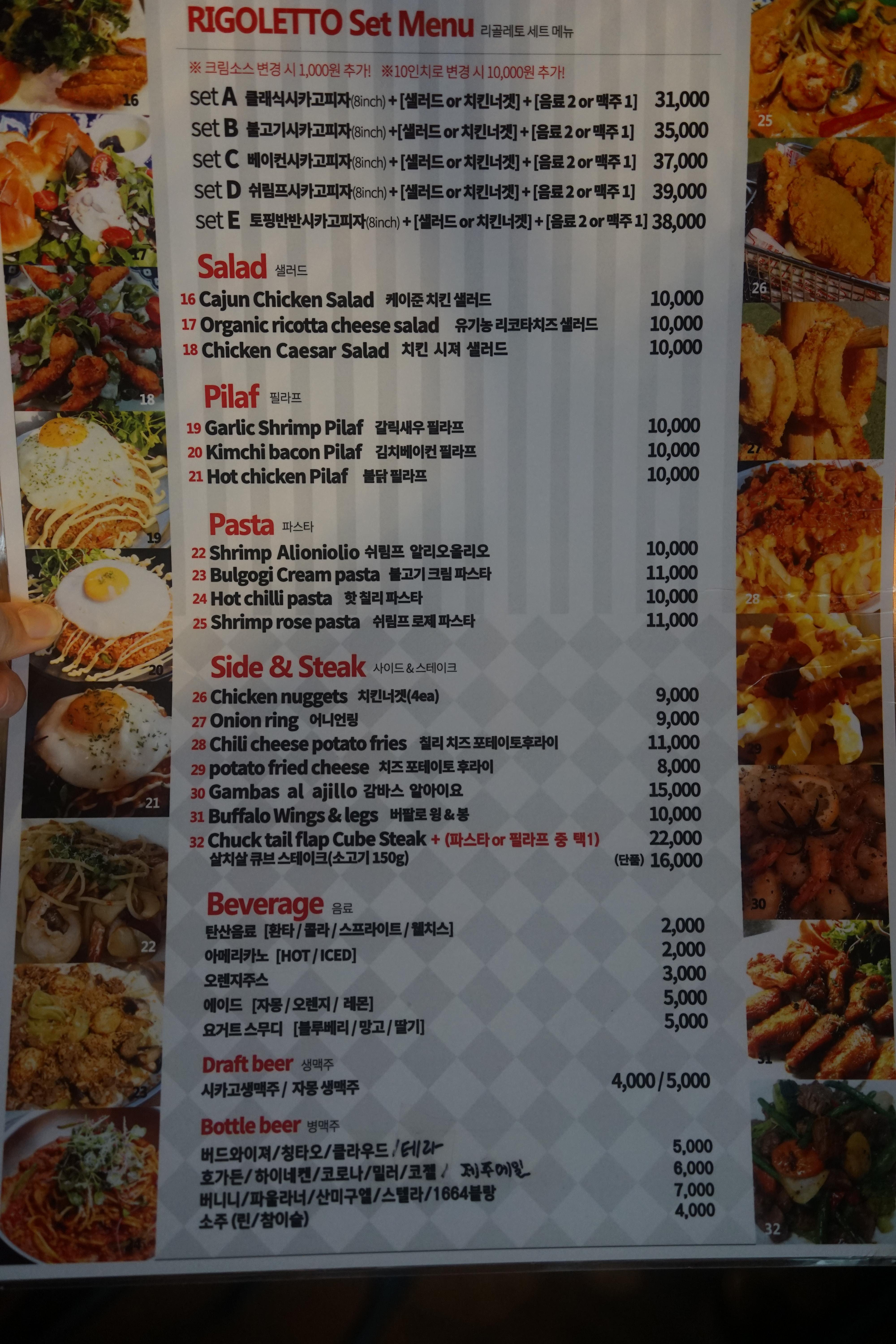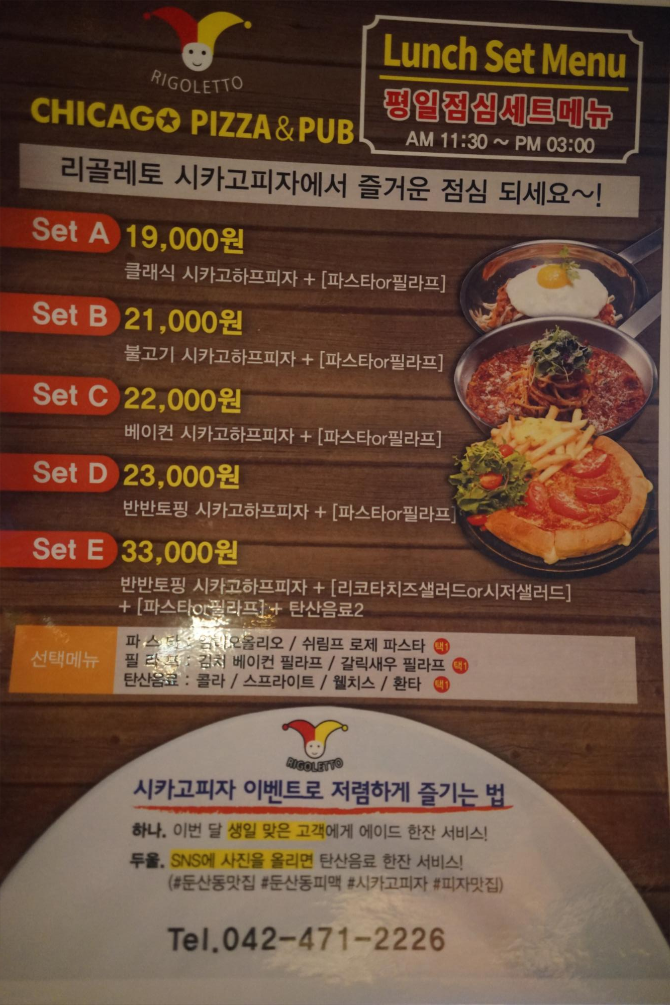 리골레토 시카고 피자 대전시청점의 메뉴와 가격은 위의 사진과 같다. 평일 점심시간에 방문하지 않았다면 맨 위의 세트 메뉴를 주문해 먹으려고 하였으나, 평일 점심 세트가 가능한 시간이라 점심 세트 메뉴를 부탁드렸다. 평일 세트 메뉴판은 테이블 위에 있지 않고 말씀드려야 갖다 주신다.