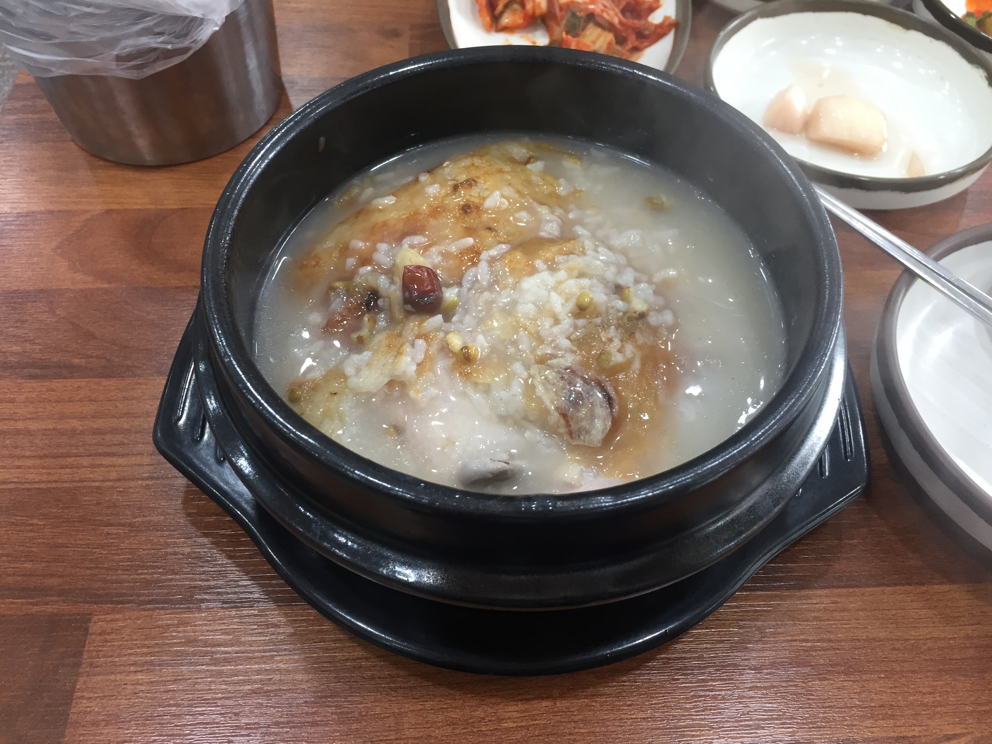 남의 떡이 더 커 보인다고 오빠 뚝배기에 담긴 누룽지 삼계탕이 더 맛있어 보였다. 위에는 약간 눌은 누룽지에 가까운 죽이 있고 밑에는 작은 닭 한 마리가 들어있다. 사실 누룽지 말고는 다른 내용물은 그리 실하진 않았다. 그래도 나름 무난했고, 복날이라 늦은 오후 식사하기 애매한 시간임에도 불구하고 사람들이 많이 들렀다. 코로나 여파가 있어서 그런지 매장 내에서 먹고 가는 손님보다 방문 포장 손님이 더 많았다.