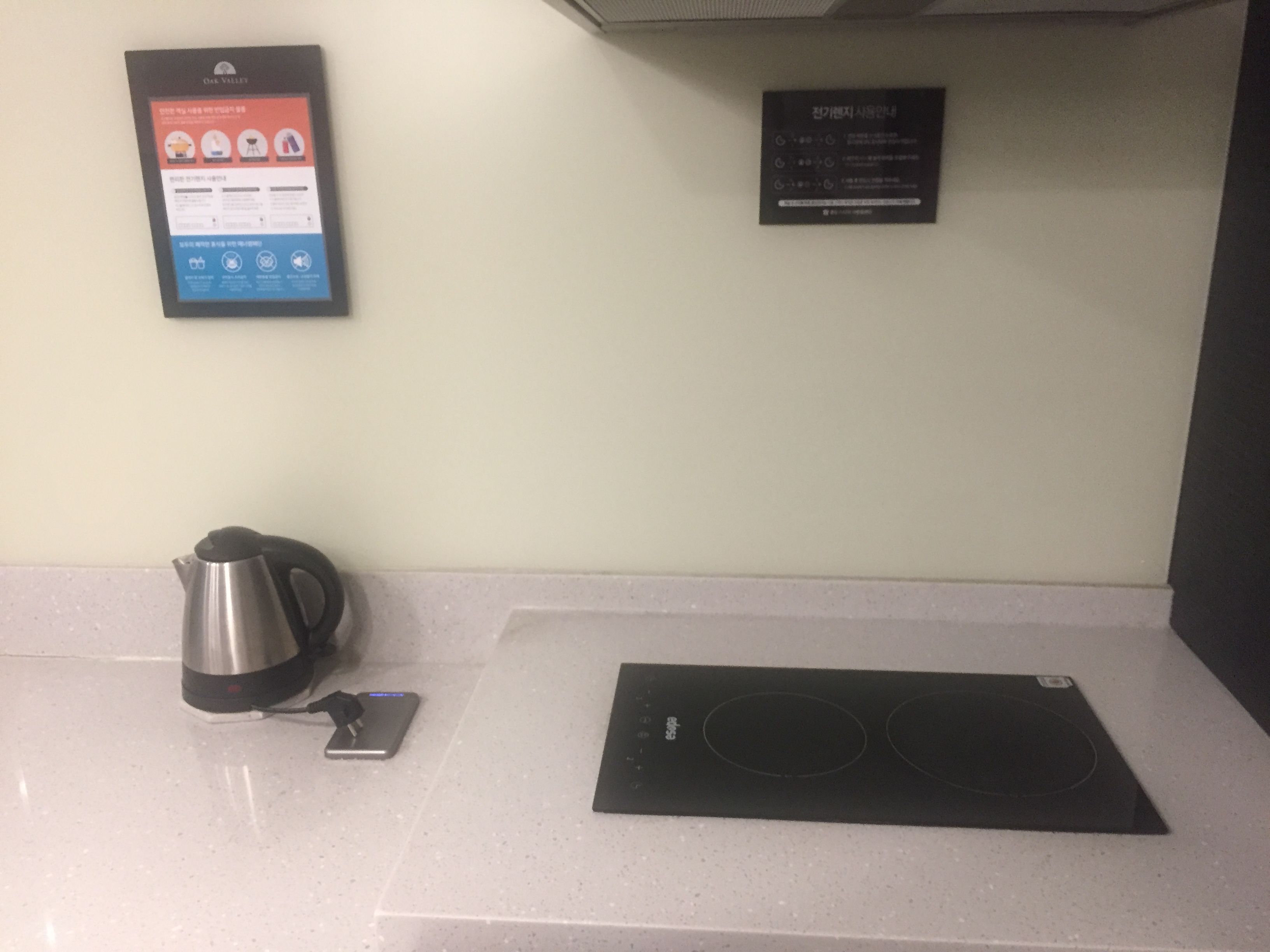 인덕션도 있고 인덕션 옆에 콘센트 두개도 설치되어 있어 전기포트를 사용하기에 편리했다.