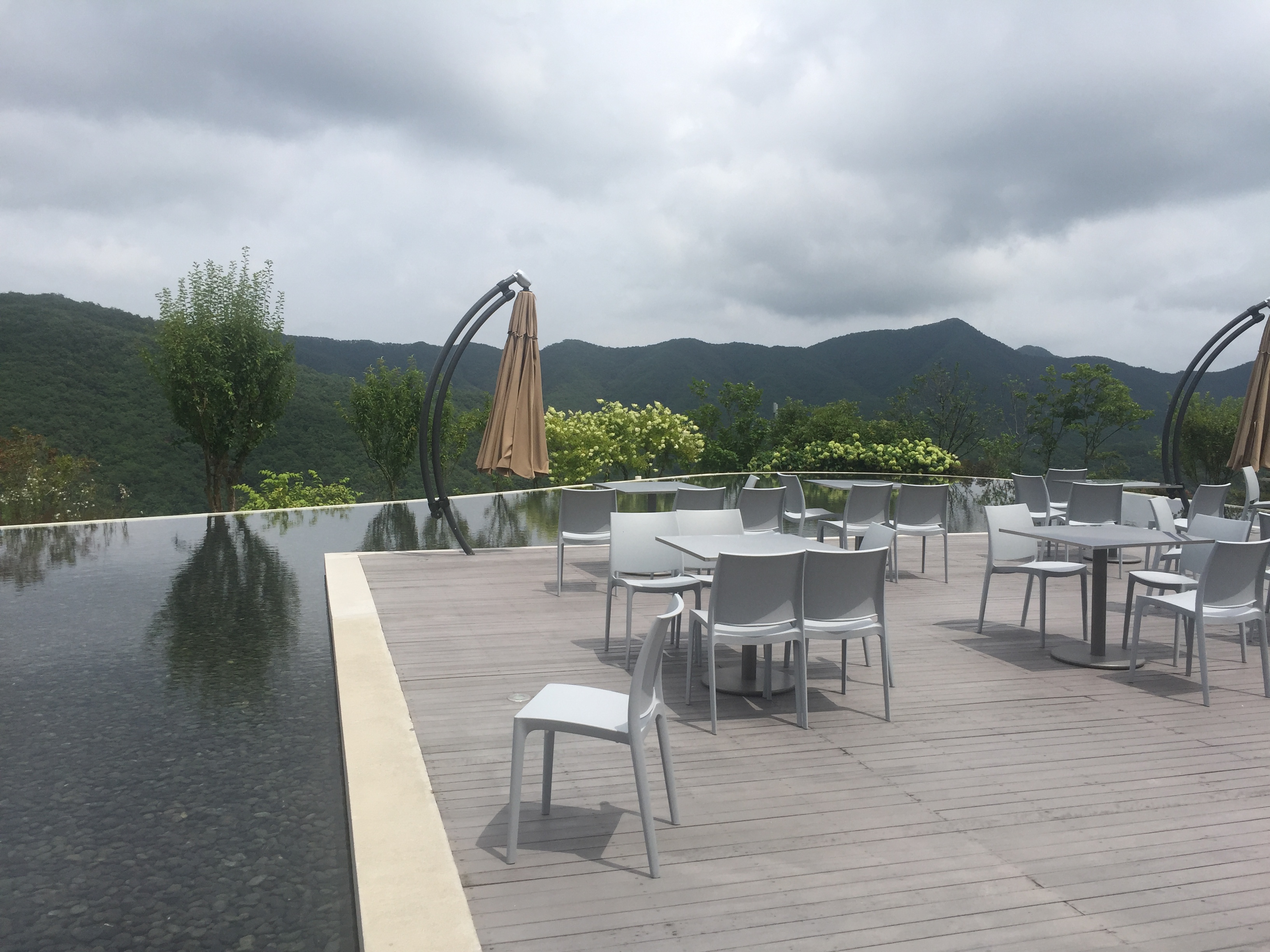 뮤지엄 산의 카페 테라스. 파라솔이 펼쳐진 것이 더 예쁠 것 같은데 왜인지 접혀 있었다. 보통 인스타 등 SNS에서 뮤지엄 산 카페의 이 테라스 사진을 많이 올린다. 주변 산의 경치와 어우러져 사람들이 좋아할 만한 풍경이다.