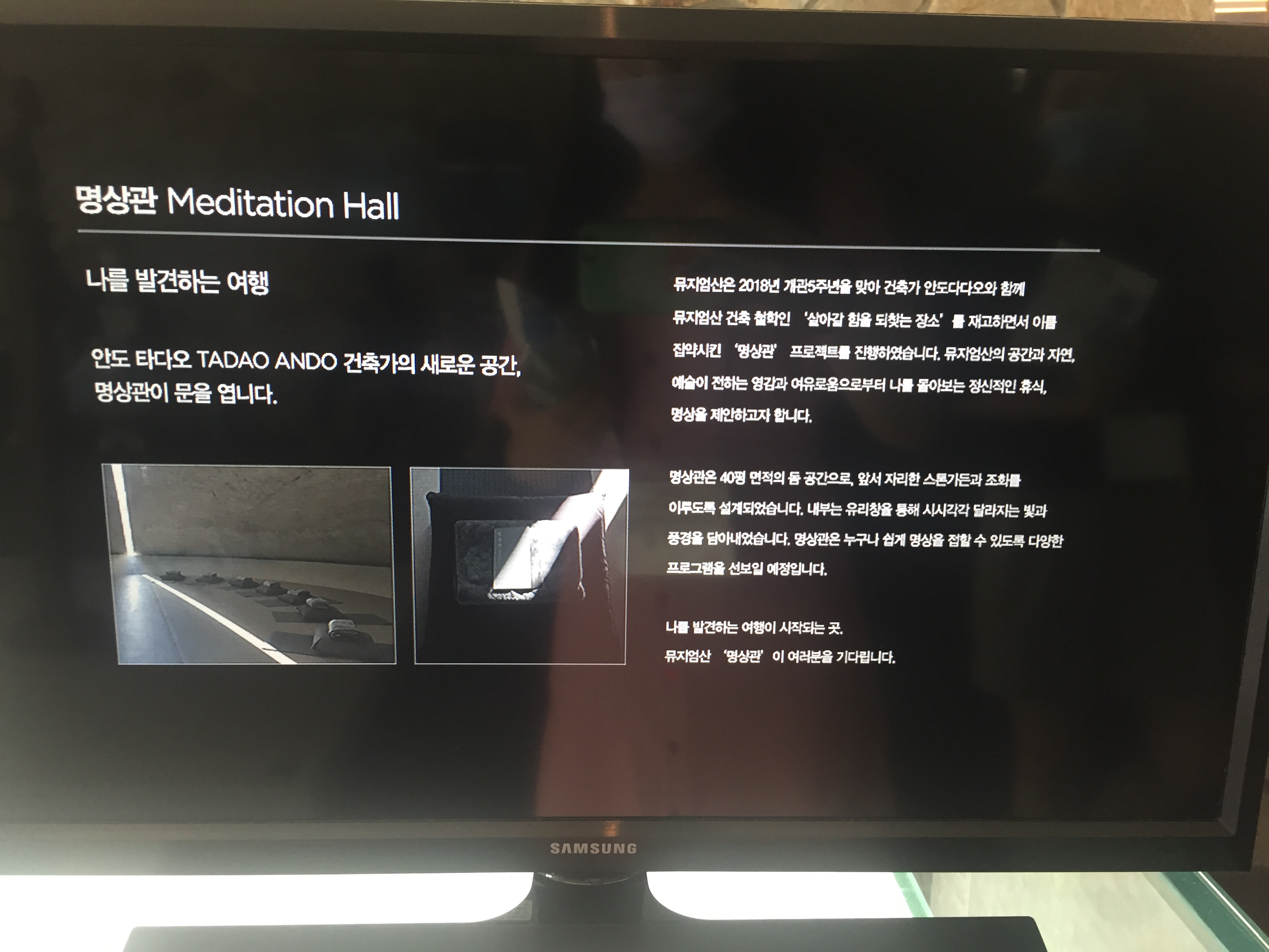 우리는 13:15에 시작되는 쉼 명상을 하기로 했다. 오빠와 다시 뮤지엄 산에 방문한다면 싱잉 볼 명상을 할 계획이다. 다니는 요가원에서 싱잉 볼 명상 요가를 하는데 온 몸에 진동이 느껴지고 치유가 되는 느낌이라 오빠와 꼭 공유해보고 싶은 마음이다.