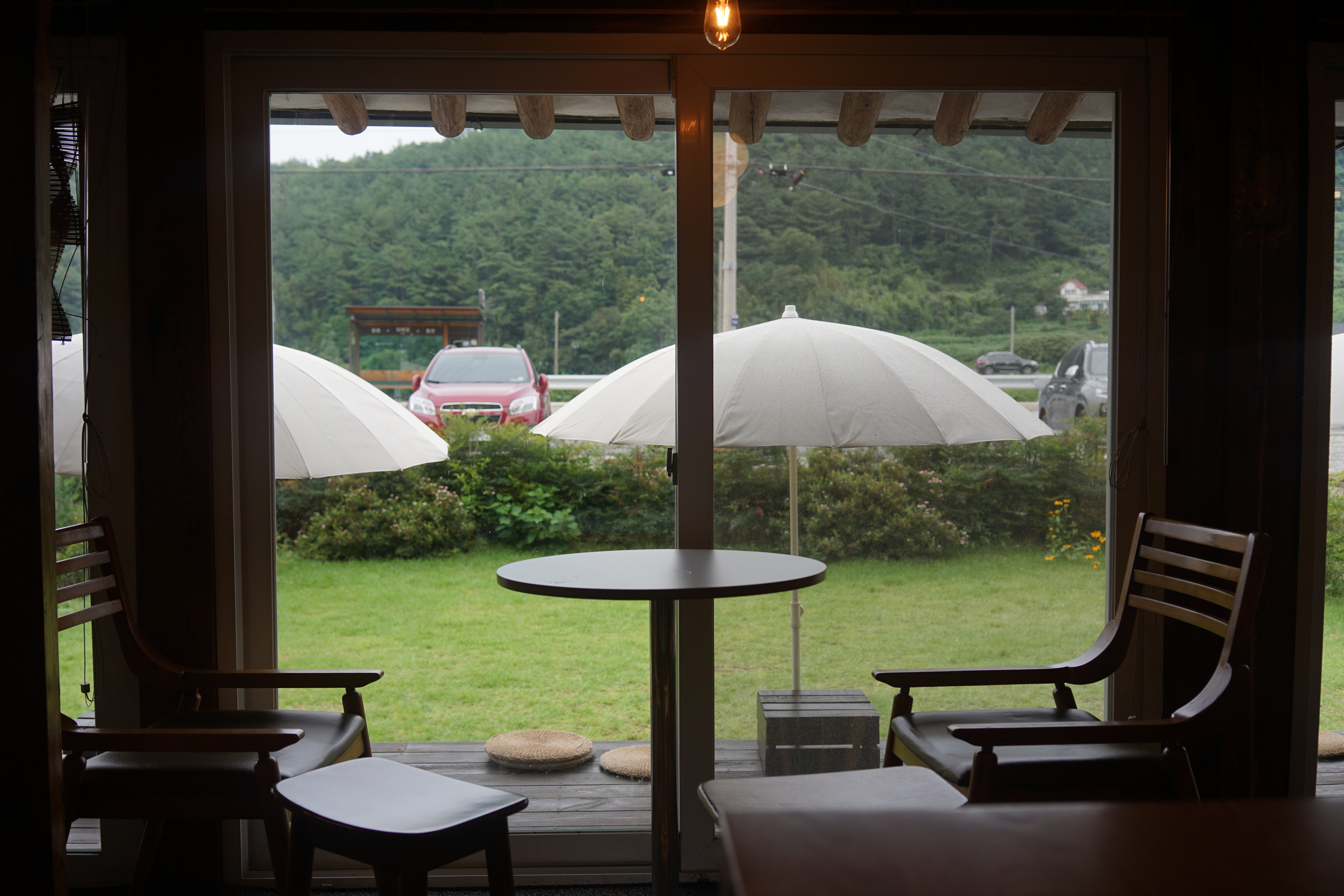 툇마루에도 파라솔과 함께 작은 테이블과 방석이 있어 마당을 보며 앉기에도 좋아 보였다. 이 날은 많이 더웠다기보단 흐리고 꿉꿉한 날씨라 내부에 들어가기로 했다. 도착했을 때만 해도 만석이라 바깥에 나가야 하나 했는데 다행히도 4인 테이블의 자리가 금방 비워졌다.