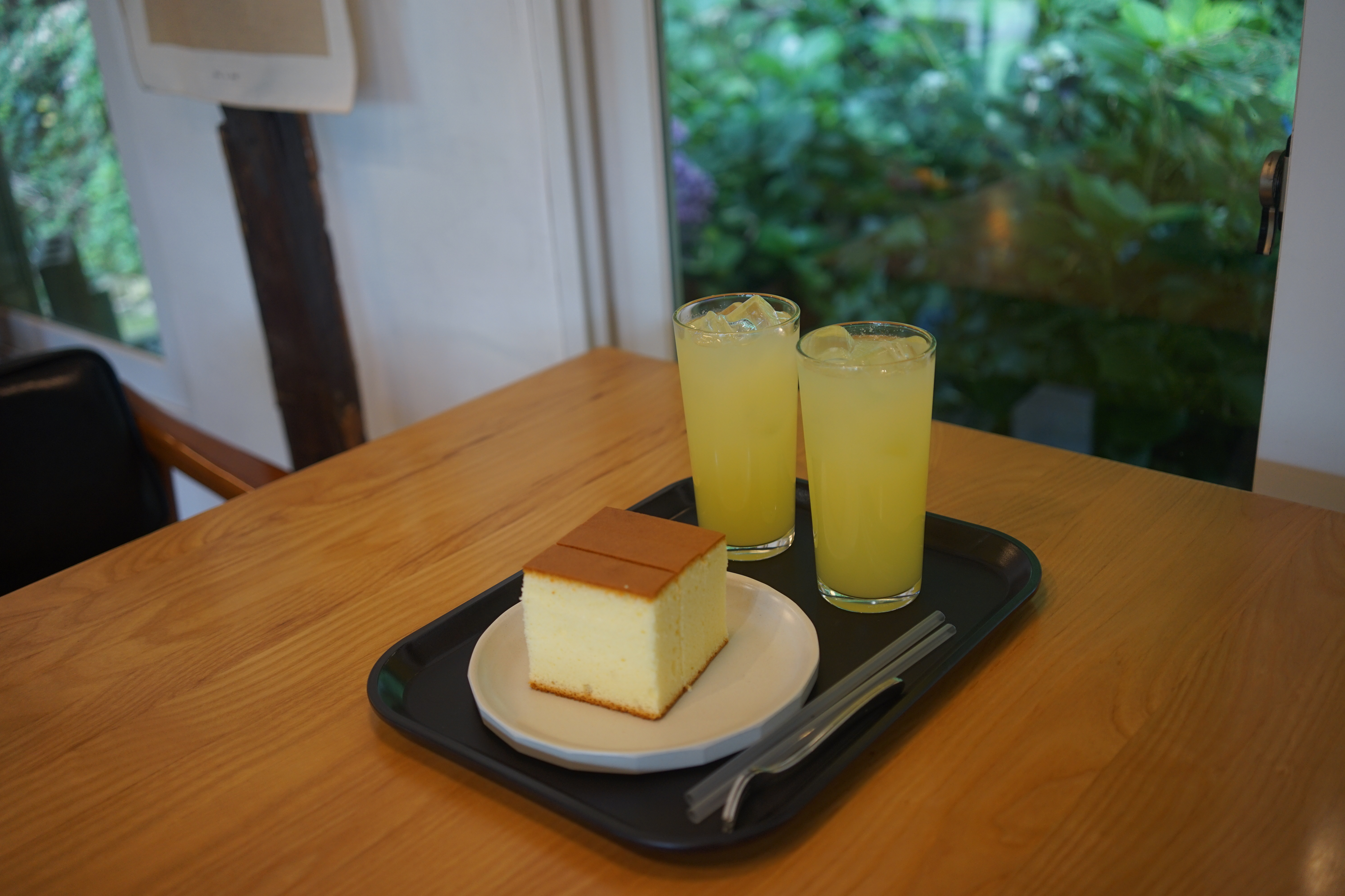 운 좋게 자리 잡은 카페 유자의 4인 테이블. 마침 창가 근처의 뒤뜰의 수국과 수풀이 보였다. 넓은 창가와 함께 전경이 예쁜 카페는 마음을 여유롭게 한다.