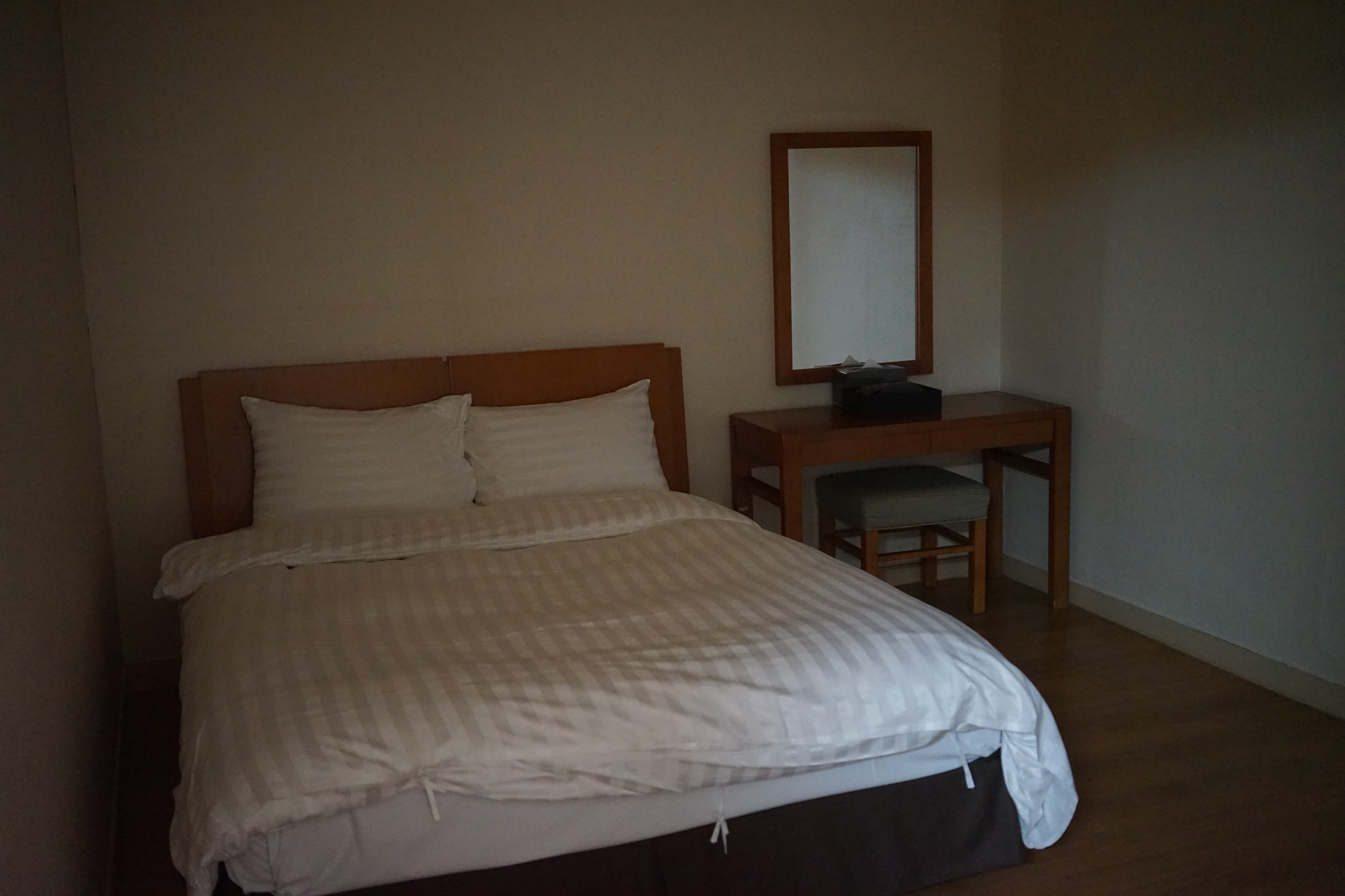 침대가 있는 안방인데 에어컨도 선풍기도 없었다. 화장대도 보이는 것이 전부이고 옛날식으로 지어진 리조트라 그런지 콘센트도 너무 부족했다. 침대가 있는 안방은 아빠만 쓰고 엄마, 언니와 나는 거실에서 벽걸이 에어컨을 틀고 잤다. 벽걸이형 에어컨이라 안방까지 시원해지지 않아 더위를 쉬이 타지 않는 아빠도 잘 때 더웠다고 했다. 게다가 엘리베이터 바로 옆 방이라 그런지 사람들 오가는 소음도 컸고, 엘리베이터 오르내리는 소리인지 계속 딱딱거리는 소리가 나서 잘 때 거슬렸다.