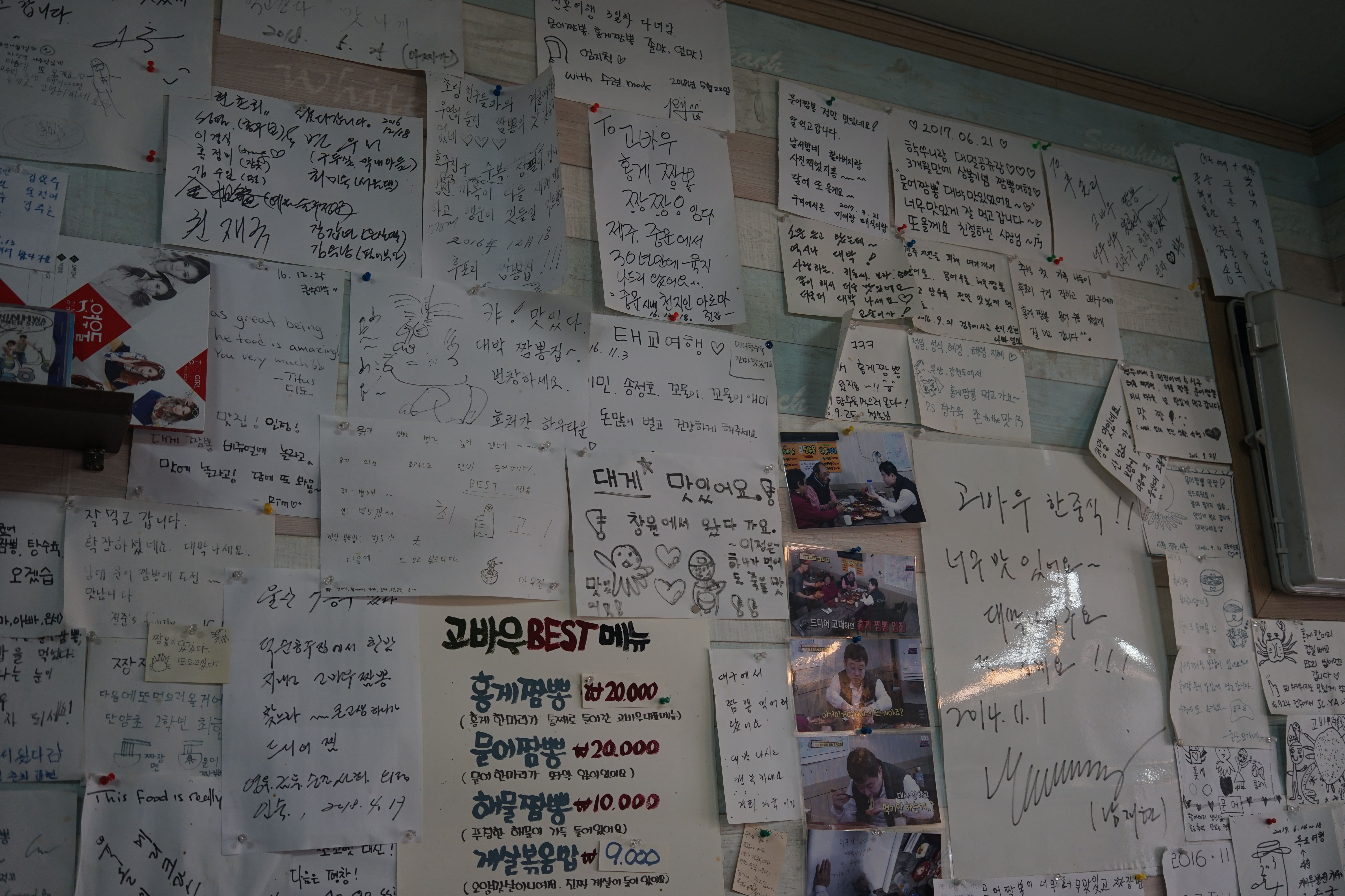 손님들이 남기고 간 메모들이 벽에 가득 붙어있던 고바우 한중식. 그중에서도 단연 눈에 띄는 메모는 신혼여행 와서 맛있게 먹었다는 메모였다. 슬펐다. 내년 나의 모습이 되는 걸까. 신혼여행만큼은 해외로 가고 싶은데 욕심일까.