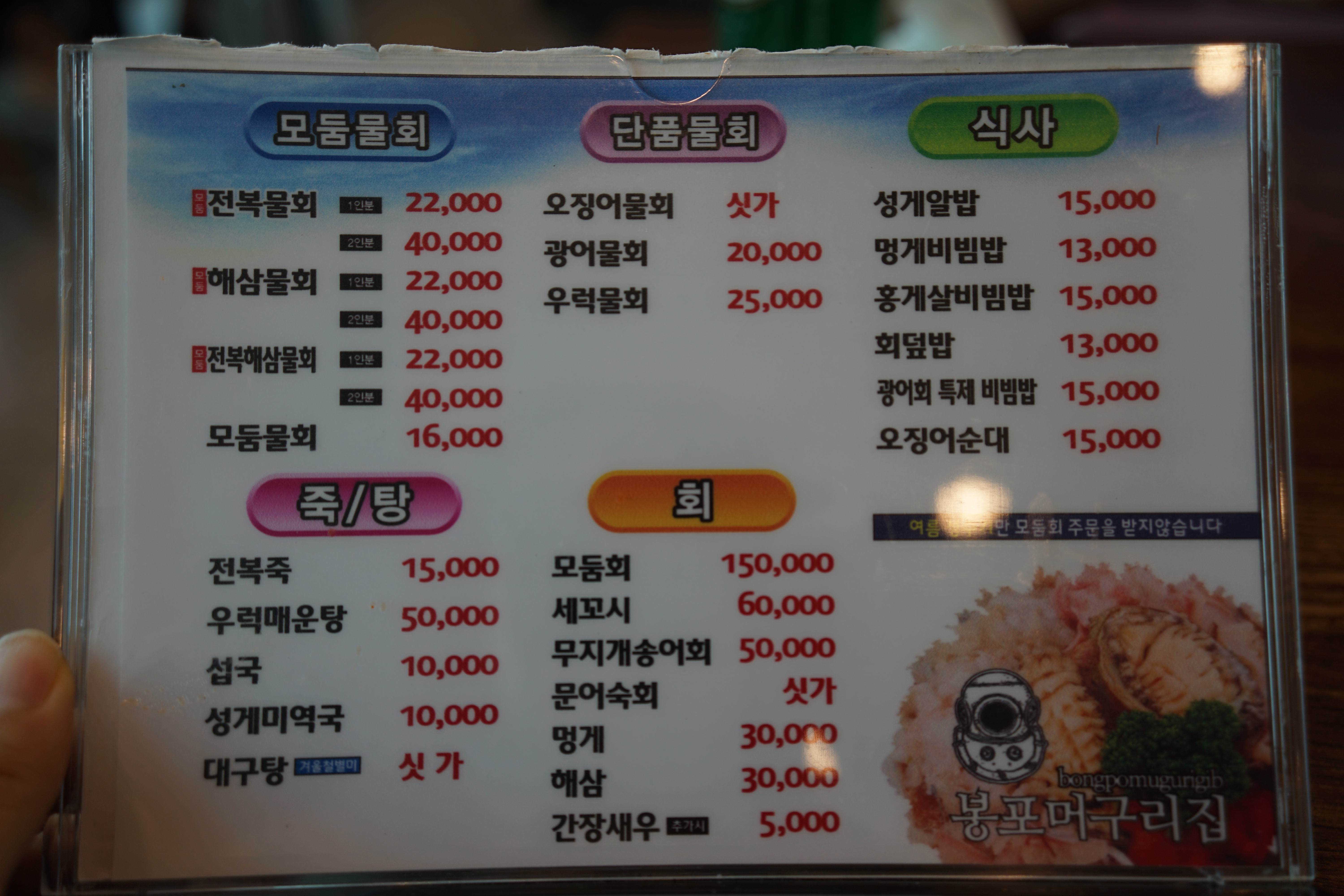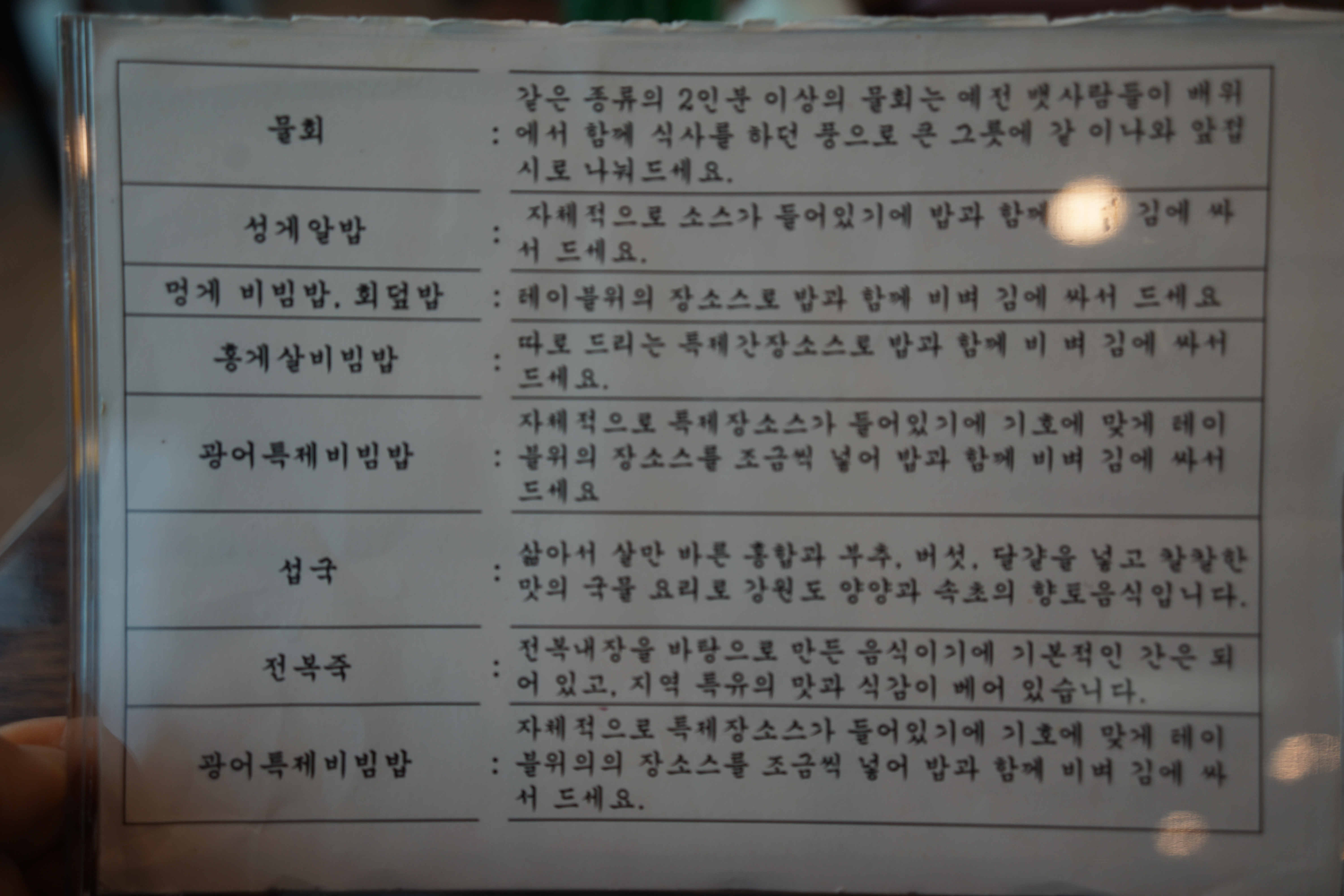 봉포 머구리집의 메뉴와 가격. 가격은 보통 물회 집과 비슷했다. 언니는 섭국을 먹었는데 10,000원이었다. 섭국은 내가 5년 전 출장 가기 전에 먹어보고 맛있어서 언니에게 추천했다. 섭국은 홍합이 들어간 걸쭉한 국인데 부산에서는 맛보지 못한 속초 향토음식이었다. 걸쭉하다는 말에 언니가 구미가 당겼는지 섭국을 주문했는데, 섭국도 예전 같은 느낌이 아니었고 밍밍한 느낌이었다.