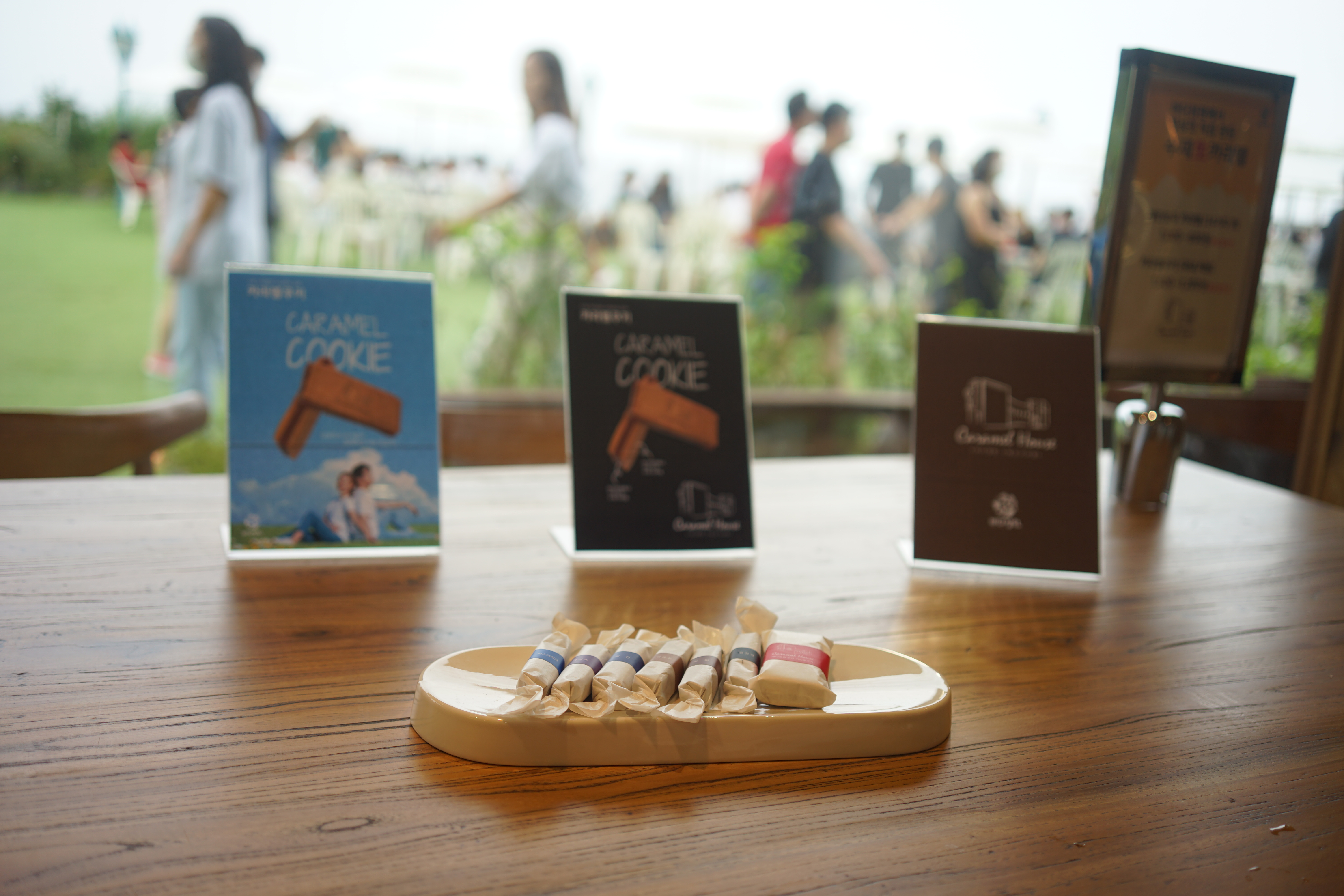 수제 캐러멜도 팔던 바다 정원 카페. 출시 기념으로 할인 이벤트를 한다고 적혀 있었다. 이리저리 구경하다 보니 진동벨이 울려 가족들이 있는 신관의 야외 테이블로 갔다. 후덥지근한 날씨였지만 그래도 바다가 펼쳐진 야외 테이블에서 커피 한잔 하니 휴가 온 느낌이 물씬 들었다.