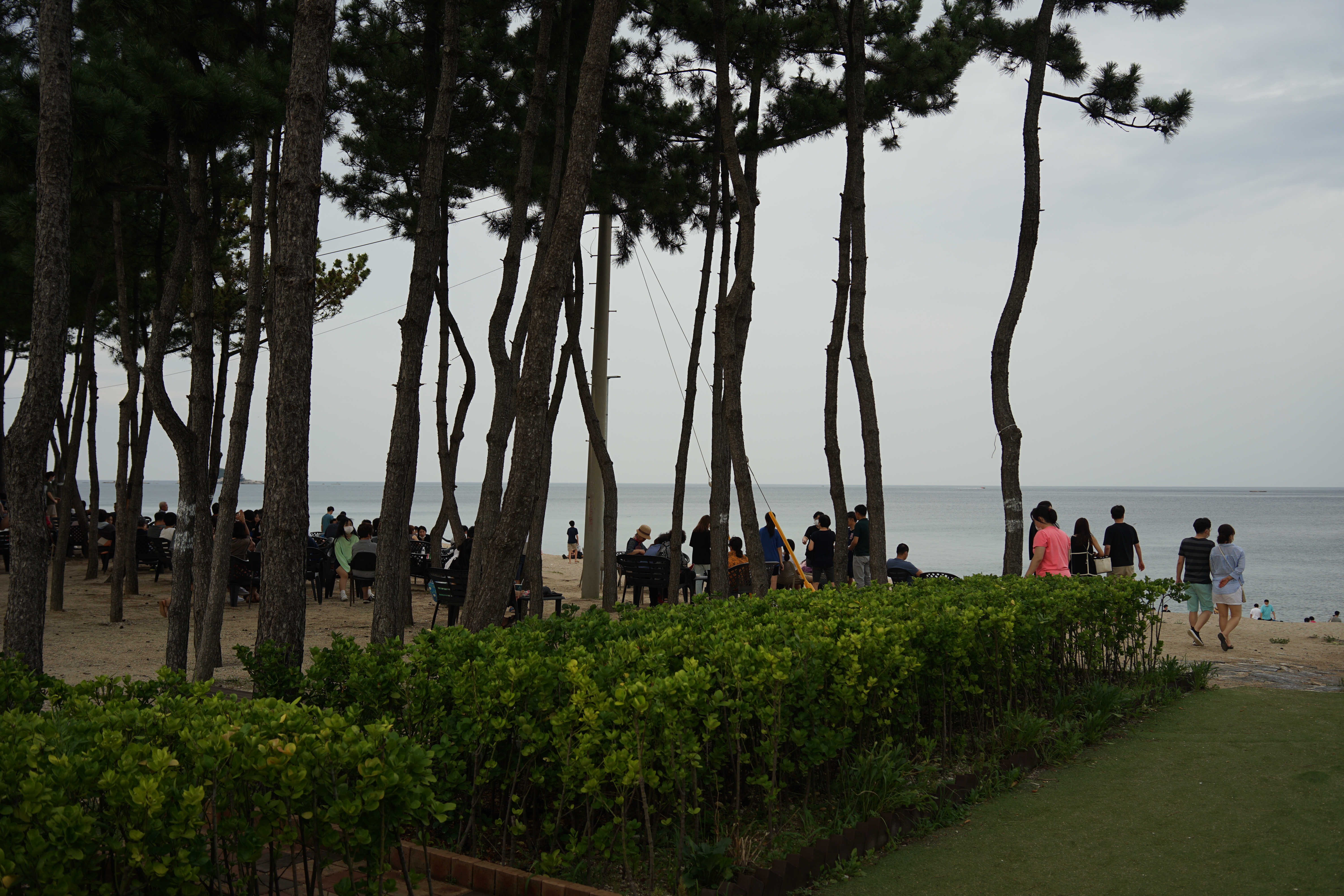 신관 앞에는 심지어 바다 앞까지 테이블이 있었다. 소나무 숲과 바다 사이에 설치된 테이블에 사람들이 빼곡히 앉아 있었다. 조금 기다리니 테이블을 운 좋게 잡을 수 있었다.