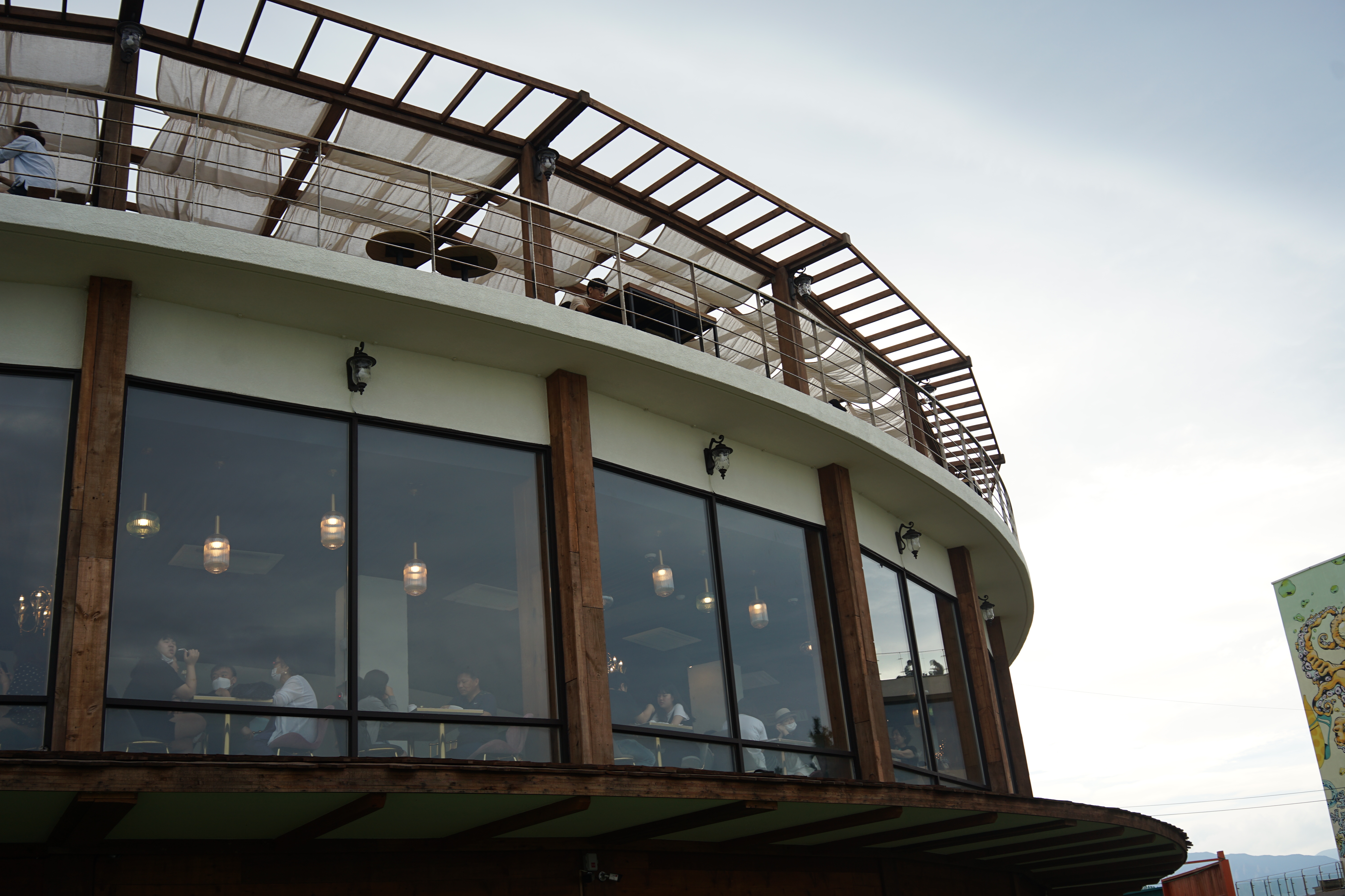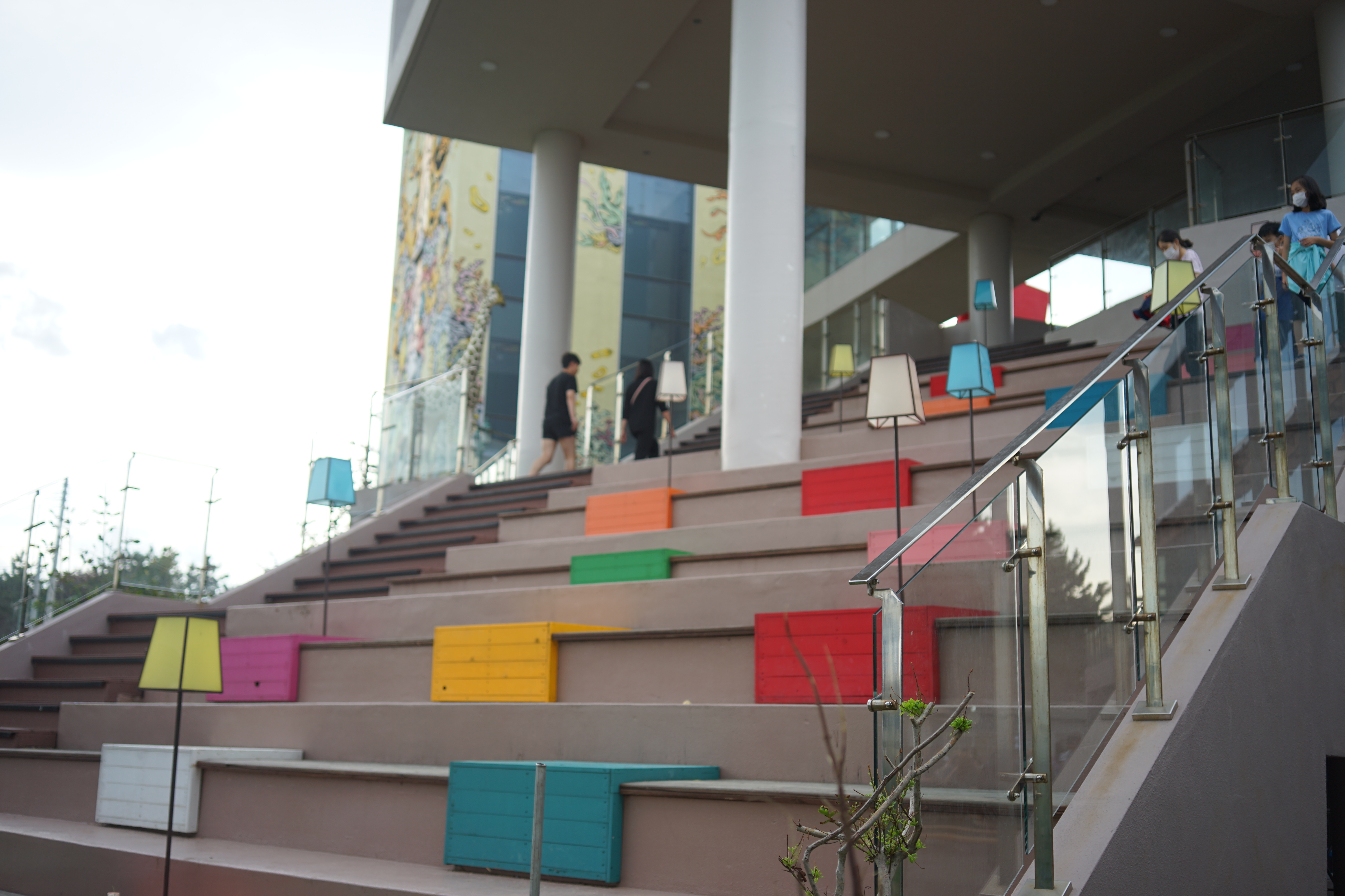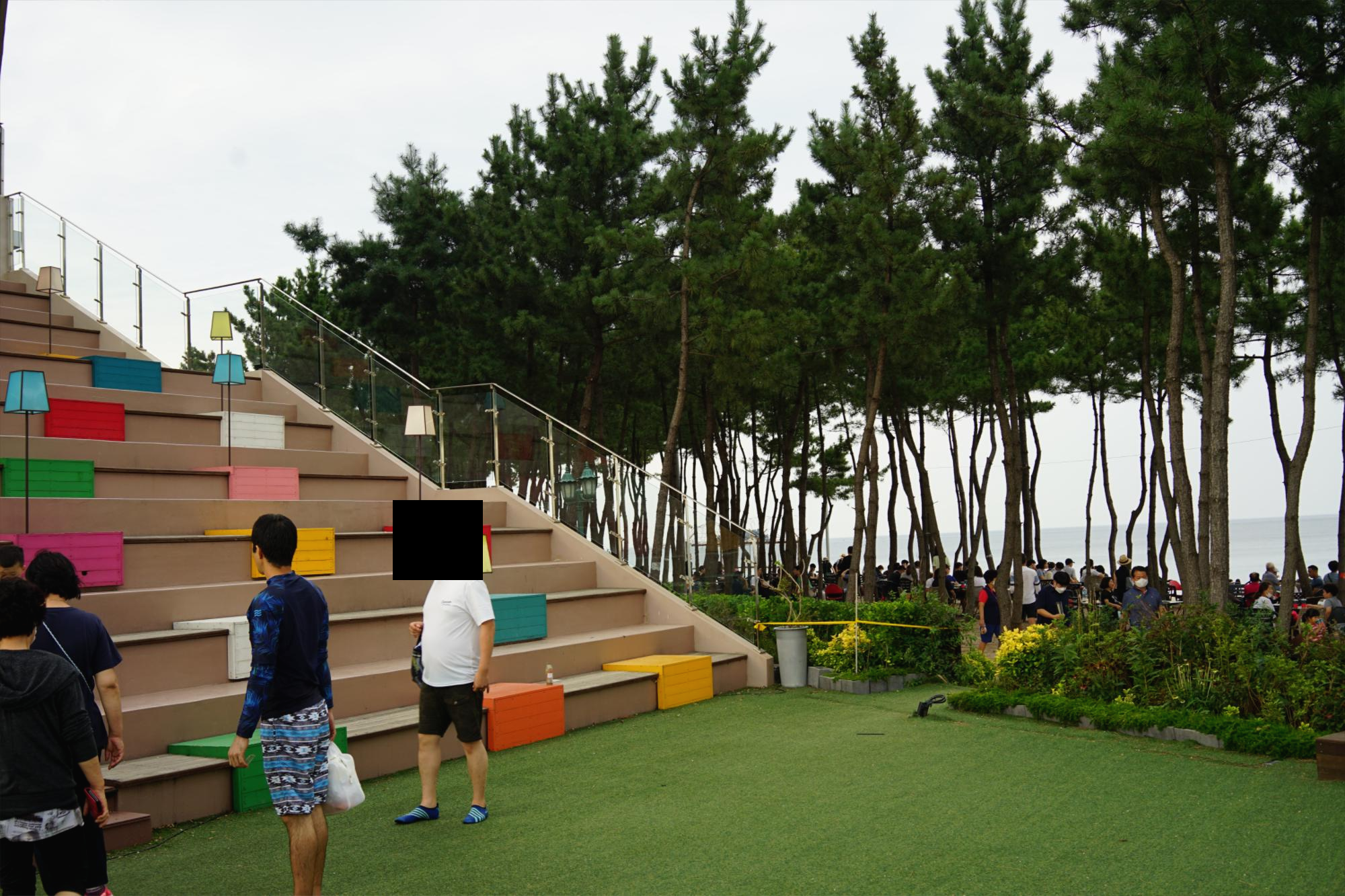 언제나 그렇듯 내가 주문해 오기로 했다. 바다에 설치된 야외테이블 뒤쪽에 바로 바다 정원 신관으로 갈 수 있는 통로가 있다. 야외공연장처럼 설치된 계단에도 앉아서 먹어도 될 것 같은 바다 정원의 신관.