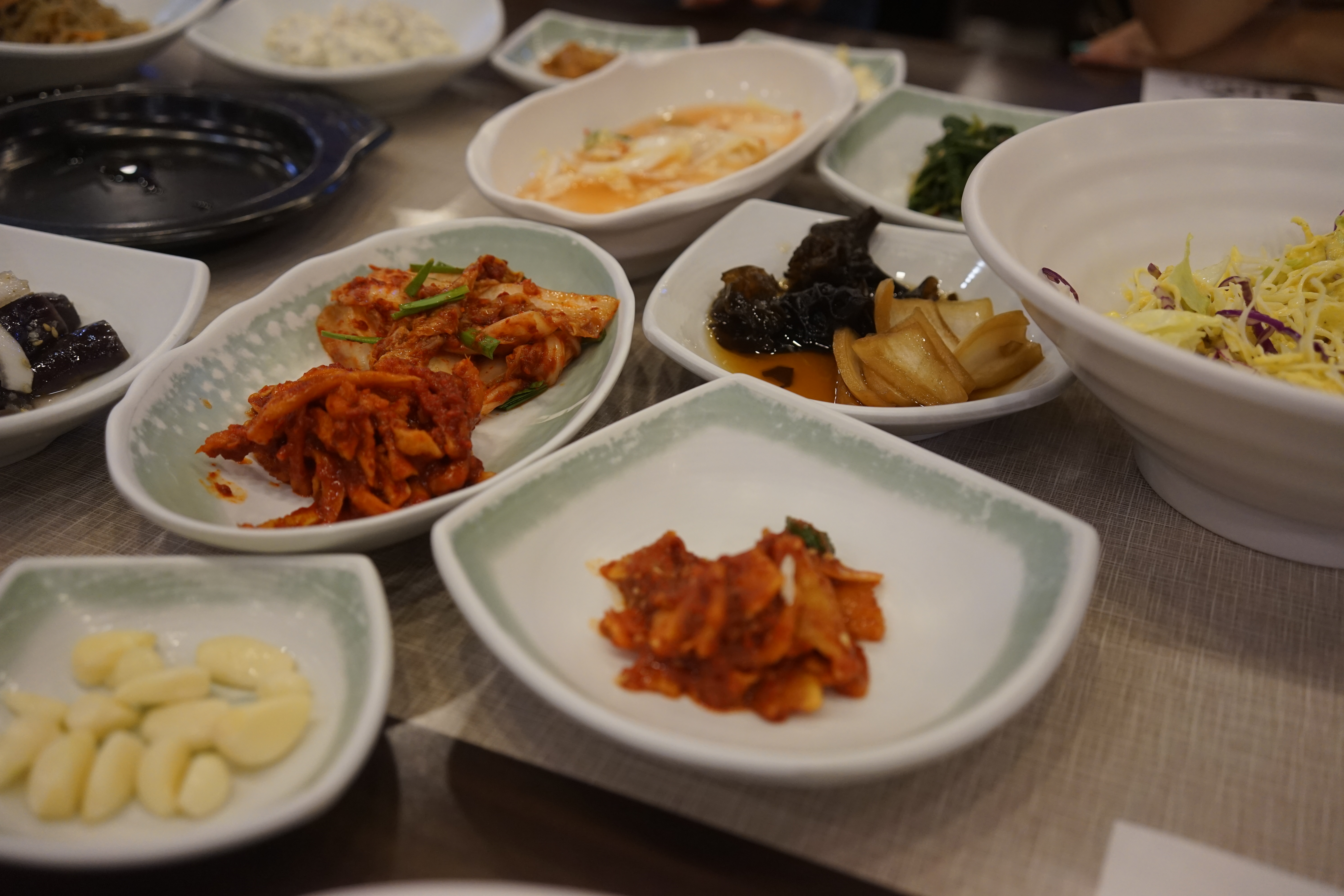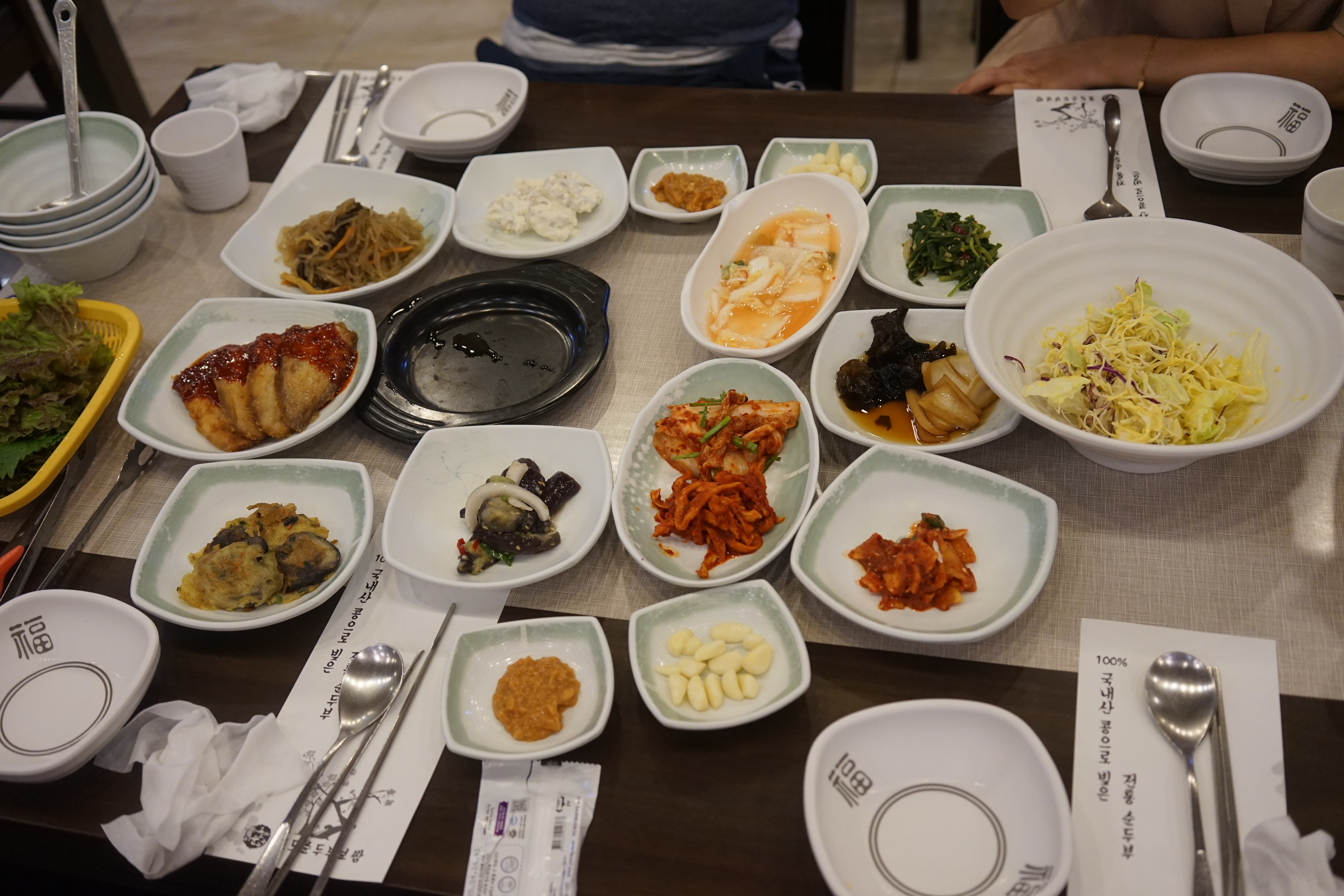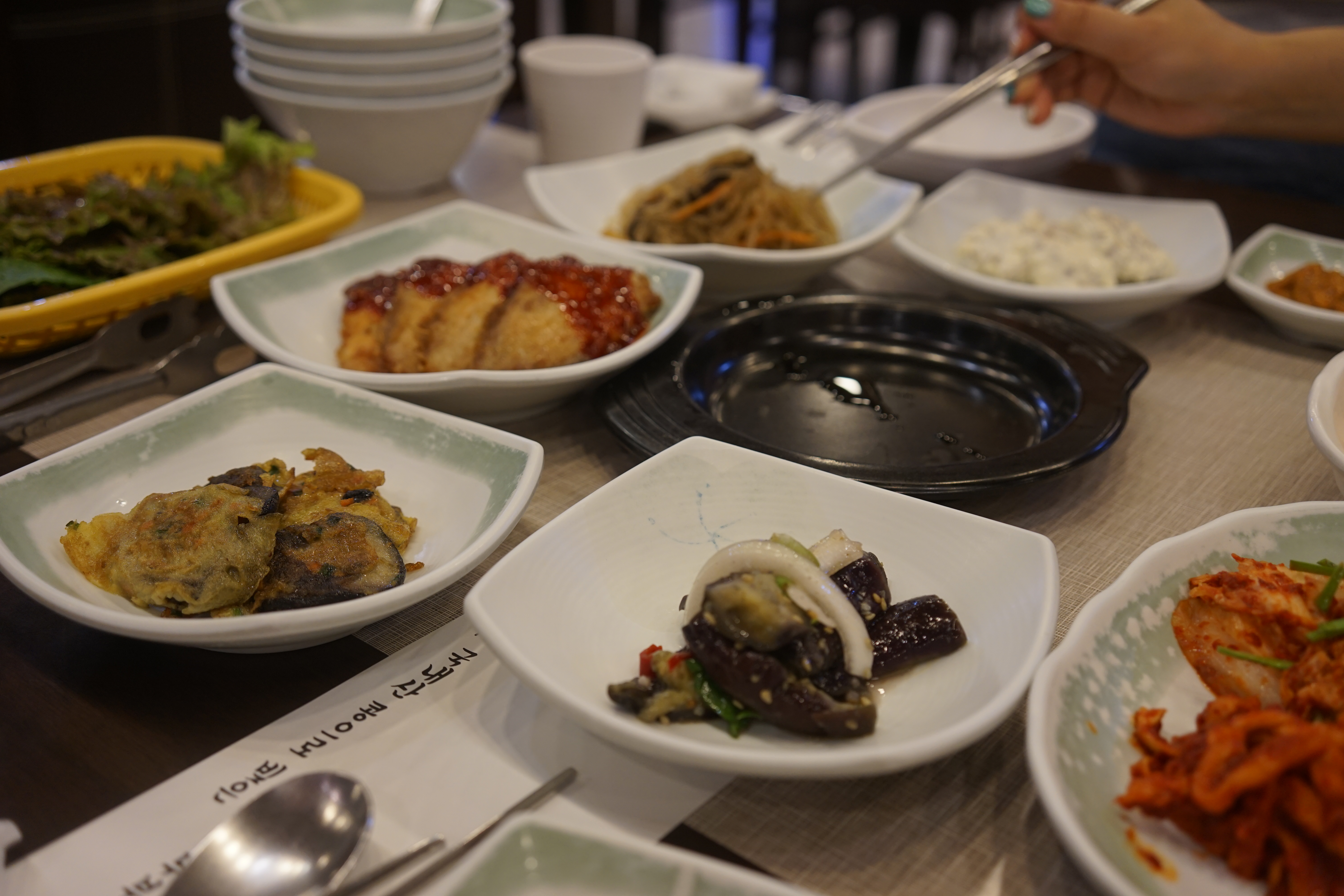 금방 나온 갖가지 반찬들. 버섯전이 맛있어 한번 더 리필해서 먹었다. 생선 구이도 인당 하나씩 나오고 샐러드도 있어 꽤 푸짐했다.