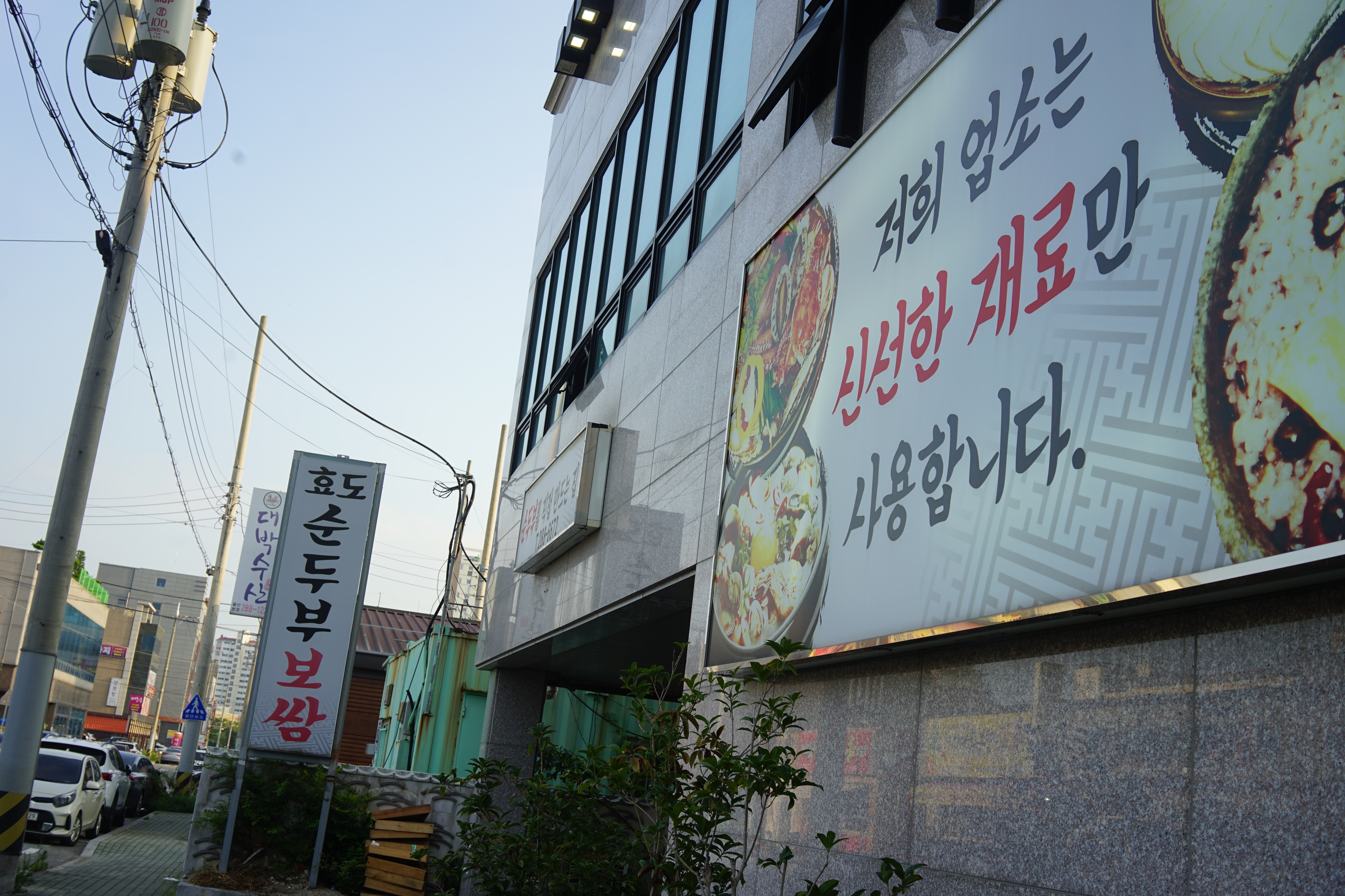 주차장 건너편에 있는 효도 순두부 보쌈. 간판도 건물도 커 보여서 왠지 맛있는 집인가 신뢰가 갔다.