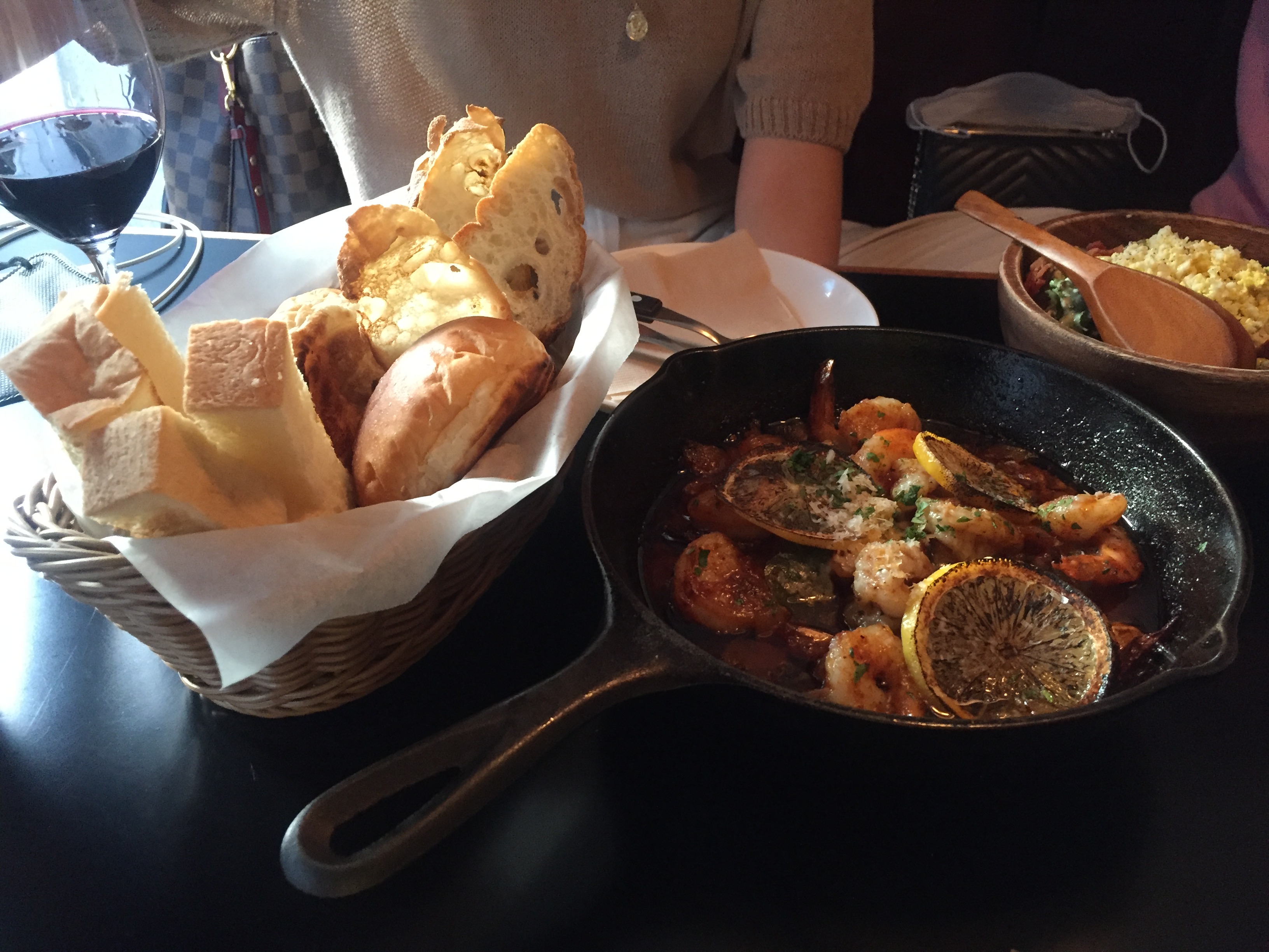 오후 여섯 시 반에 예약했다는 와인바. 여섯 시 반이면 아직 해도 안 졌을 때인 데다가 요즘 코로나로 우리밖에 없지 않을까 했는데, 웬걸. 여섯 시 반에도 손님들이 많았다. 특히 여자 손님들이 정말 많았다. 먼저 주문해놓고 기다리고 있던 친구들. 감바스는 친구가 단골이라 서비스로 받았다고 했다.