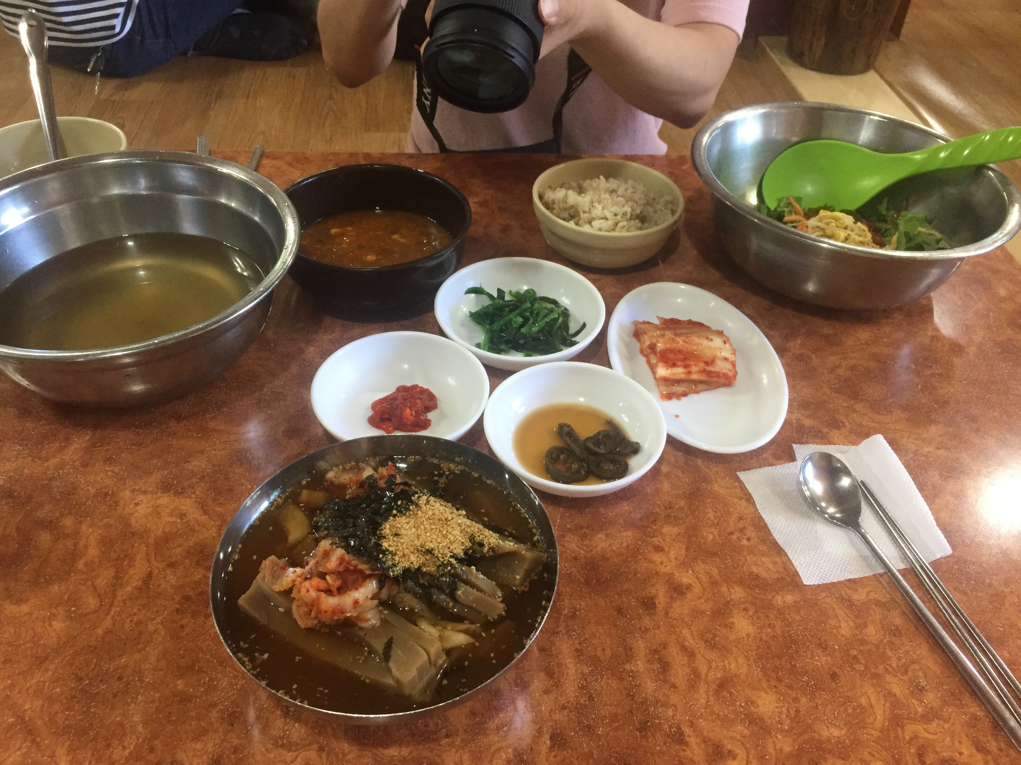열심히 사진 찍는 오빠. 이곳은 특이하게 숭늉을 저 세숫대야 같은 곳에 담아준다. 처음엔 손 씻는 물인가 조금 당황했었다. 보리밥도 이 큰 대야 같은 그릇에 야채와 나물, 고추장을 넣고 비빌 수 있게끔 준비해주신다.