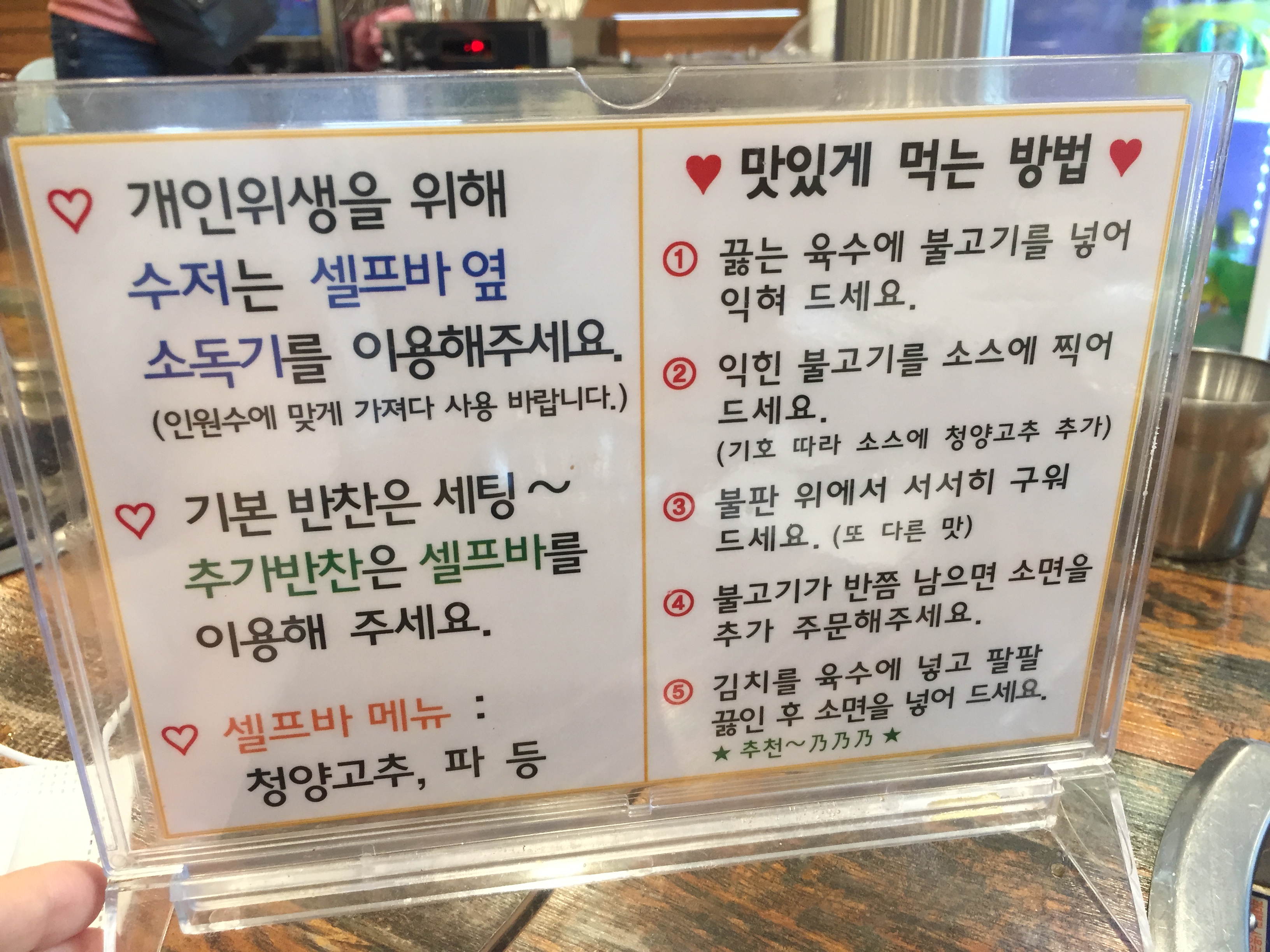 먹는 방법도 자세히 나와있다. 매운 것을 좋아하는 나는 셀프 코너에서 청양고추를 리필해서 먹었더니 칼칼하니 딱 좋았다. 국물에도 청양고추를 넣었더니 난 맛있었는데 오빠는 살짝 매워했다. 불고기 양념이라 국물이 꽤 달달하니 매운 것을 좋아한다면 청양 고추를 넣는 것도 추천한다.
