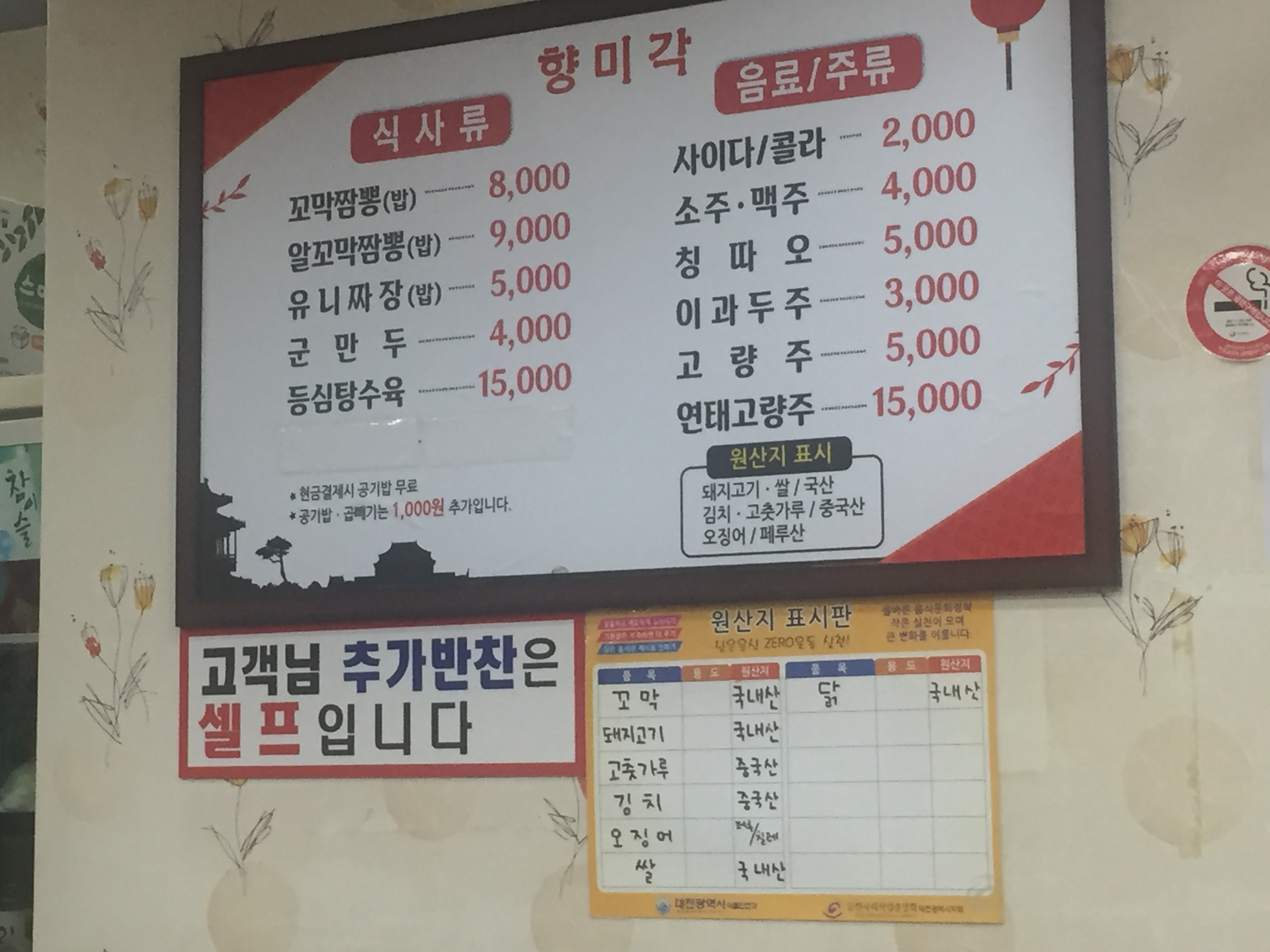 여느 주말과 같이 세종시 부동산을 훑고 온 어느 일요일. 전날 놀러 온 오빠 친구를 역까지 배웅하고 오빠는 다시 나를 데리러 왔다. 점심도 거르고 부동산으로 바로 갔으나 만족할만한 정보를 얻진 못했다. 결국 점심이라기엔 너무 늦고 저녁이라기엔 너무 이른 식사를 네시 반 정도에 먹게 되었다. 오빠가 뭘 먹고 싶냐고 하길래 그냥 개운하게 짬뽕 같은 것이 먹고 싶다고 했더니 전부터 가고 싶었지만 못 가본 꼬막 짬뽕 맛집 향미각에 데려가 주었다. 혹시나 브레이크 타임이 있을까 전화해봤더니 다행히도 먹을 수 있다고 하셨다.