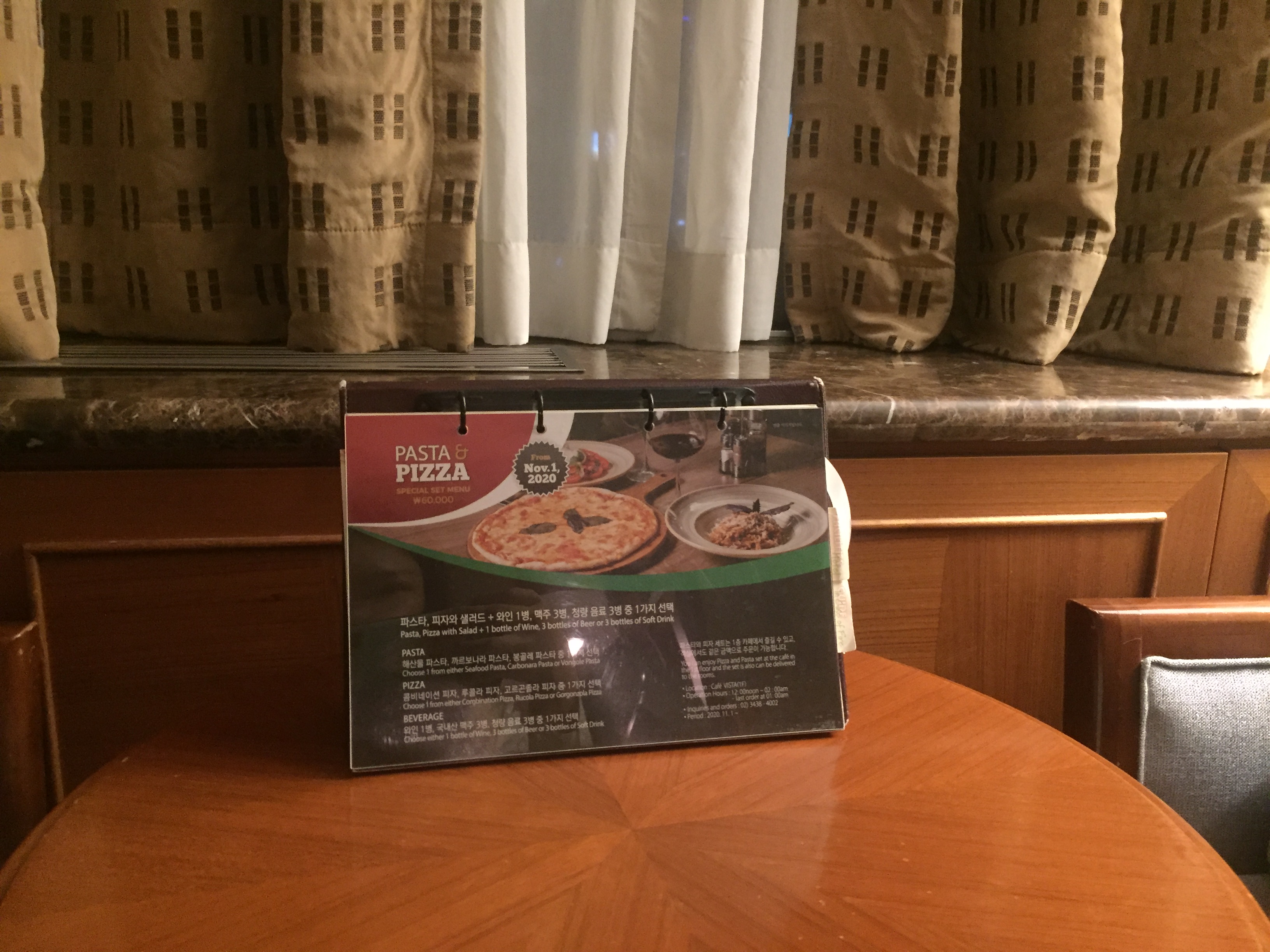 외관과 로비는 멋있었으나 주차장이나 엘리베이터 같은 시설이 이 호텔의 오래된 역사를 드러내어 주었다. 특히 주차장이 오래되고 좁아서 오빠가 커브를 돌고 주차를 하는데에 애를 먹었다. 그래도 4만 원이면 웬만한 모텔보다 싼 가격인 데다가 원규 노블레스 스튜디오에서 차로 5분 거리였기 때문에 딱히 고민할 거리도 없었다. 방에 들어가니 불이 어둡고 좀 오래된 느낌은 있었으나 어차피 잠만 자고 갈 것이었기에 괜찮았다. 바닥 전체가 카펫이 깔려 있어 신발을 신고 들어가는 방식에 오빠는 처음에는 적응하지 못했다. 영어 메뉴판 등 곳곳에 외국인을 위한 배려가 눈에 띄었다.