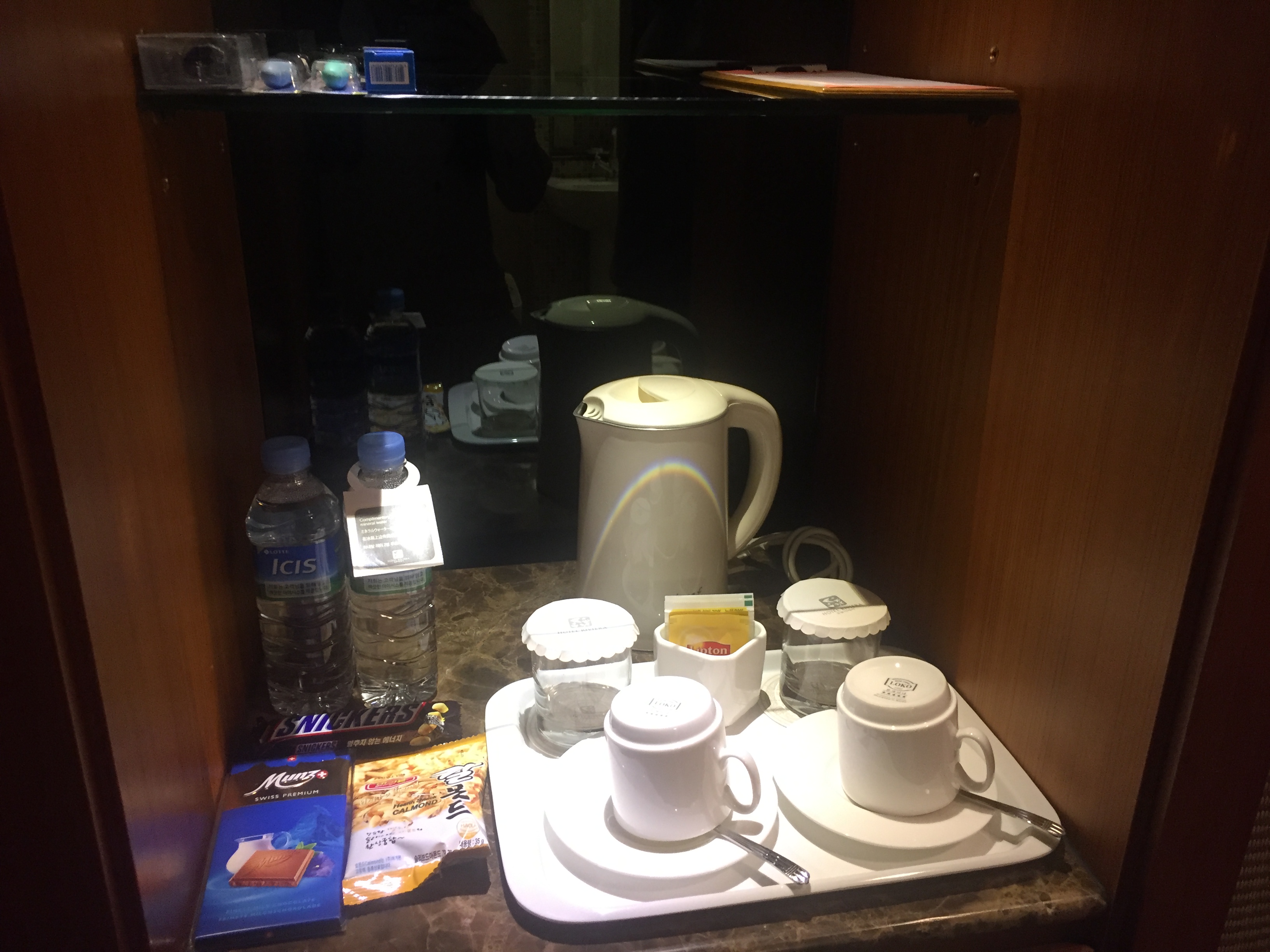화장실 앞에 준비된 컵, 차와 커피포트, 그리고 프리 워터. 초콜릿과 아몬드 등의 주전부리가 마치 무료인 것처럼 놓여있었으나 가격이 책정되어있으니 주의할 것. 칫솔, 치약 등도 일회용품으로 제공되지 않고 다 구매를 해야 하는데, 마침 오빠가 칫솔과 치약을 깜빡해서 그냥 하나씩 꺼내어 썼다. 치약은 1,100원, 칫솔은 3,300원이었다.