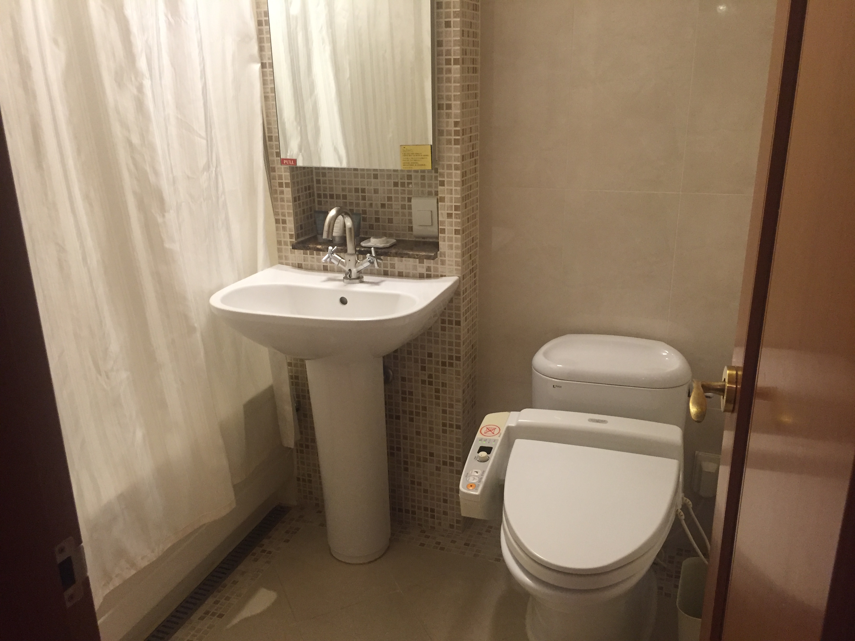 그냥 둘이 쓰기 적당했던 화장실 겸 욕실. 샤워 커튼 뒤에는 욕조가 있다. 거울로 된 수납장을 눌러보면 면봉이나 샤워캡 등 간단히 쓸 수 있는 일회용 도구들이 나온다. 다음날 아침에서야 눌러본 우리...