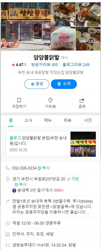송내역 근처에 위치한 매운 닭발 맛집 얌얌 불닭발. 포장과 배달도 가능하다. 이미 닭발 맛집으로 14년도에 생방송 투데이에 출연한 바 있다. 닭발 거리 송내역에서 단연 최고 맛집인 얌얌 불닭발. 오돌뼈도 맛있으니 참고.