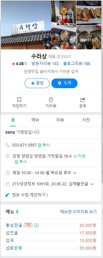 싱싱한 섭 해물 전골 맛집으로 유명한 양양의 수라상. 수라상은 양양 쏠비치와 양양시외버스터미널 근처에 위치해 관광객들이 찾기 좋은 맛집이다. 싱싱한 통섭전골에 칼국수까지 넣어 먹으면 금상첨화.