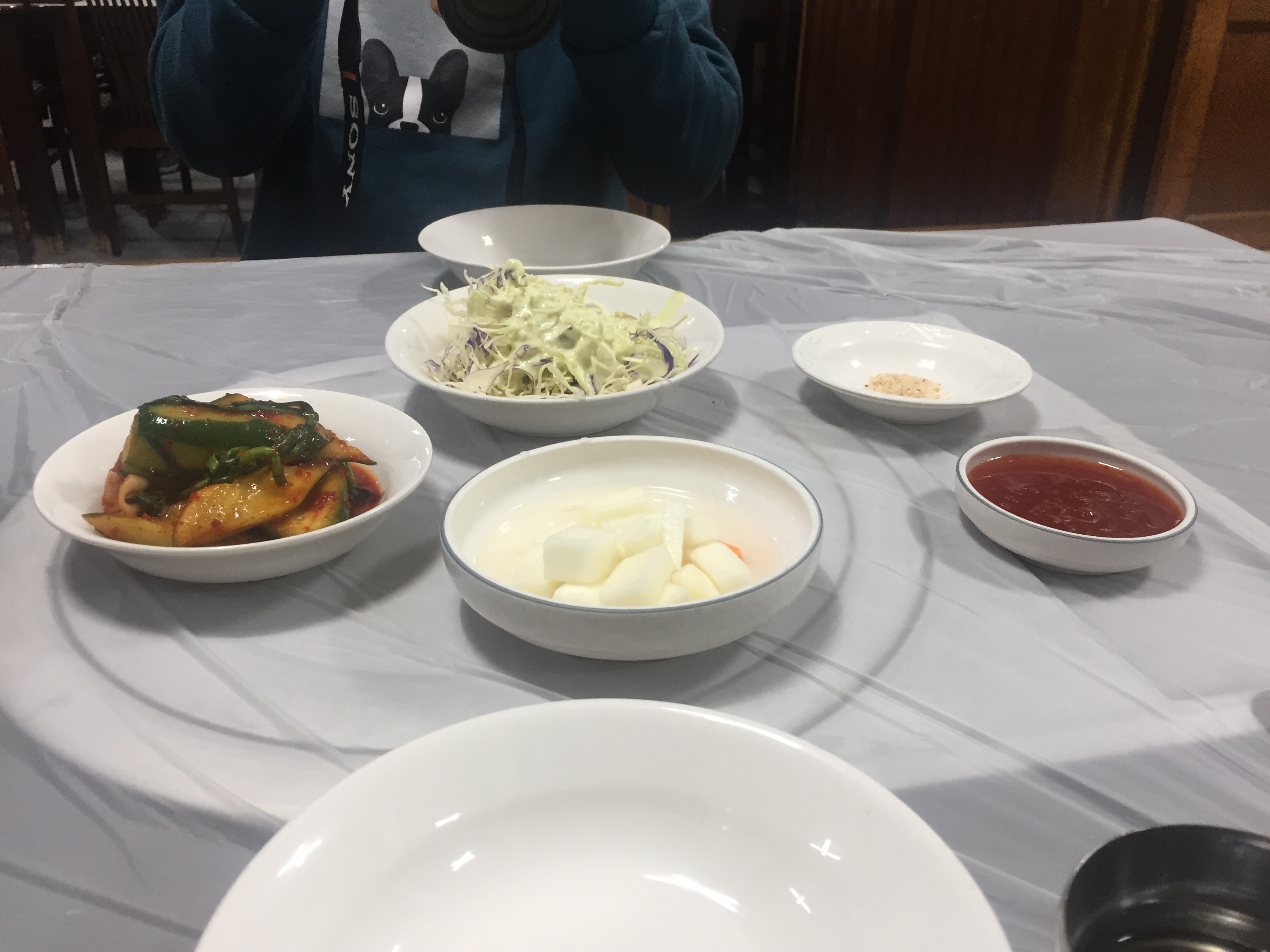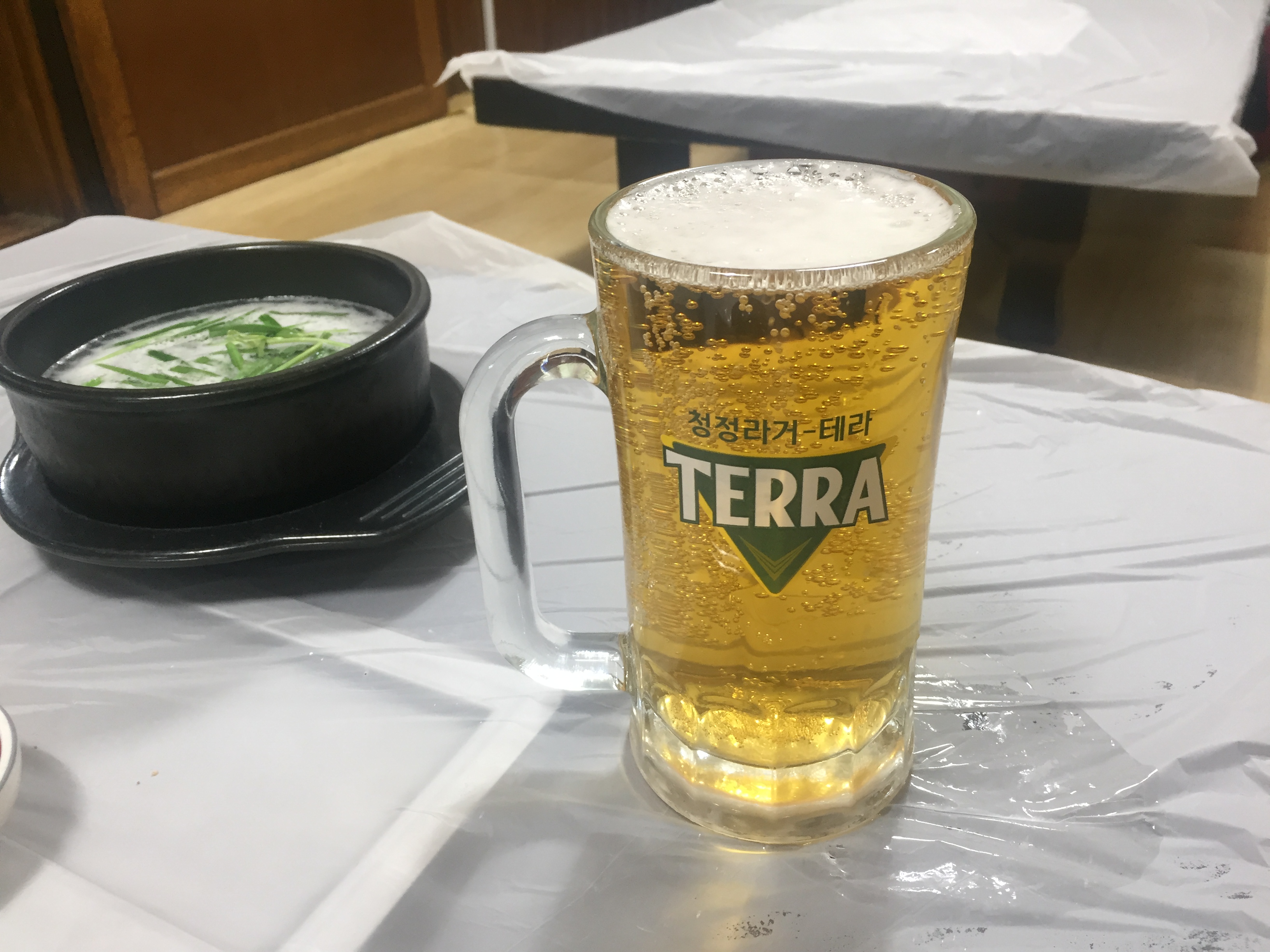 그리고 서비스로 주신 묽은 닭죽. 떡국떡도 들어있고 닭뼈로 우려낸 국물이 꽤 감칠맛이 있어서 묘하게 떠먹게 되는 맛이었다. 오빠는 회식으로 오면 다들 이것만 떠먹고 있다고 했다.