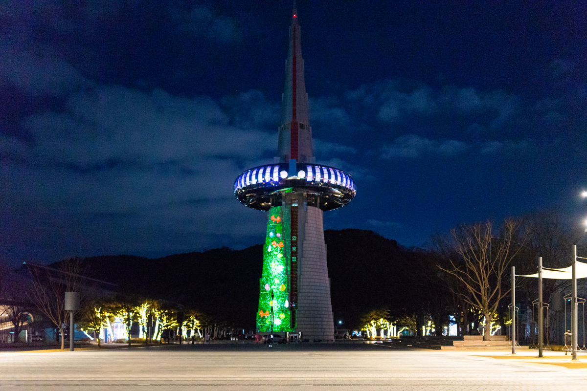 아마도 이런 트리는 다른 곳에서 구경하기 힘들기 때문일 것이다. 한빛탑 벽면에 영상을 쏘는 미디어 파사드 방식으로 대전을 나타내는 다양한 영상들과 화려한 조명, 그리고 그에 어울리는 음악까지 함께한다.