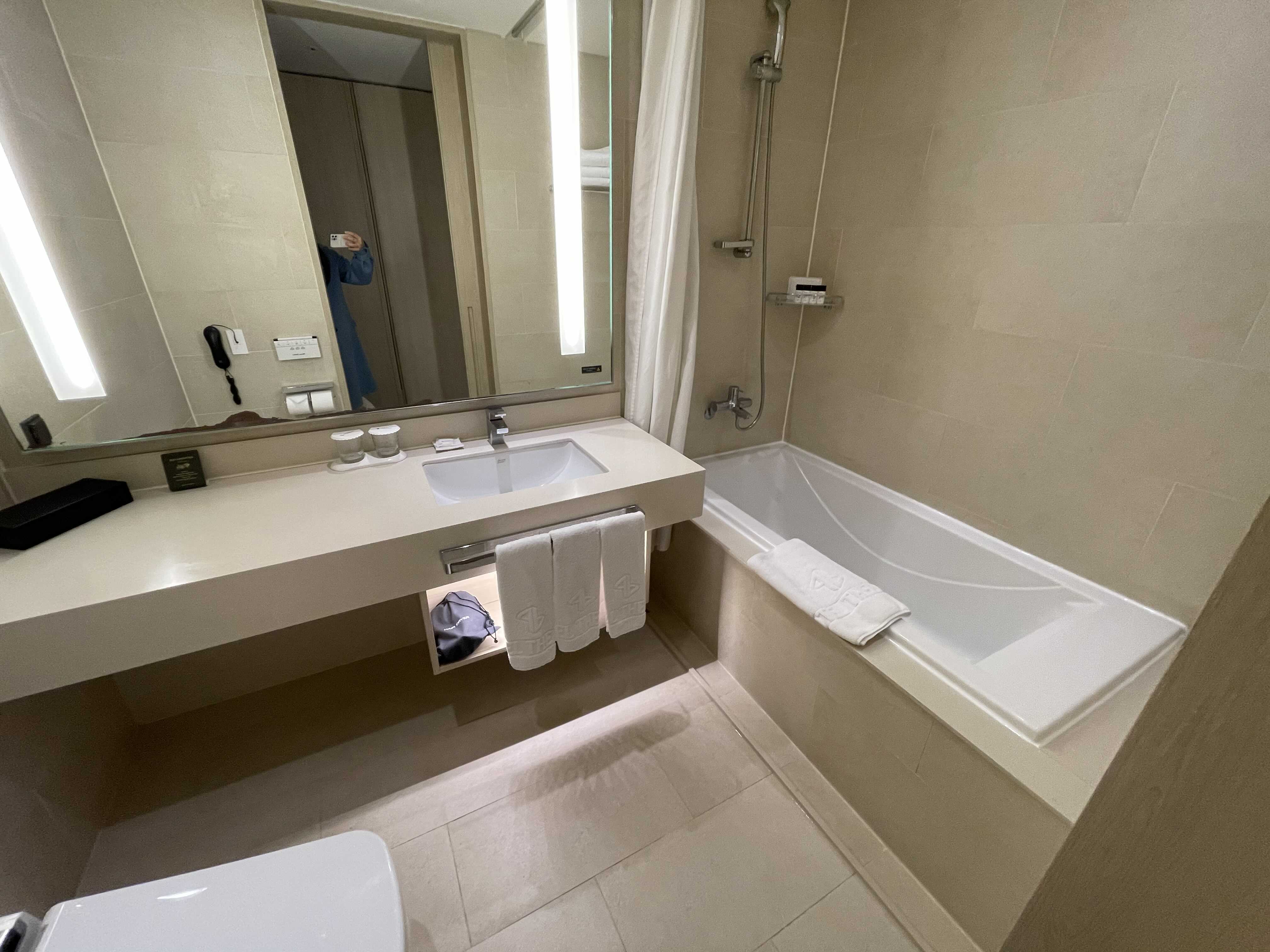 호텔 더본의 욕실 겸 화장실. 욕조와 샤워 커튼이 있고 모든 어메니티와 수건 등이 3명 분으로 준비되어 있어 따로 추가 요청을 드리지 않아도 돼서 편리했다. 사실 처음보다 객실 가격이 더 상승한 것 같긴 하지만 그래도 이 정도면 가성비 호텔이라는 명성이 전혀 지나치지 않다는 생각이 들었다.
