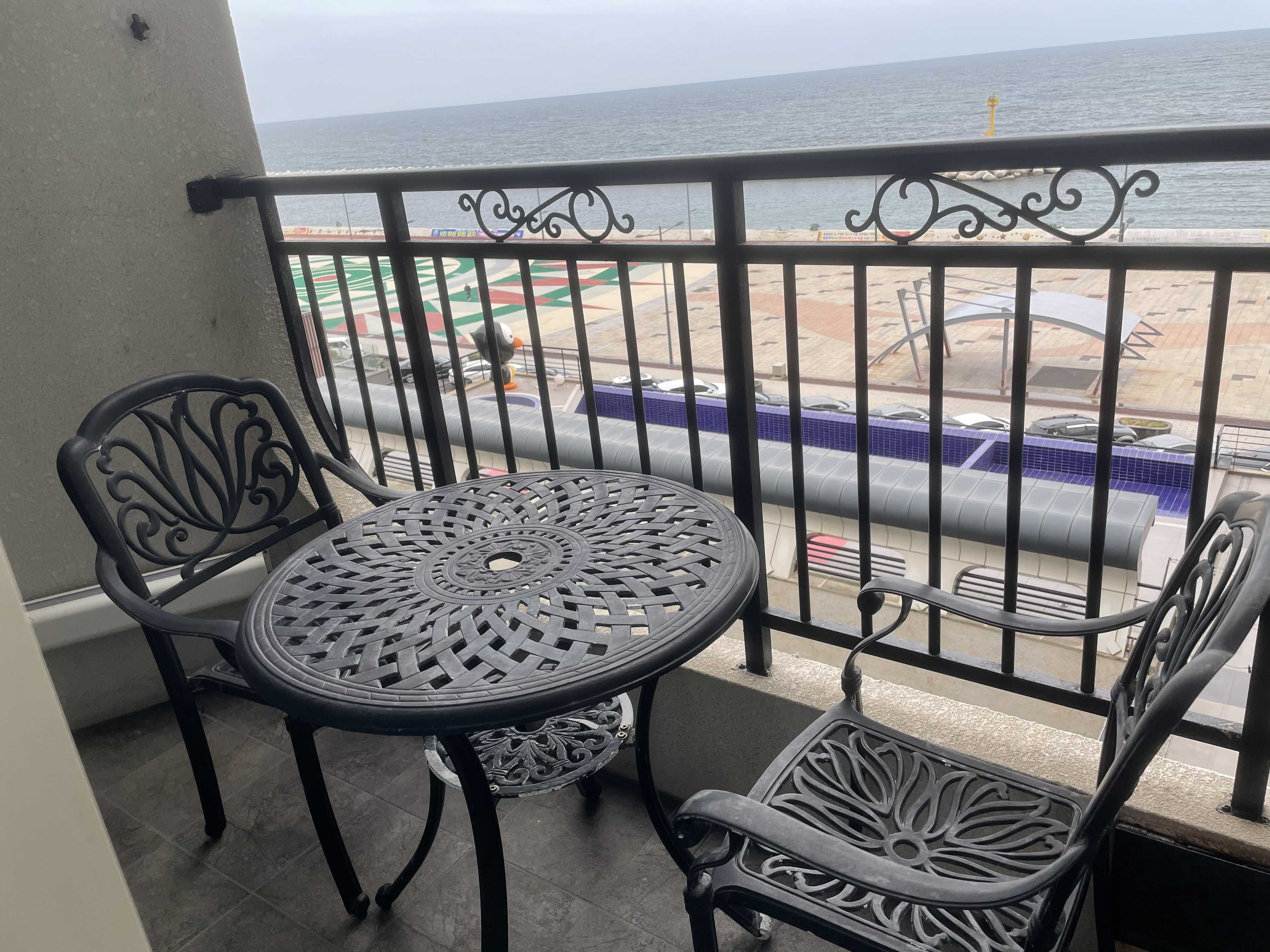베란다에는 바다를 보며 쉴 수 있게 테이블과 의자가 준비되어 있었다. 전날 비가 와서 사용하지 못했던 것이 참 아쉬웠다.