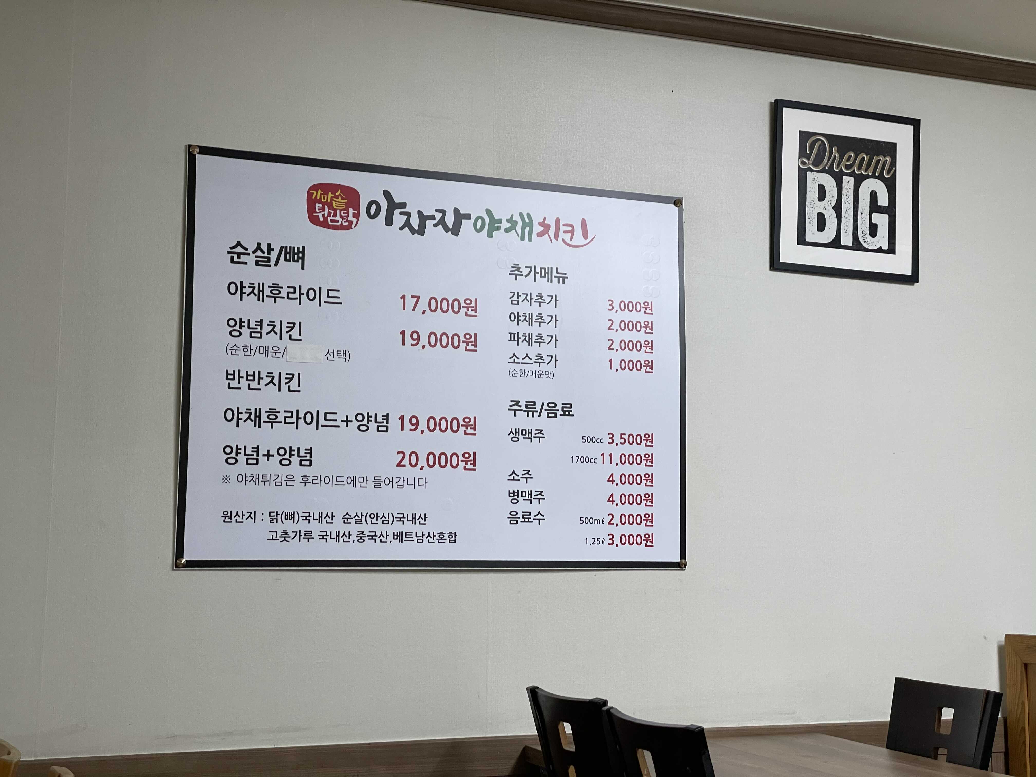 홀에서 이 날 마지막 튀겨지는 아자자 야채 치킨을 기다리고 있었다. 사장님께서 직접 배달하시는지 배달을 마치고 들어오셔서는 추운 날 직접 오셨냐며 난로를 앞으로 가져다주셨다. 치킨이 맛있어야 할 텐데 본인이 생각했을 때는 평범한 치킨 맛인데 다들 맛있다고들 많이 찾아주셔서 얼떨떨하시다고 하셨다. 친절하고 겸손하신 사장님 내외 덕에 앞으로 더 유명해질 것 같은 월평동 아자자 야채 치킨.