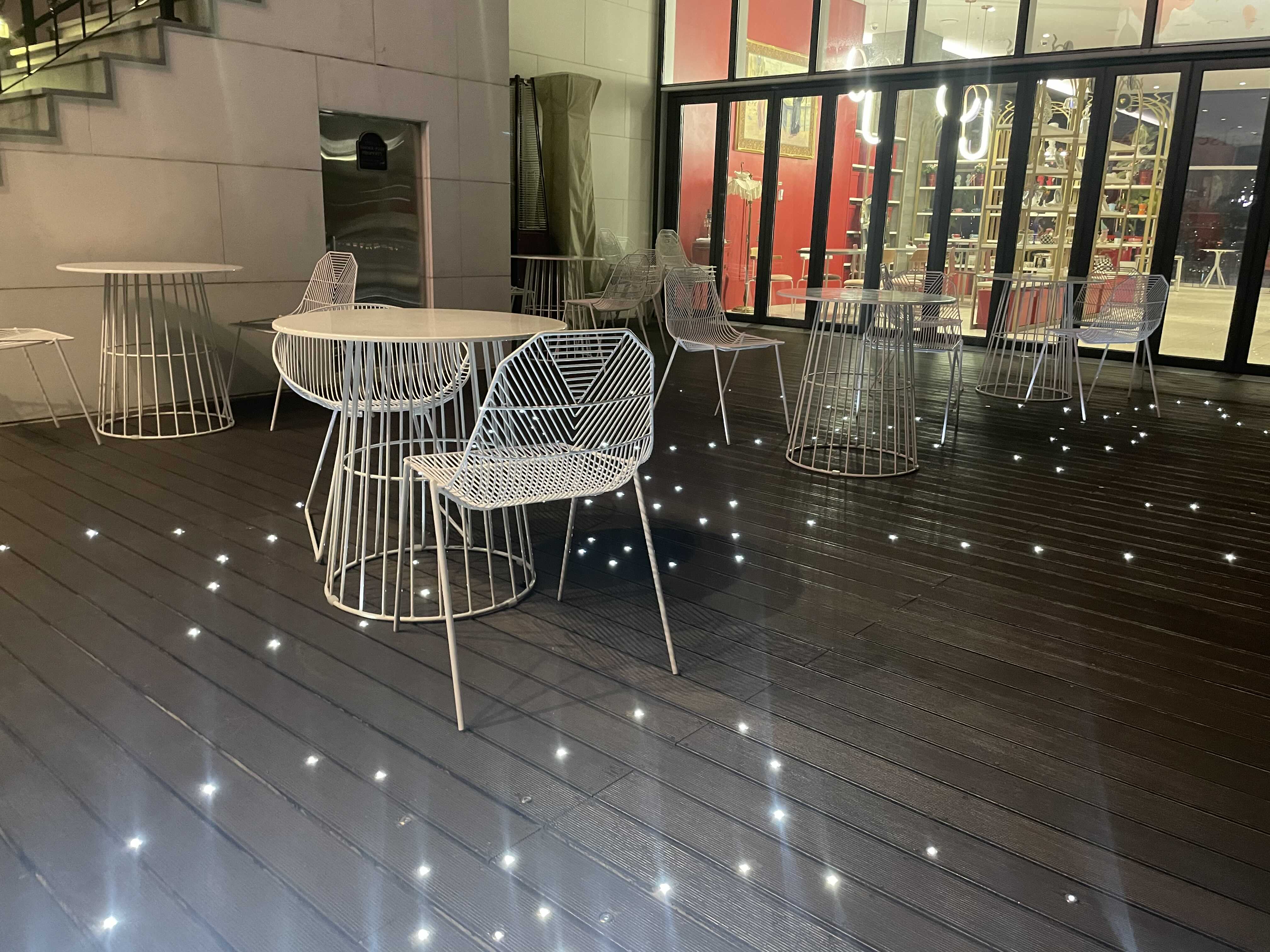야경을 좀 더 즐기려고 테라스에 앉았다. 이 날은 그래도 날씨가 꽤 따뜻해서 바깥에 앉아도 별로 춥지가 않아 좋았다. 야외 테라스 바닥에 예쁜 조명도 깔려 있었다.
