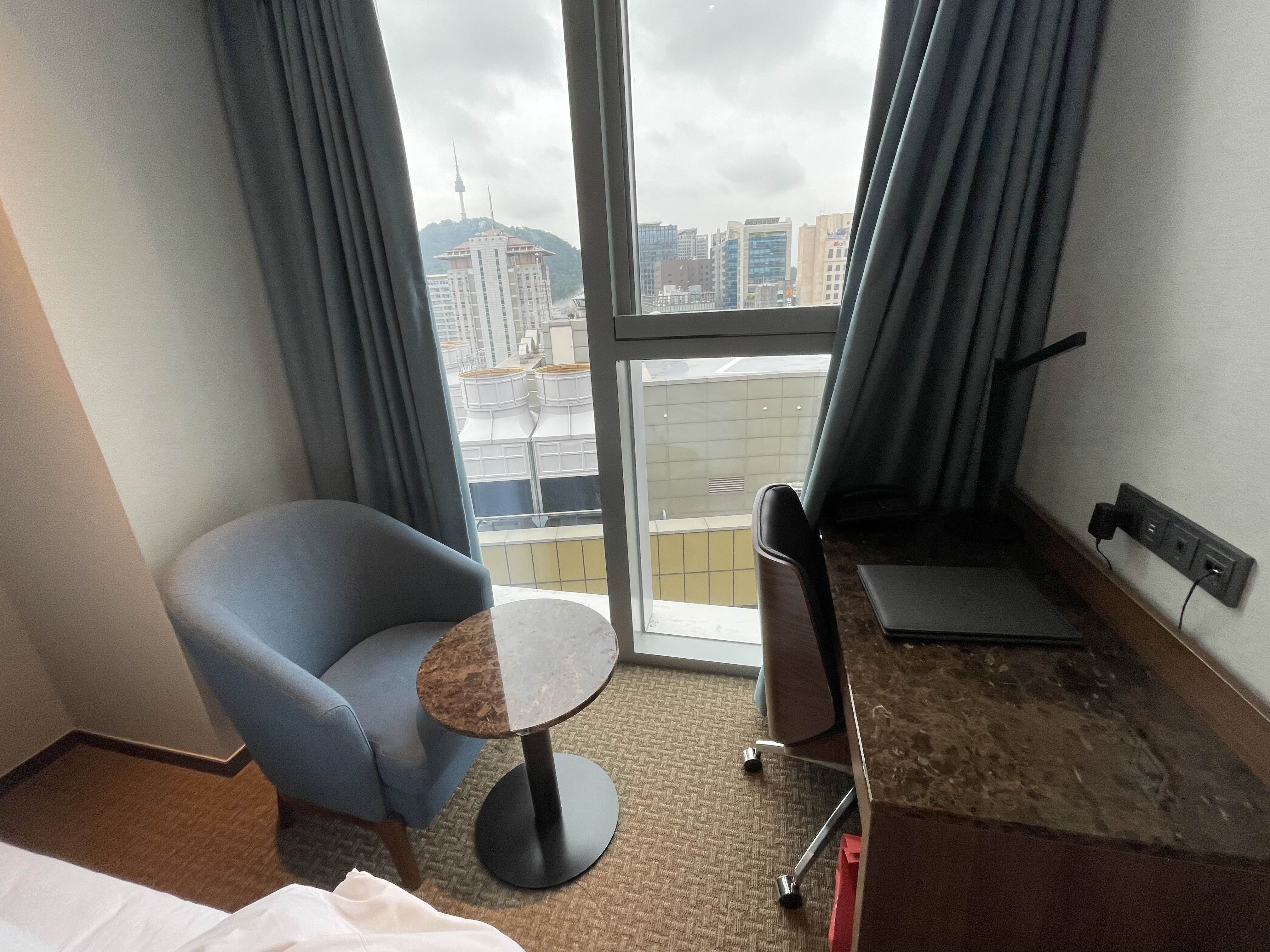 스텐포드 명동 호텔의 이 룸타입은 1인에 딱 맞는 건지 1인용 소파와 테이블, 그리고 책상과 의자가 있다. 나처럼 교육이나 출장 온 사람에게 정말 적합한 호텔이지 않나 싶다.