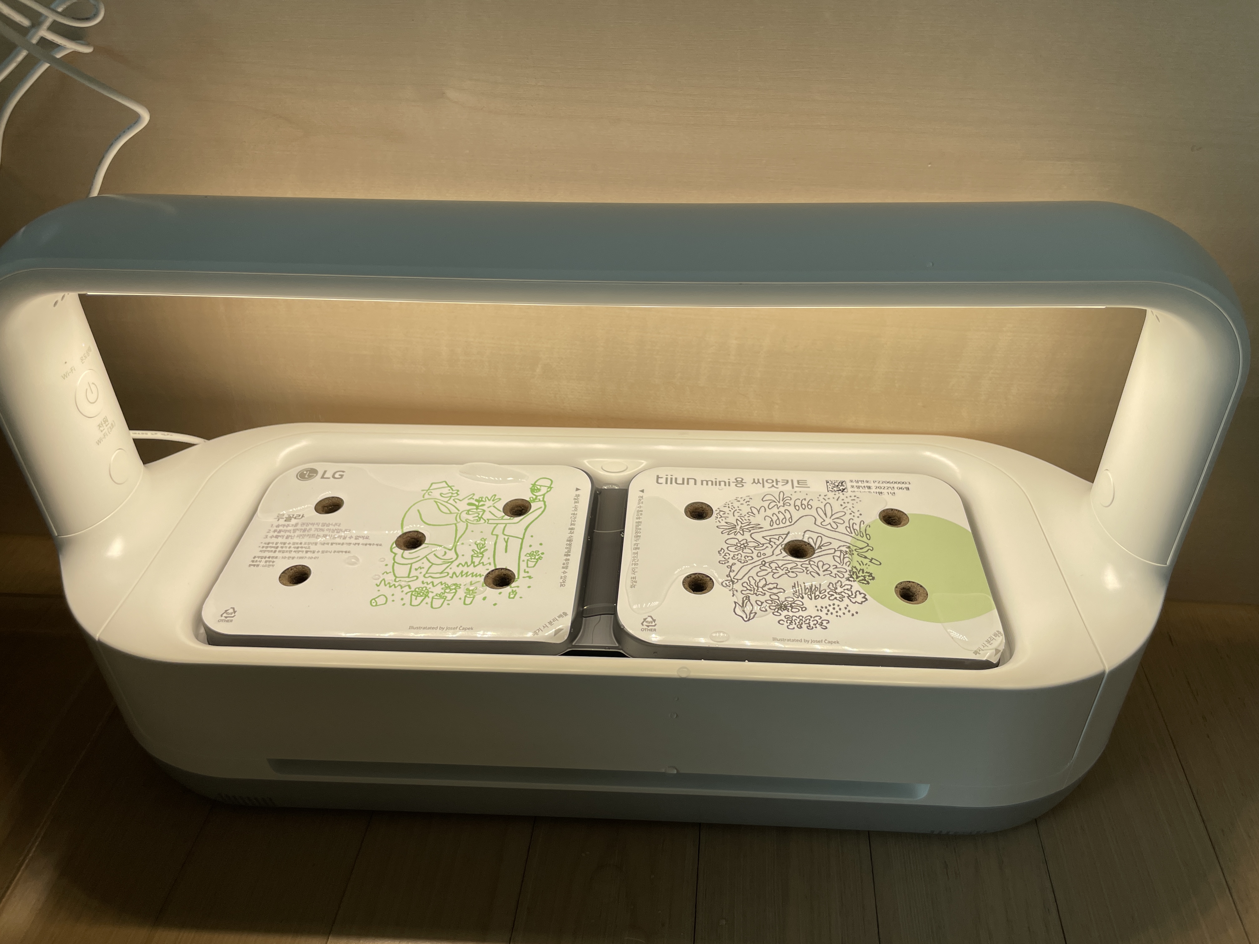 엘지 틔운 미니의 설치가 완료되었다. 생각보다 조명의 밝기가 강하다. 기본 조명 시간은 오전 8시부터 오후 10시 정도인데, 조명을 좀 더 약하게 하거나 시간을 짧게 해도 된다. 다만 생장 속도가 좀 더뎌지긴 하겠지.