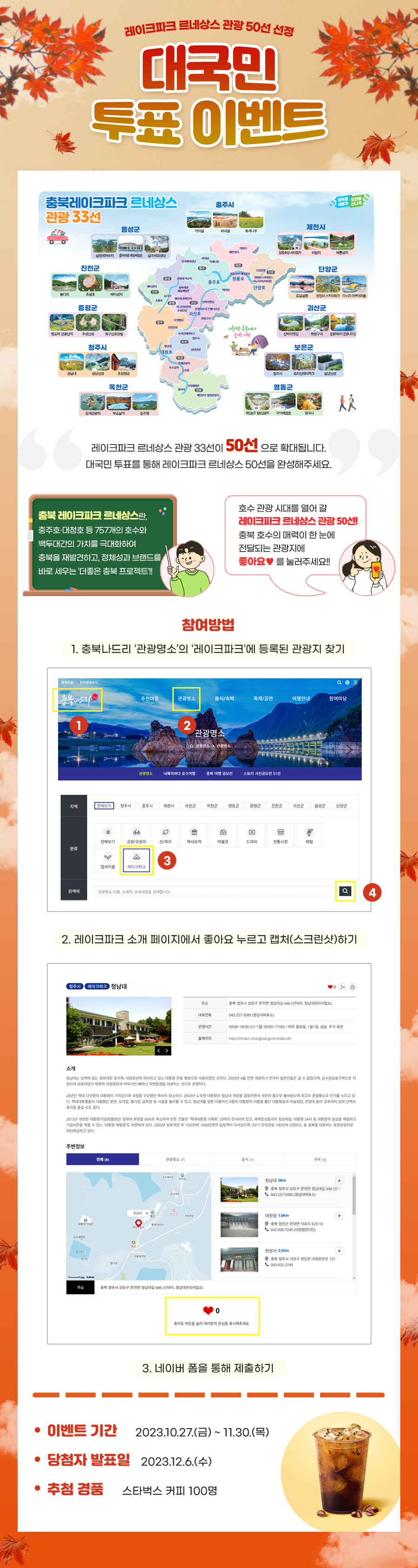 역사에 길이 남을 충북 레이크파크 관광 50선 선정에 참여하고, 스타벅스 커피 쿠폰까지 받을 수 있는 이벤트!