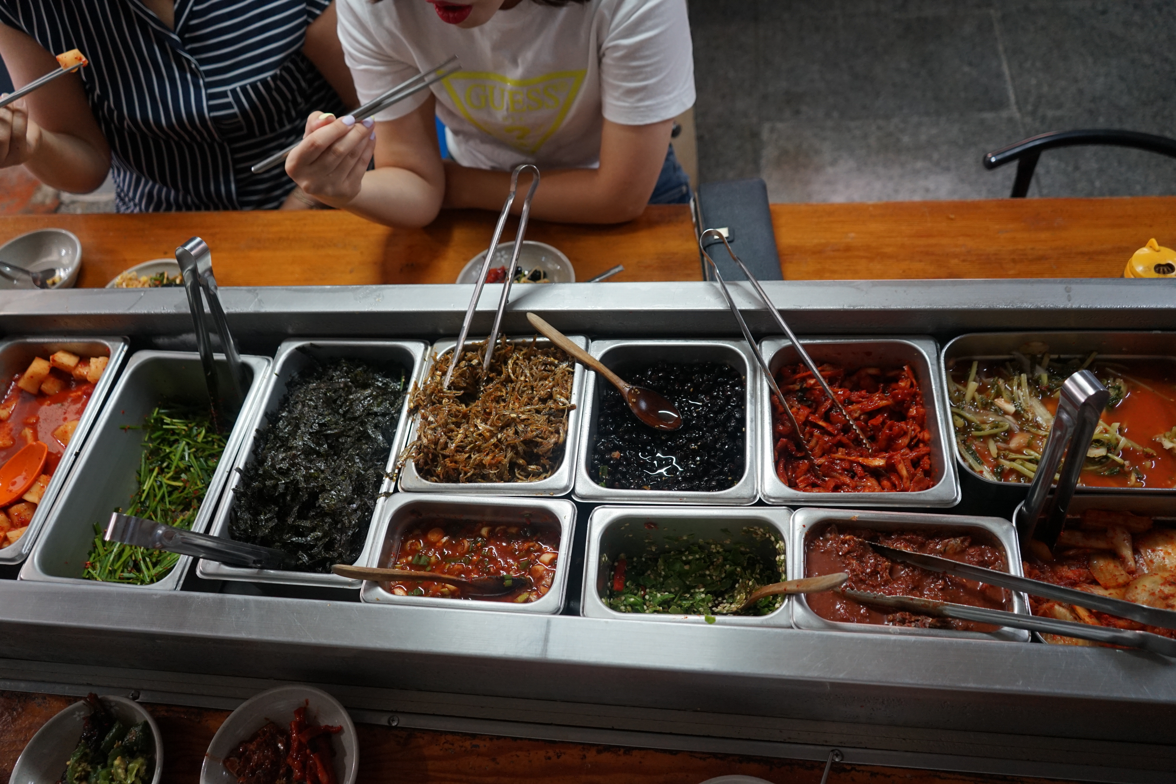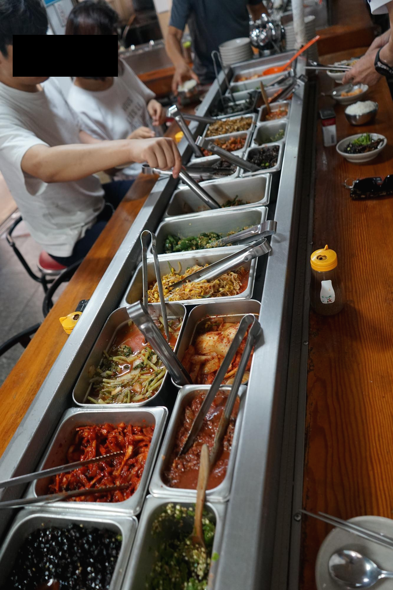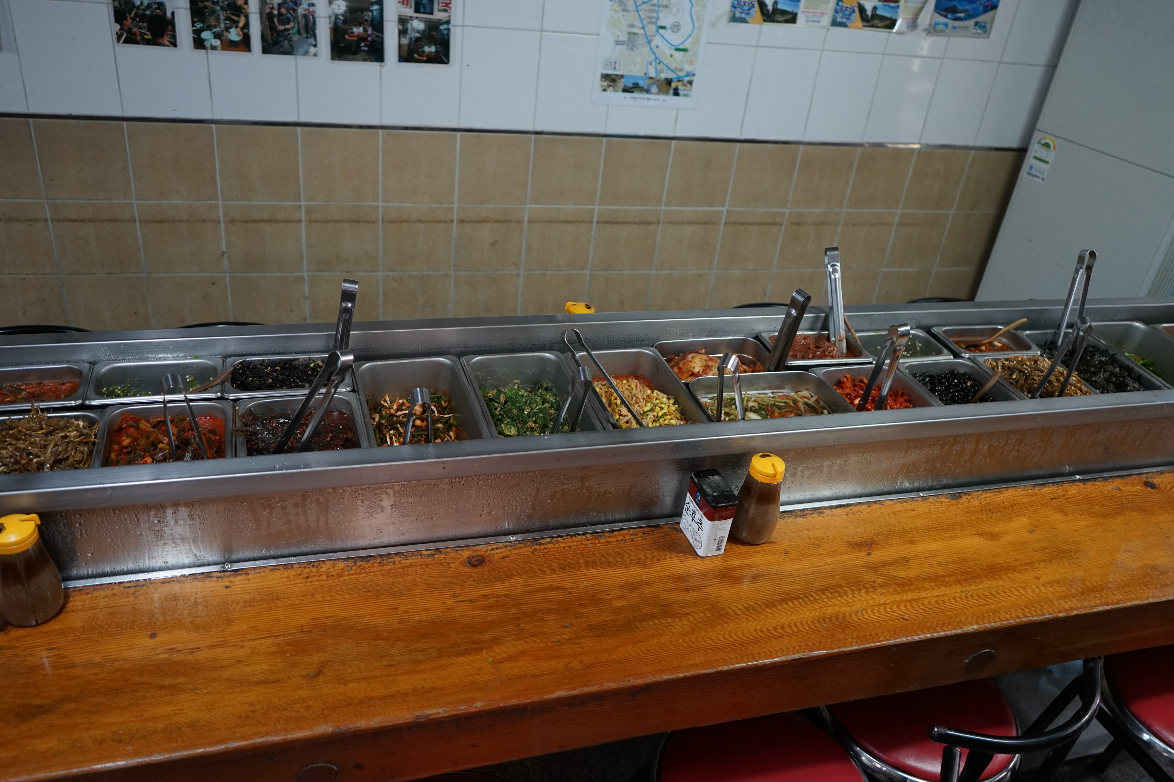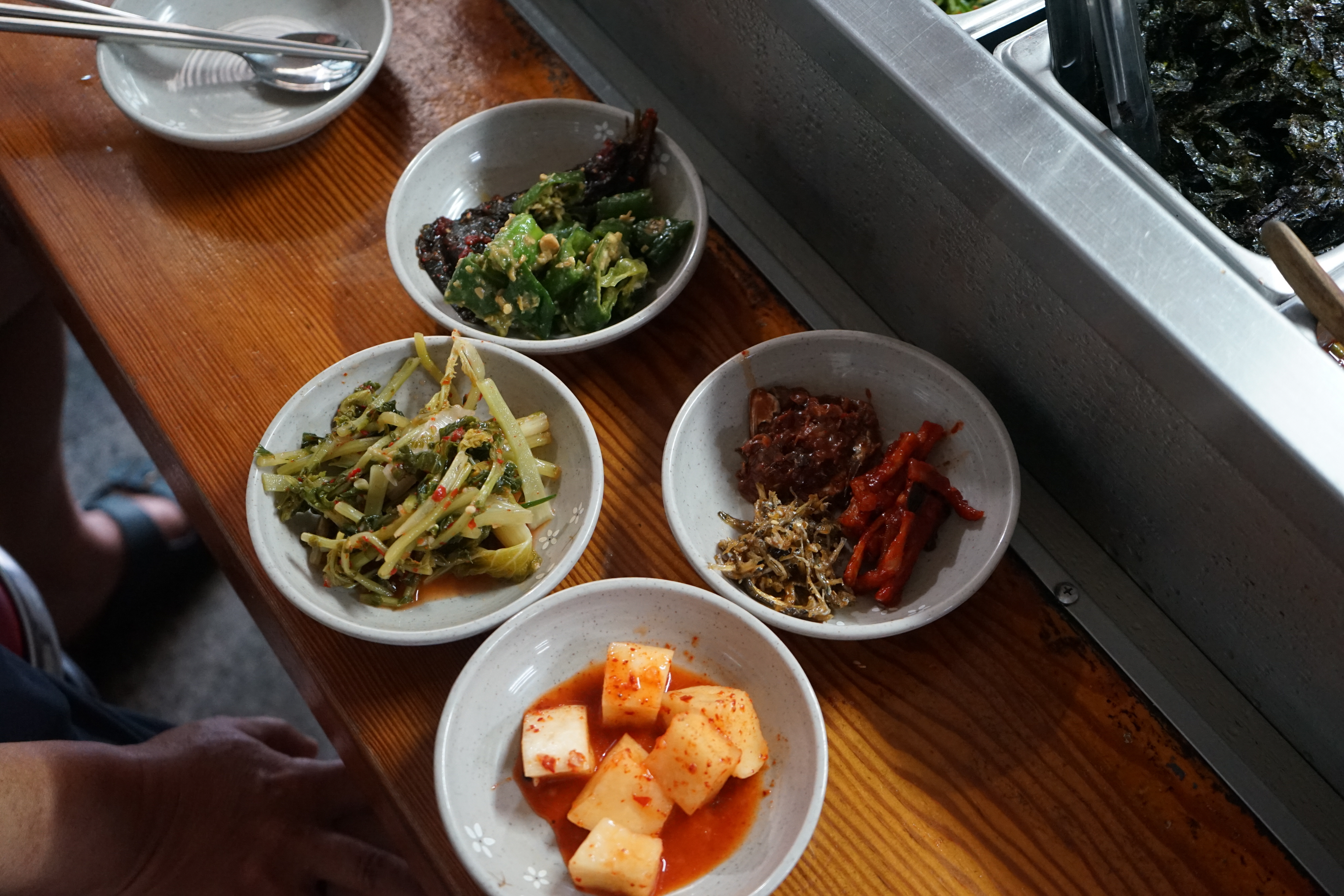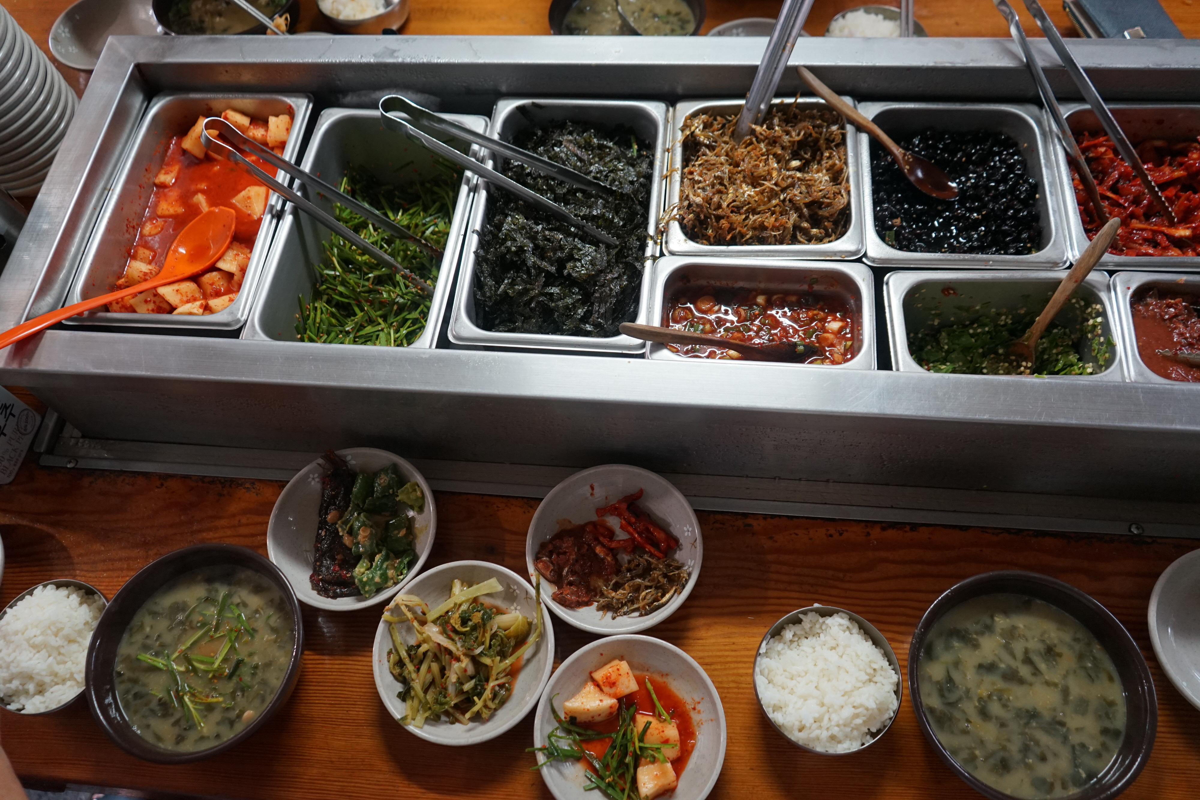앉자마자 앞에 놓인 열 가지 정도의 반찬을 무제한으로 먹을 수 있기 때문이다.