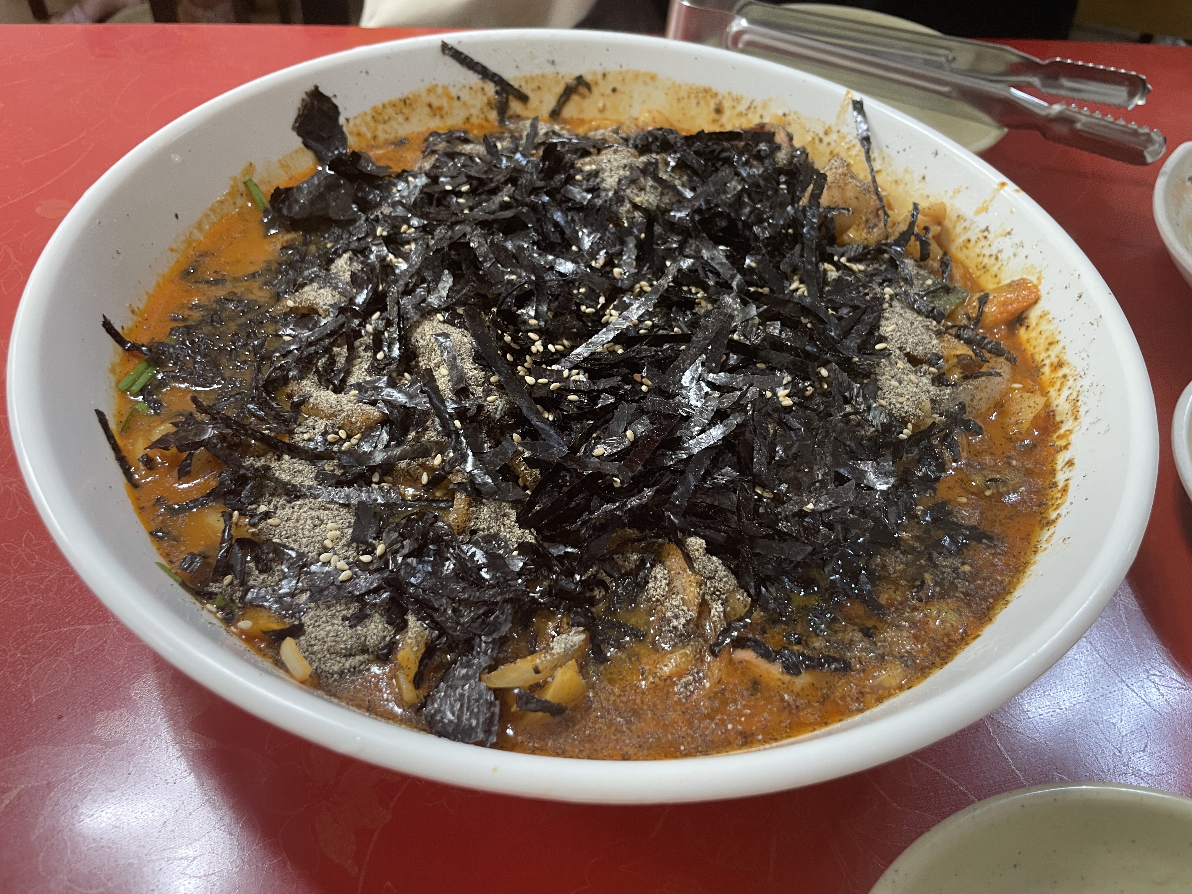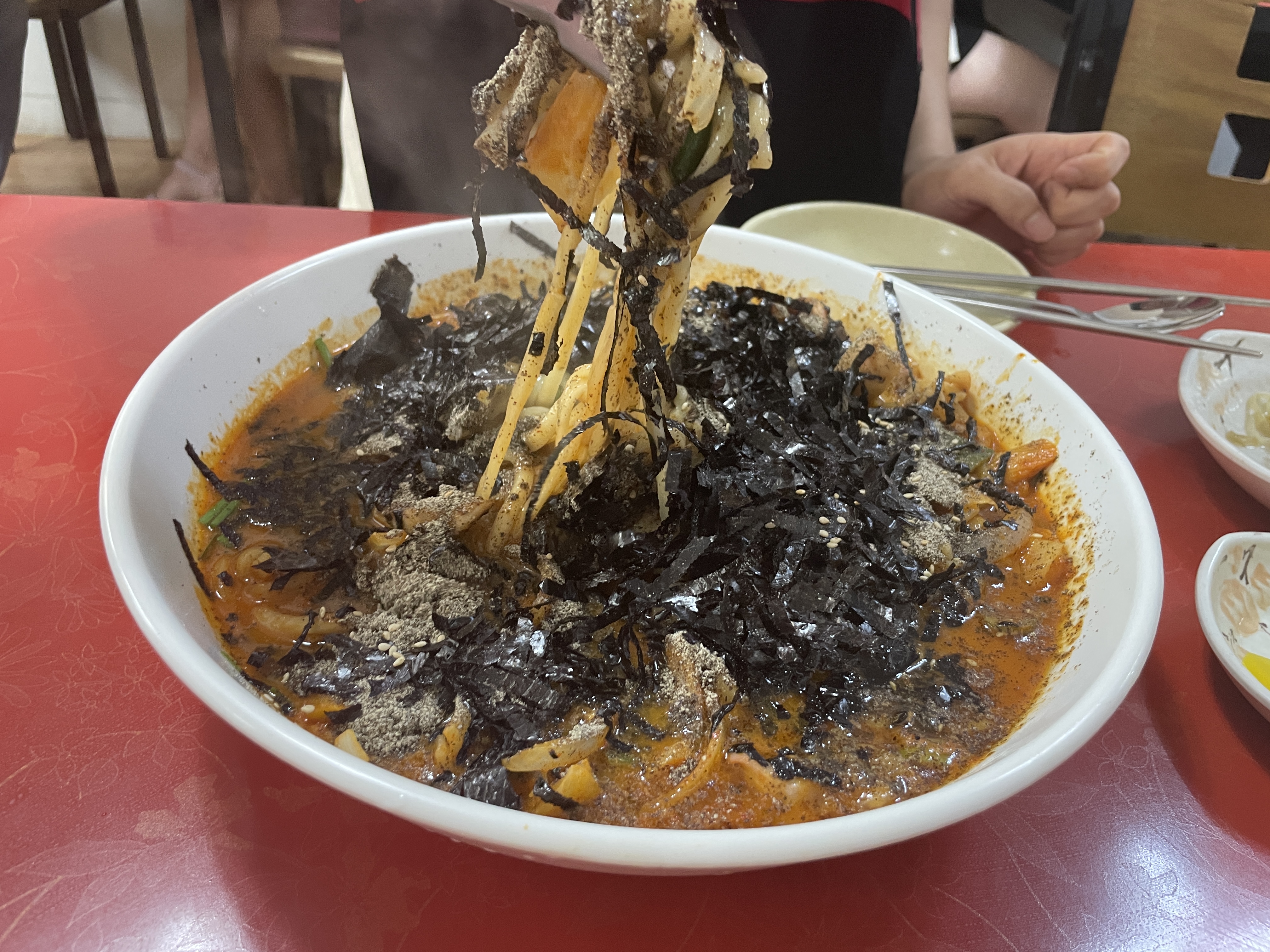 👉 들깨가루와 김가루가 듬뿍 올라간 진한 국물, 쫄깃한 오징어가 가득하다. 일반적인 칼국수와 달리 깊고 고소한 맛이 특징이다.