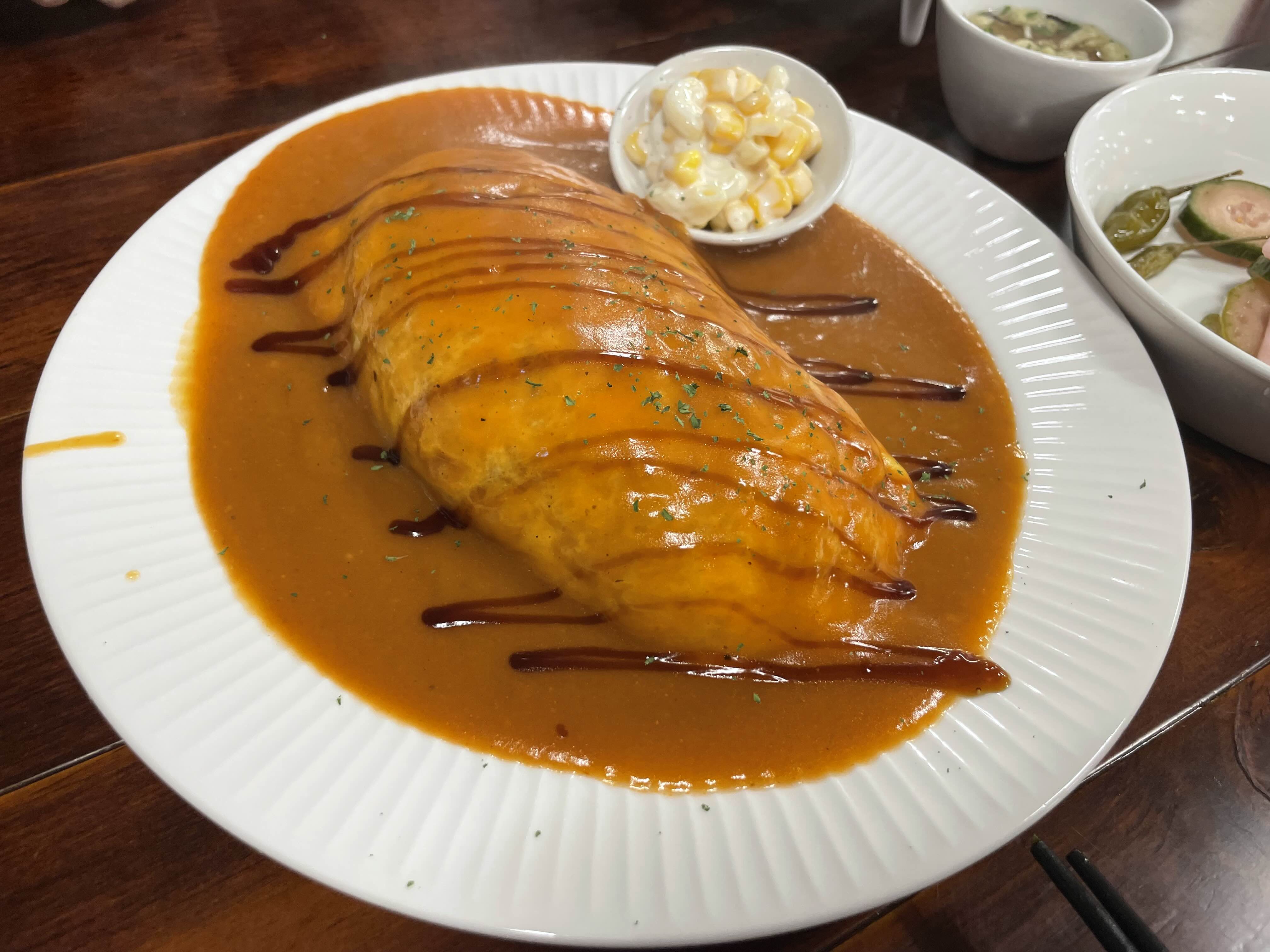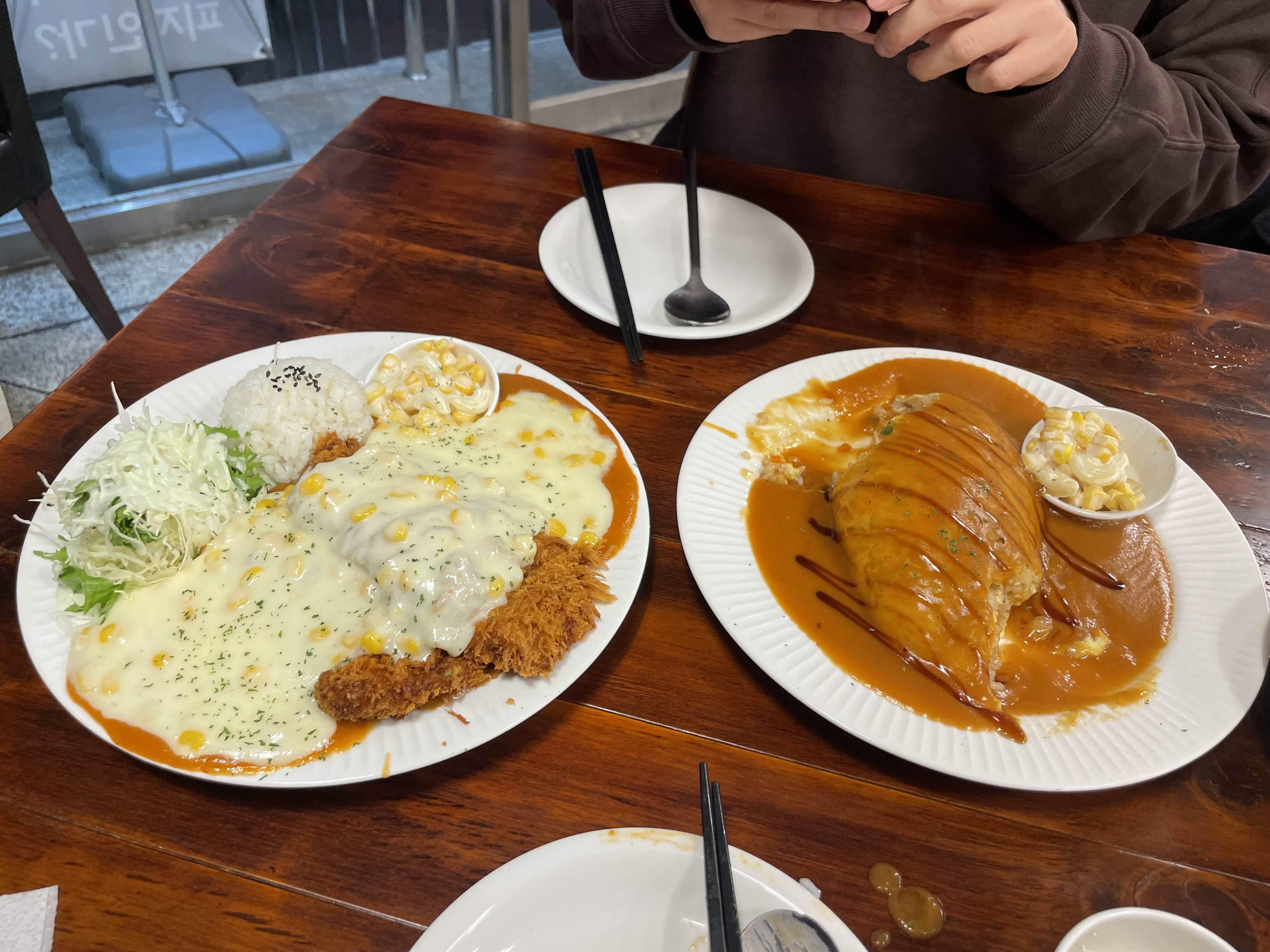 우리는 데미그라스 오믈렛 라이스와 콘치즈돈가스를 시켰다. 오믈렛 라이스라서 뭔가 볶음밥 위에 오믈렛이 올라가 있는 건가 생각했는데 그냥 평범한 오므라이스였다.