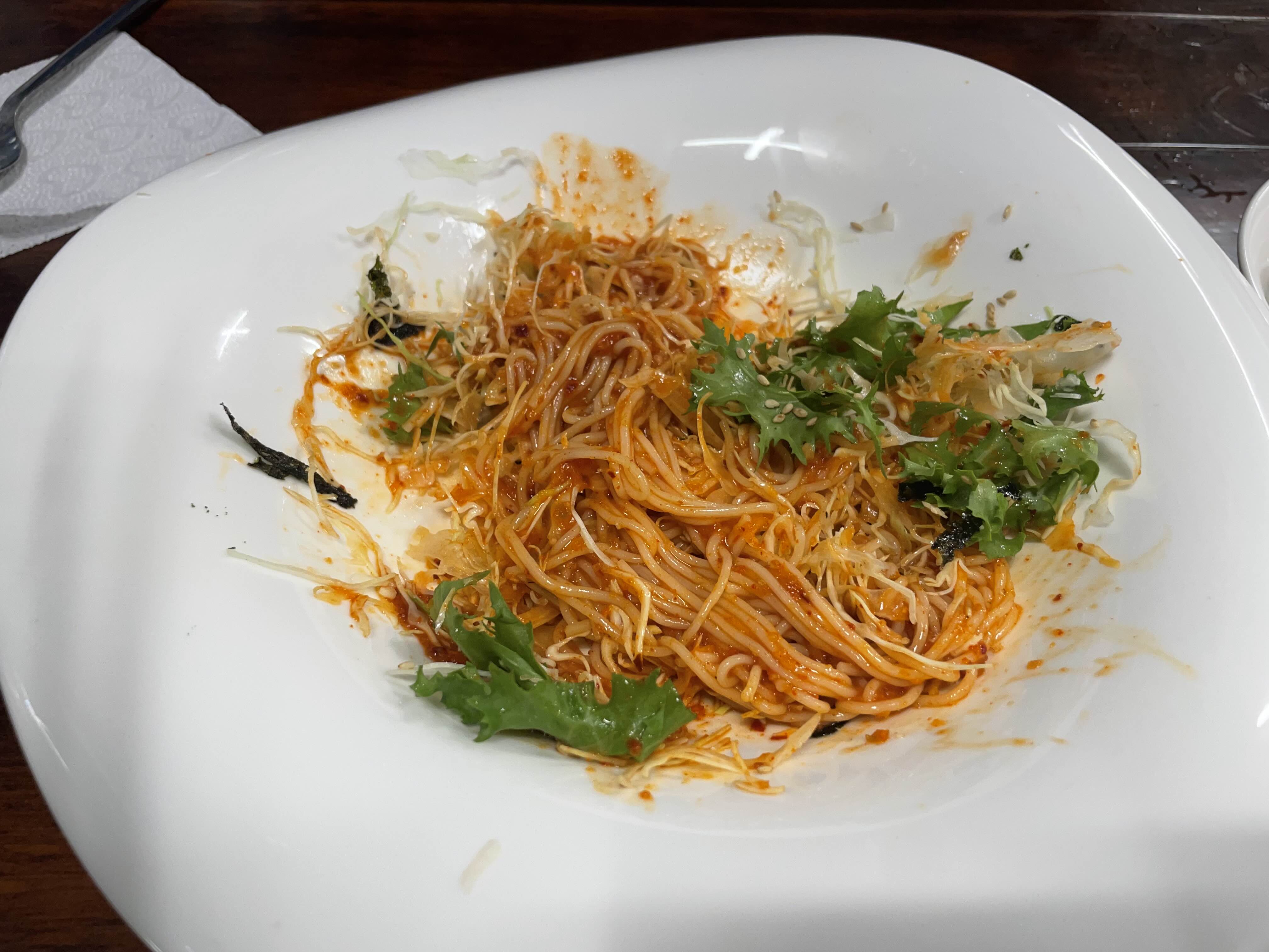 처음에는 뇌물이라고 적힌 비빔국수를 한접시 주신다. 맛만 보아야 하는 양이지만 그래도 식전에 입가심하기 좋았다.