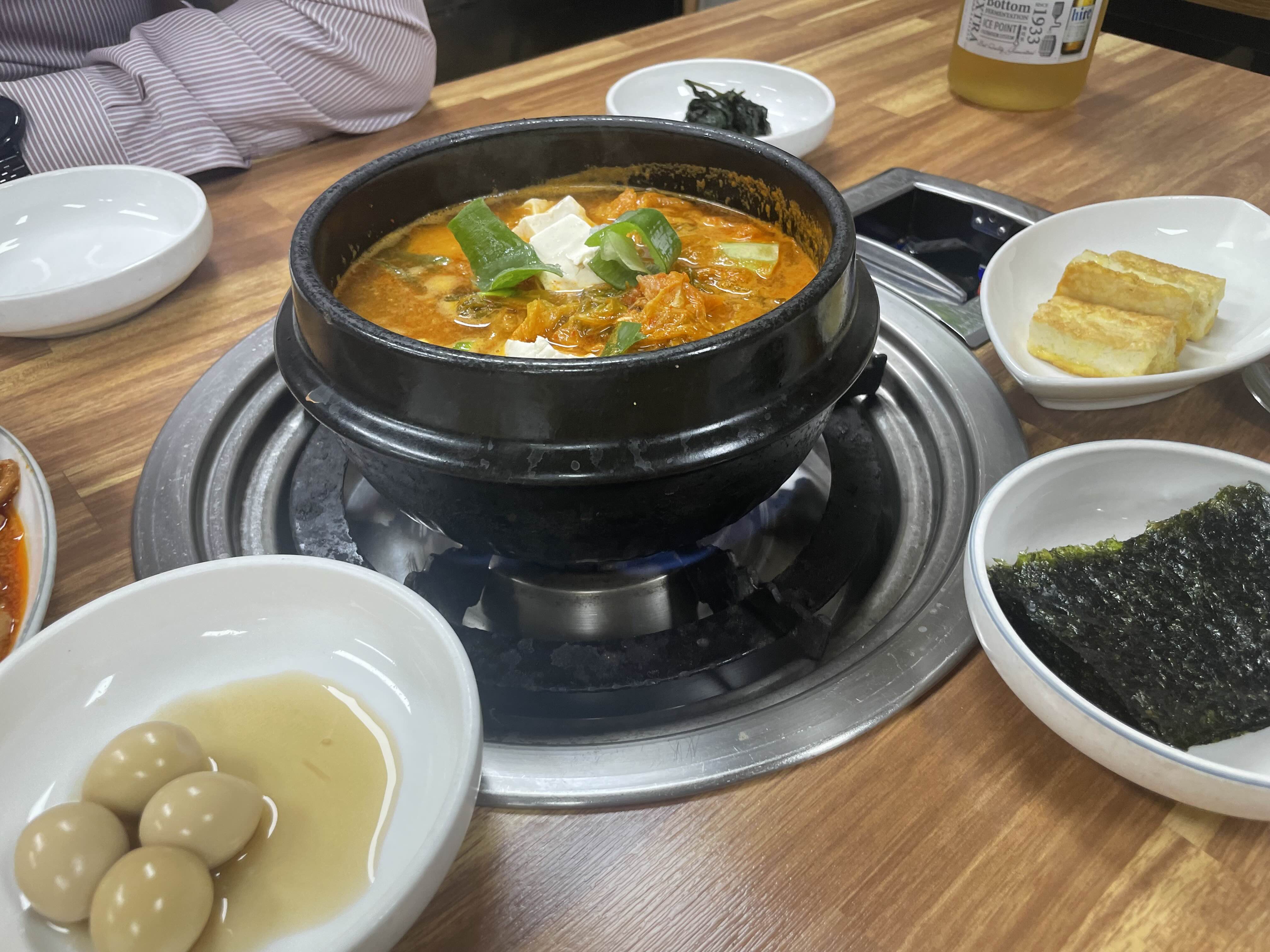 이날의 메인, 김치찌개가 등장했어요! 얼큰하면서도 깊은 맛이 나는 국물, 안에 두부와 김치, 고기까지 들어가 있어 한 끼 식사로 손색없는 구성이었어요. 끓이면서 더 진한 풍미가 올라와서 밥 비벼먹기 딱 좋더라고요. 예전에 왔을 땐 청국장이 나왔었는데, 그때도 정말 구수하고 맛있었어요. 이렇게 매번 다른 메뉴가 나와서 갈 때마다 기대돼요.