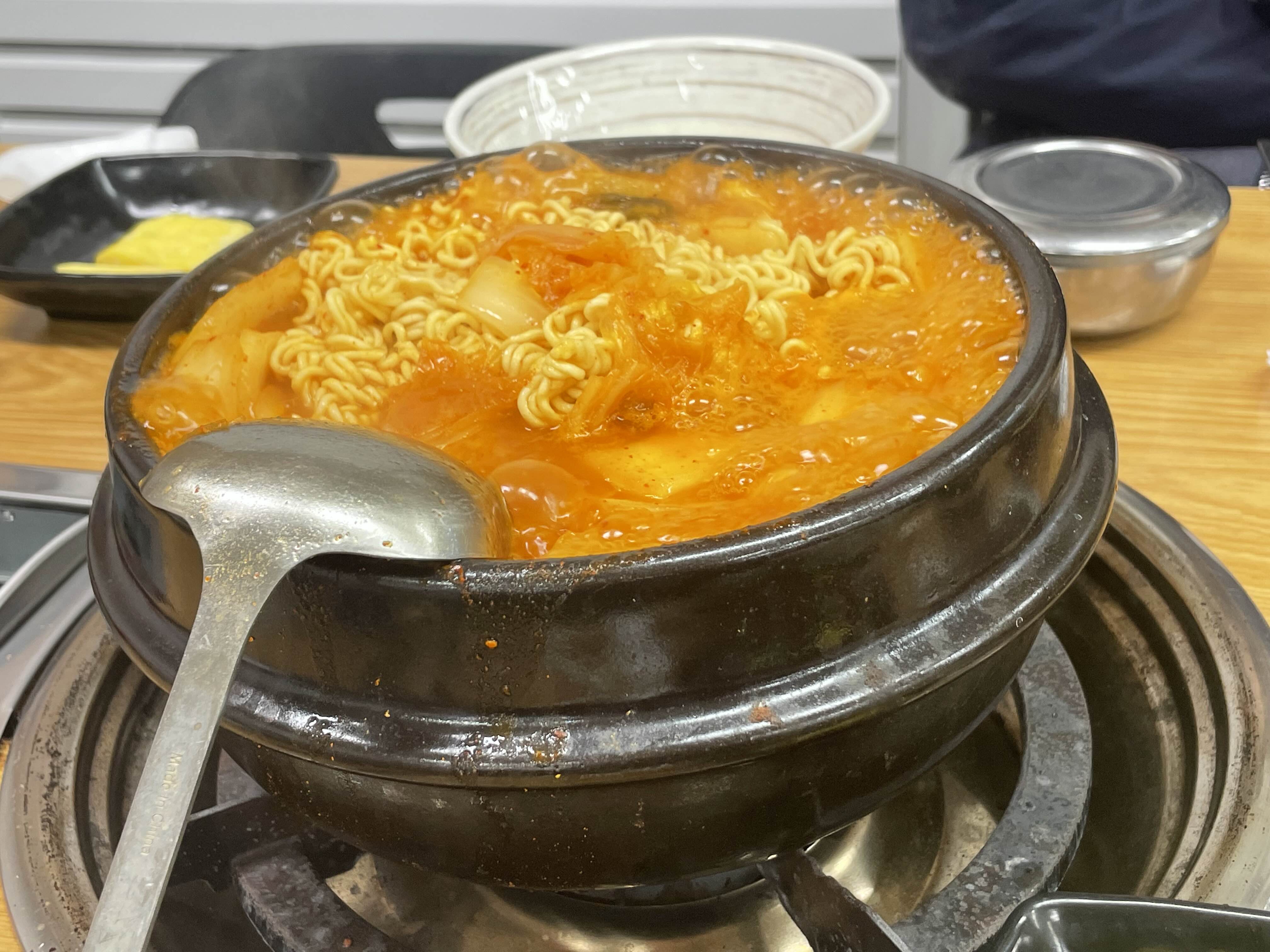 쌈쌈대패의 하이라이트! 라면사리 무제한 제공입니다. 처음엔 한 개 넣고, 국물이 진해지니까 결국 두 번째 라면사리까지 투하! 진한 김치찌개 국물에 라면사리까지 더해지면 정말 별미예요. 대전정부청사 근처 직장인 점심 메뉴 중 이렇게 배부르고 만족도 높은 김치찌개는 흔치 않습니다.