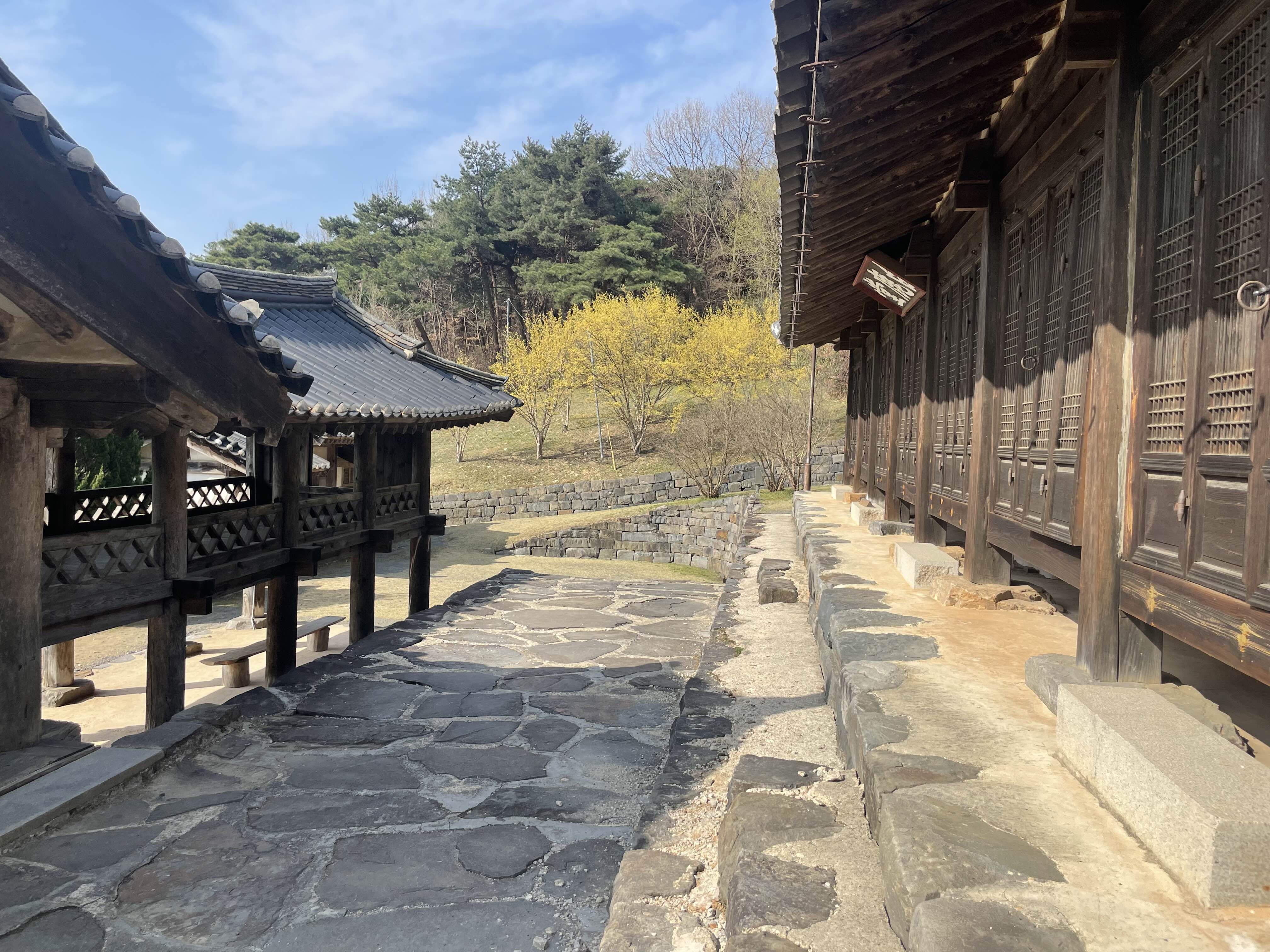 종학당 본채와 연결된 길목에는 정갈하게 정비된 돌길이어집니다. 사진 속 노란 산수유와 고풍스러운 기와지붕이 조화를 이루며 고요한 정취를 더합니다. 이 길을 따라 걷다 보면 자연스레 마음이 차분해지고, 봄의 기운을 오롯이 온몸으로 느낄 수 있습니다.
