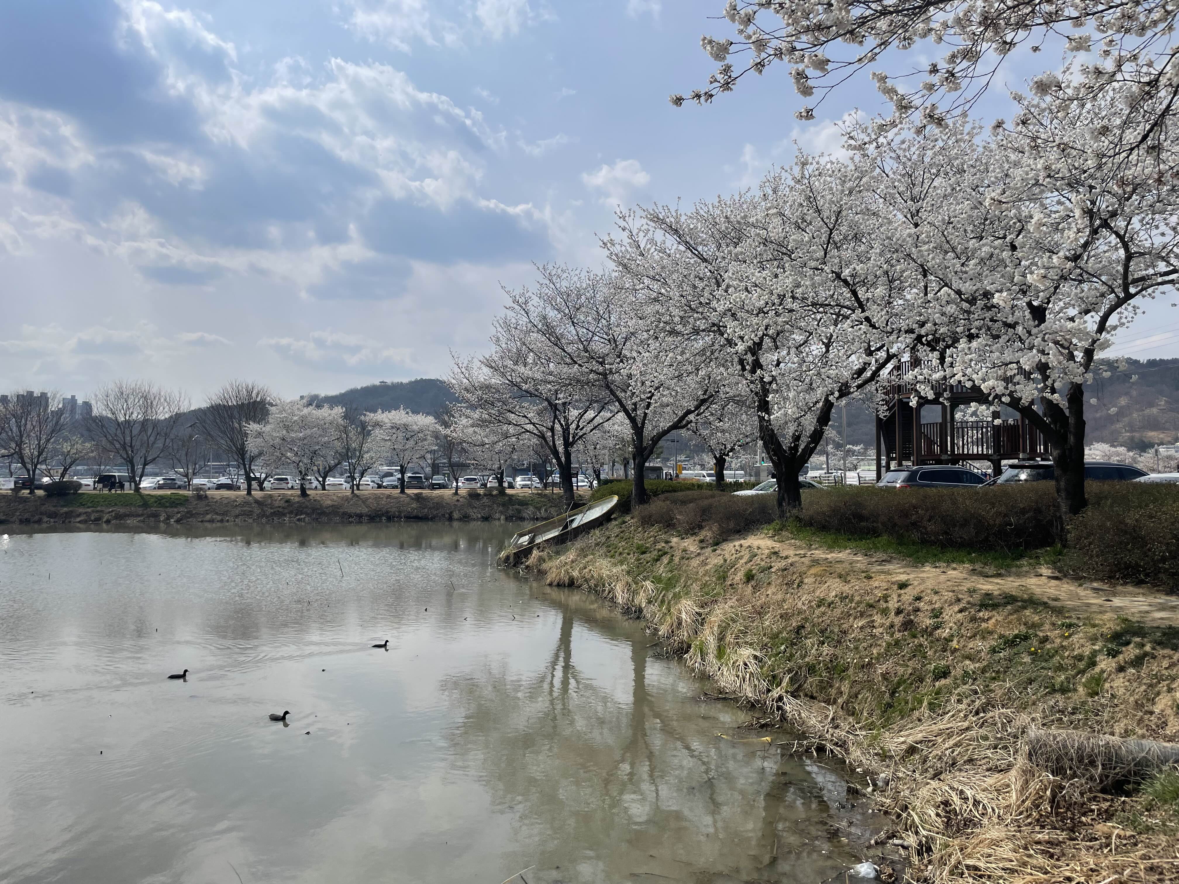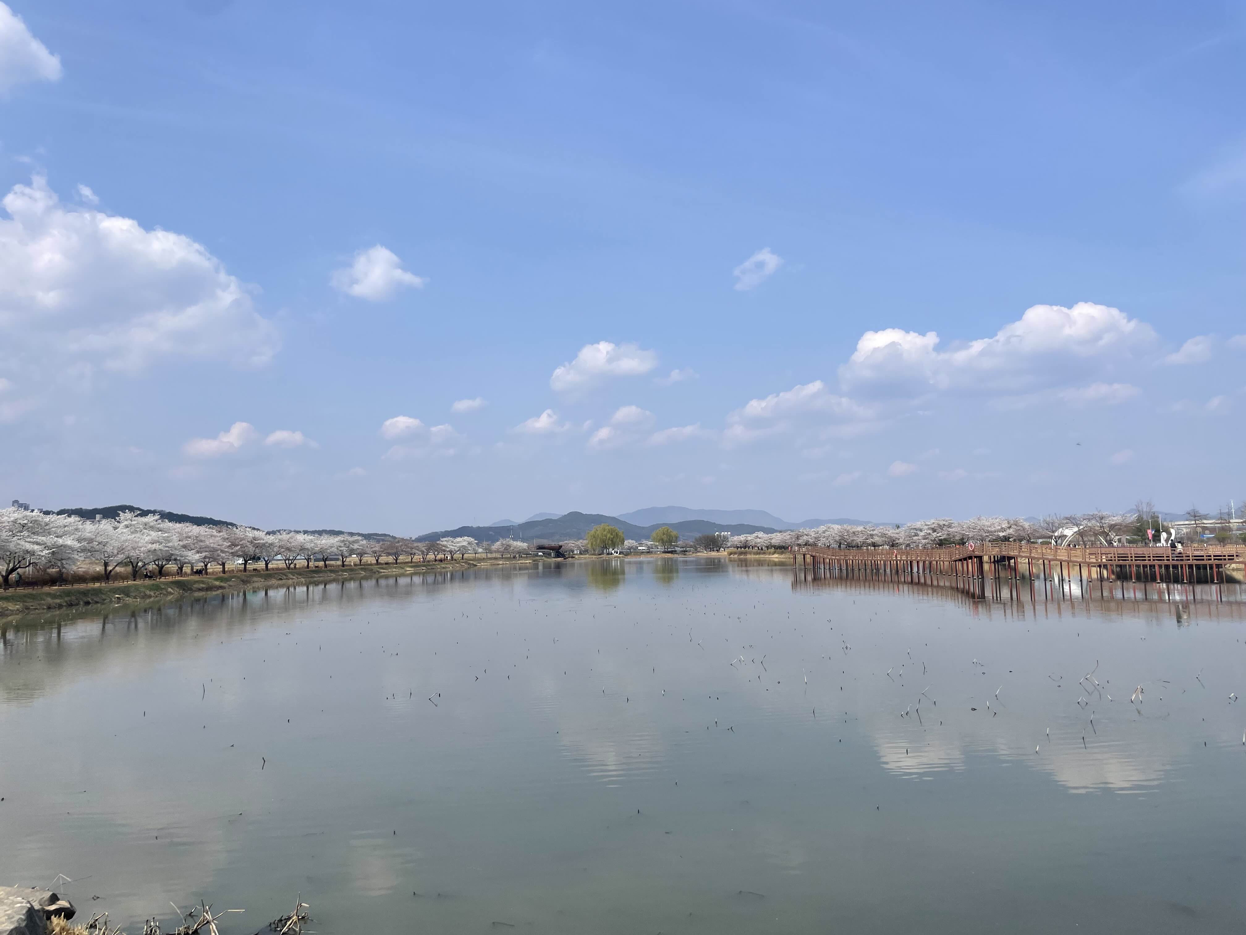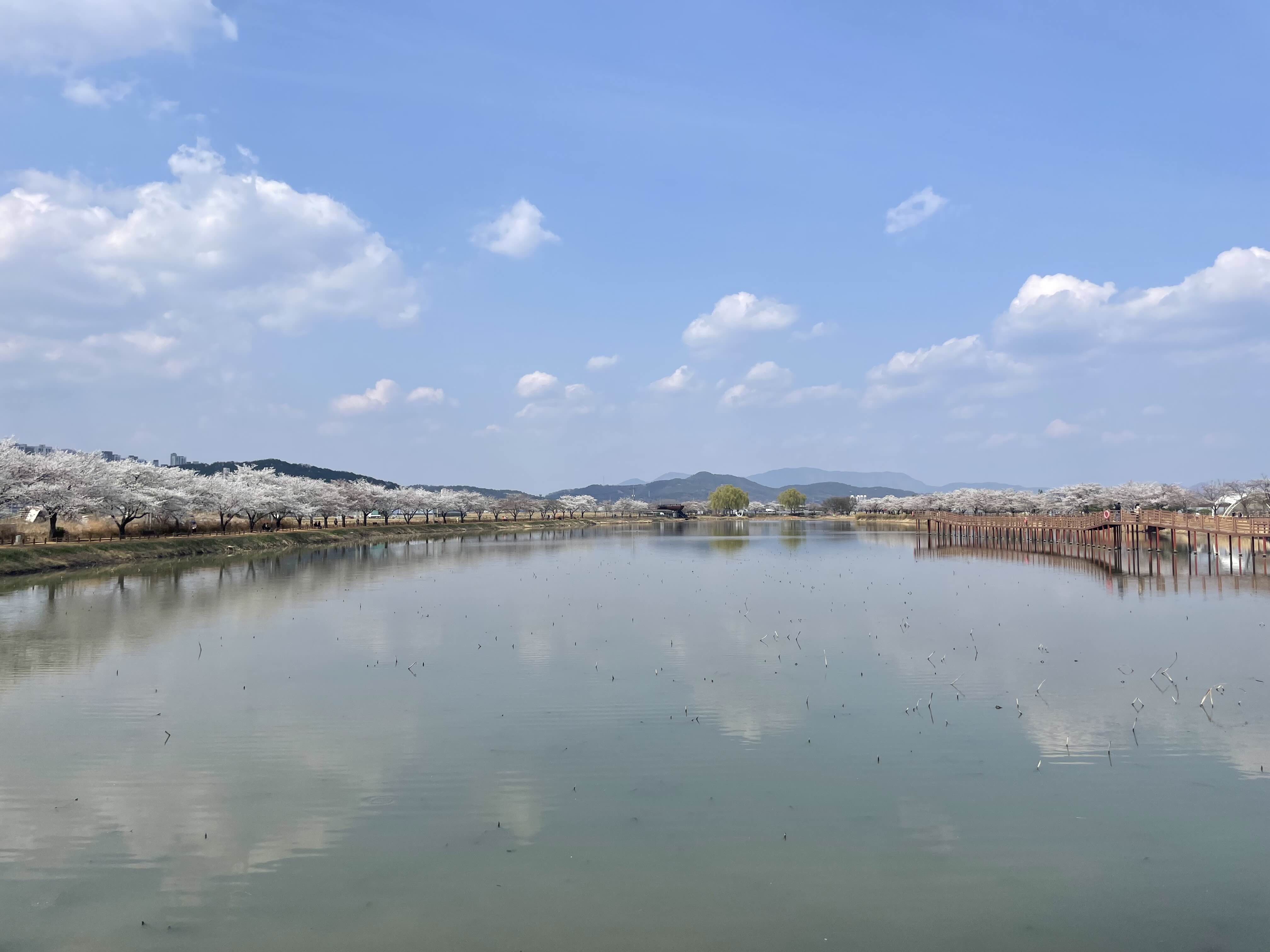 조금 더 안쪽으로 들어오면 넓게 펼쳐진 연못과 그 뒤를 배경으로 한 벚꽃 군락이 눈에 들어옵니다. 수면 위로 비치는 벚꽃과 구름, 파란 하늘이 어우러져 마치 한 폭의 풍경화 같았어요.