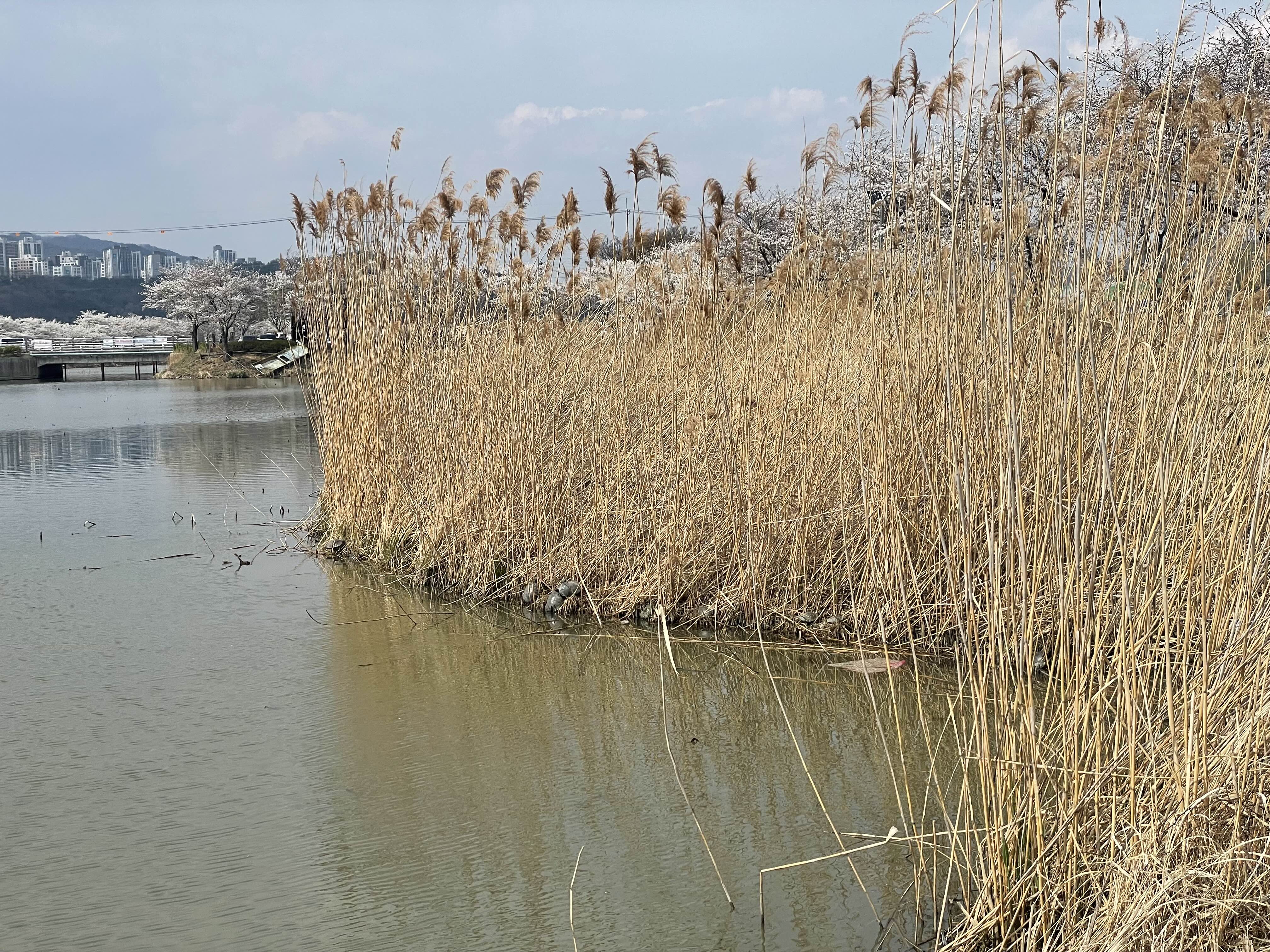 한쪽으로는 아직도 겨울을 닮은 억새풀이 길게 자라 있는데, 그 사이로 고개 내민 벚꽃이 색다른 분위기를 자아냅니다. 정형화된 벚꽃 풍경이 아닌, 자연 그대로의 느낌을 담은 이 장면이 특히 인상 깊었어요.