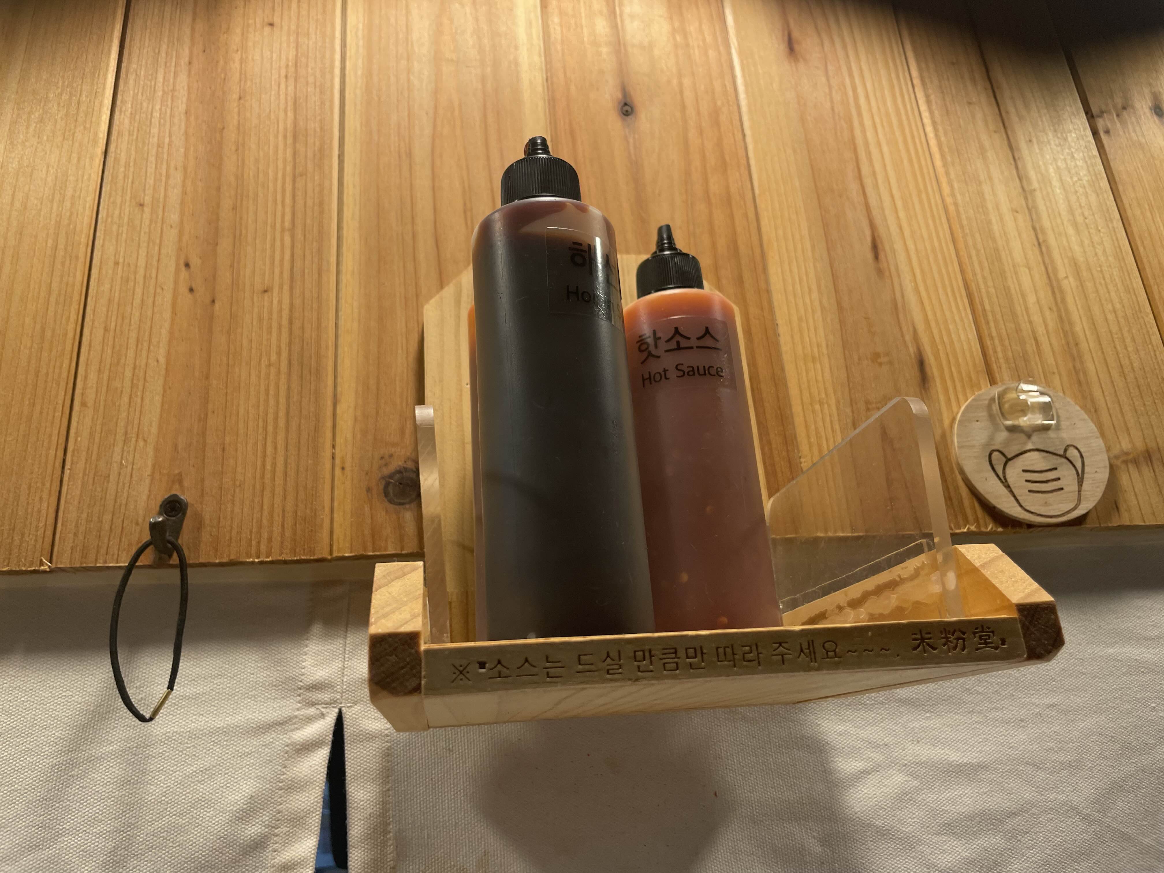 테이블 한쪽엔 ‘핫소스’와 ‘해선장소스’가 비치되어 있어 취향에 맞게 조절 가능합니다. 특히 해선장소스는 깊고 짭짤하면서도 향신료 맛이 은은해 쌀국수 국물 맛을 한층 풍성하게 만들어줘요.