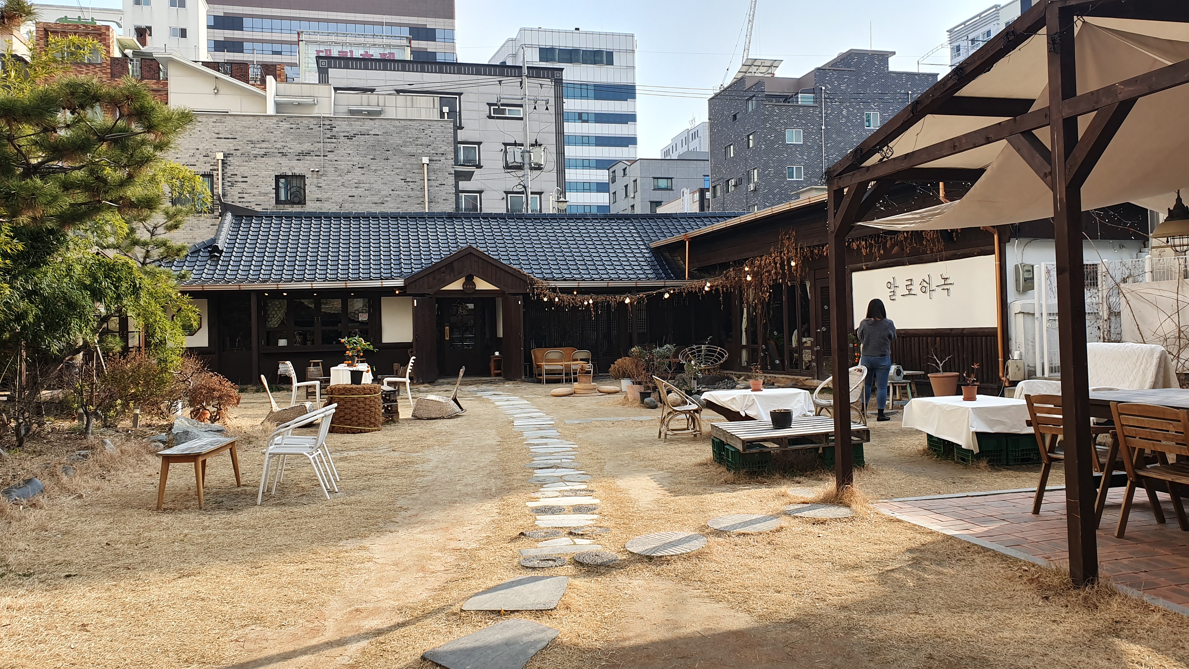 군데 군데 야외 테이블들이 놓여 있다.