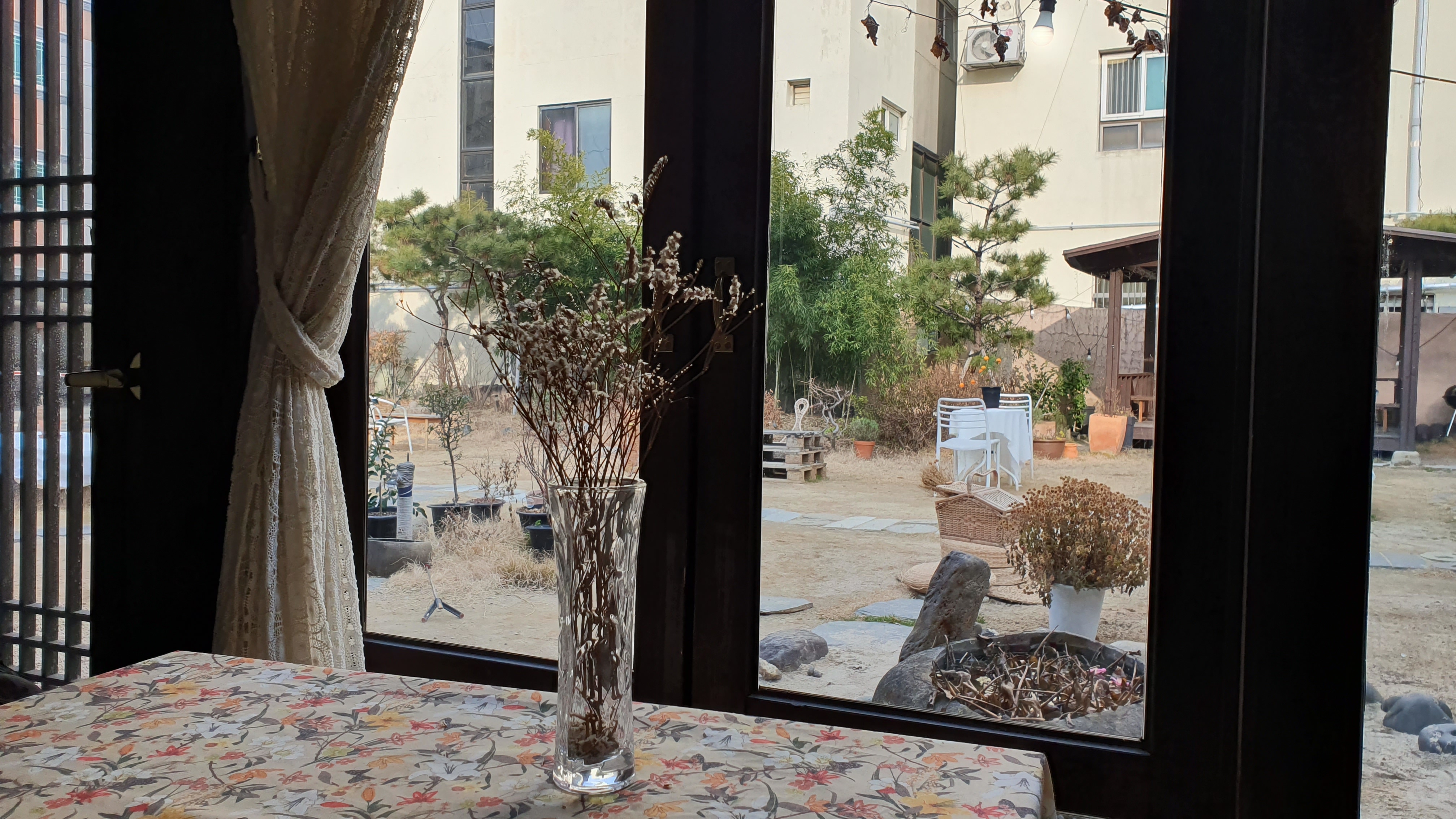 마당이 보이고 테이블 보가 예쁜 자리여서 기분이 좋았다.