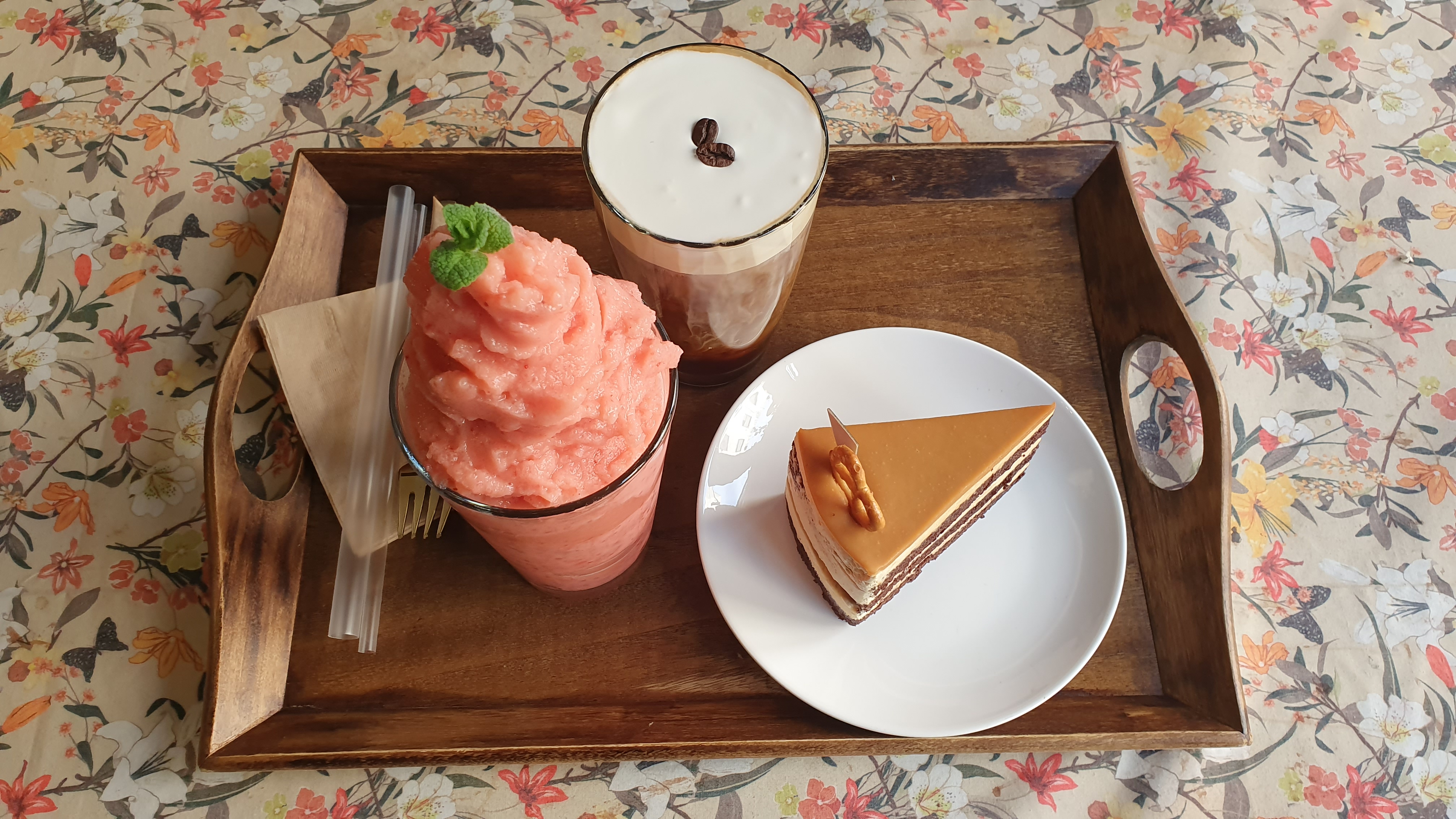 딸기 요거트 스무디와 카라멜 쇼콜라 케이크는